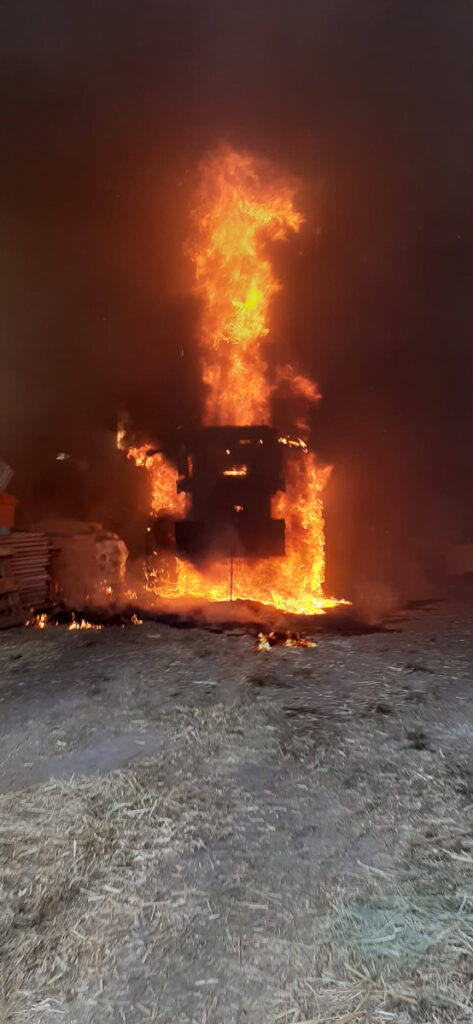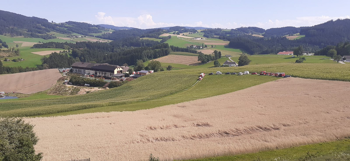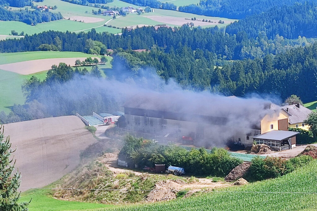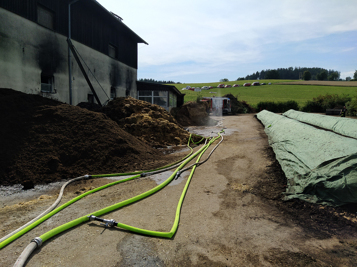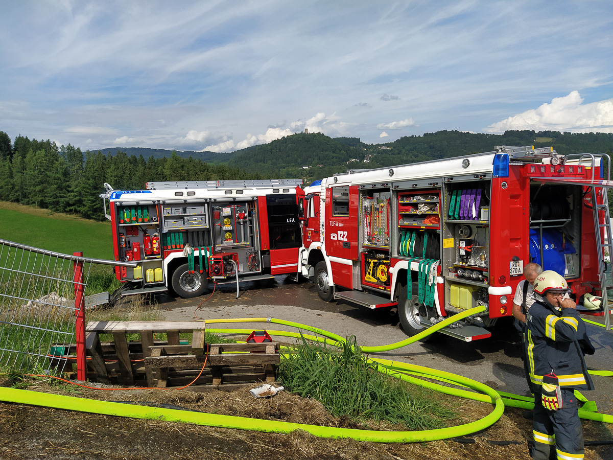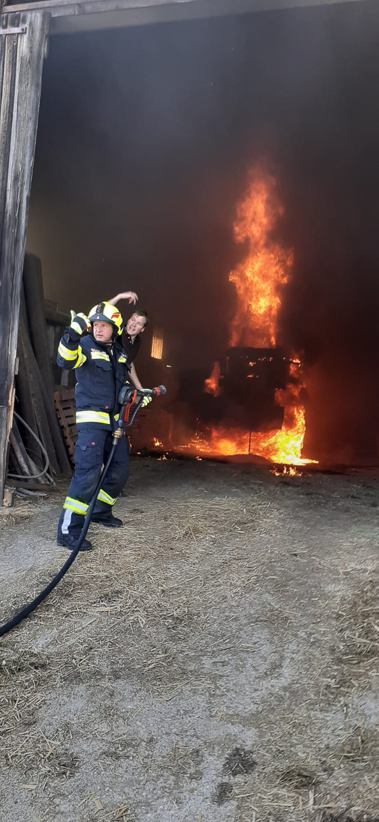 Aus bisher unbekannten Ursachen fing ein Radlader am Heuboden des Bauerhofes Feuer. Die Nachbarn bemerkten die Rauchschwaden und alarmierten die Feuerwehr und die Hausbesitzer.