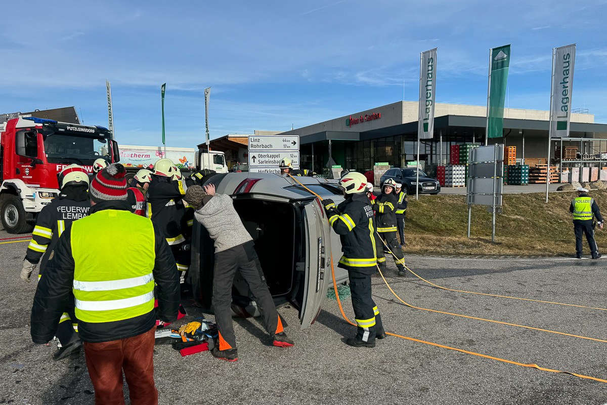 Zwei Lenker waren im Kreuzungsbereich kollidiert. Ein Fahrzeug kam dadurch auf der Seite zum liegen, wodurch sich der Lenker nicht selbst aus seiner Lage befreien konnte. Umgehend wurde die vielbefahrene Straße total gesperrt. Das Fahrzeug wurde mit Unterstützung der FF Lembach wieder vorsichtig auf die Räder gestellt und der Lenker konnte selbstständig aus dem Fahrzeug aussteigen.