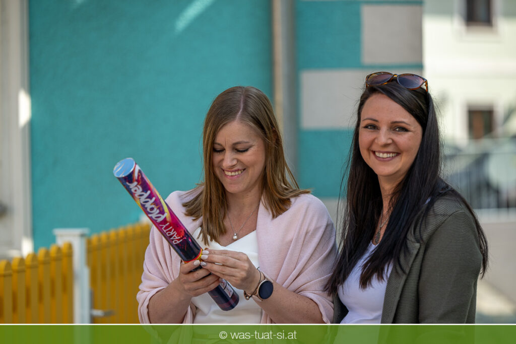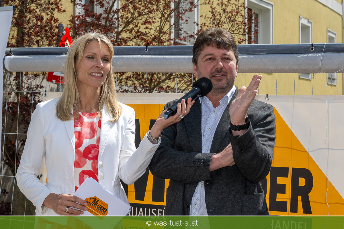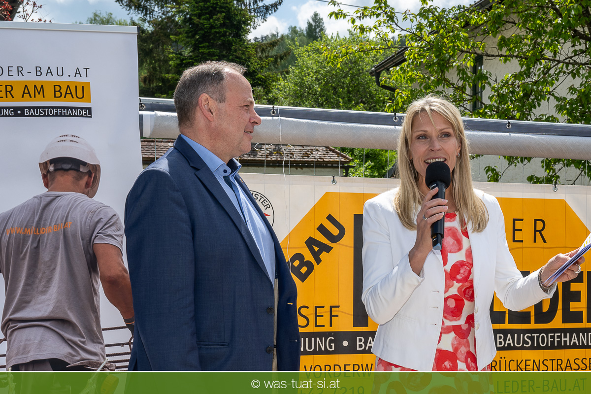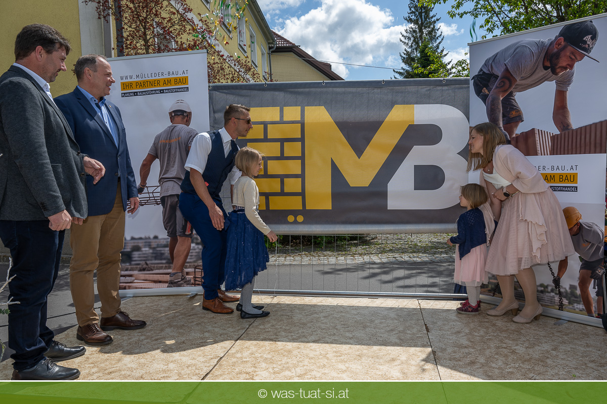 Beim Festakt „besiegelten“ die beiden den Generationenwechsel: Nach 25 Jahren an der Spitze des Bauunternehmens übergab Josef Mülleder die Führung an seinen Nachfolger Baumeister Martin Mülleder. Dieser nützte die Gelegenheit für eine erste öffentliche „Amtshandlung“ in Form einer Logopräsentation – das neue Design wurde dem Publikum mit kräftigem Applaus vorgestellt.