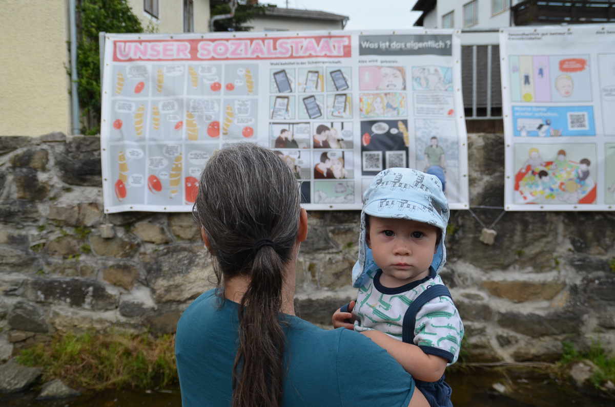 In plakativer Art und Weise sollen die tragenden Elemente des Sozialstaats und die solidarische Leistung, die dahintersteckt, der Bevölkerung nahegebracht werden. Für die Gestaltung konnte der Gallneukirchner Künstler Christoph Raffetseder gewonnen werden, dessen Motivation, sich dafür einzusetzen, klar ist: „Der Sozialstaat ist für alle da!“ Er wählte die Kunstform Comic, um das Leben von Alex unter dem Schutzschirm des Sozialstaats von ihrer Geburt bis zum Lebensende darzustellen. Über eingefügte QR-Codes können die Besucher weitere Informationen und Links zu interessanten Seiten abrufen.