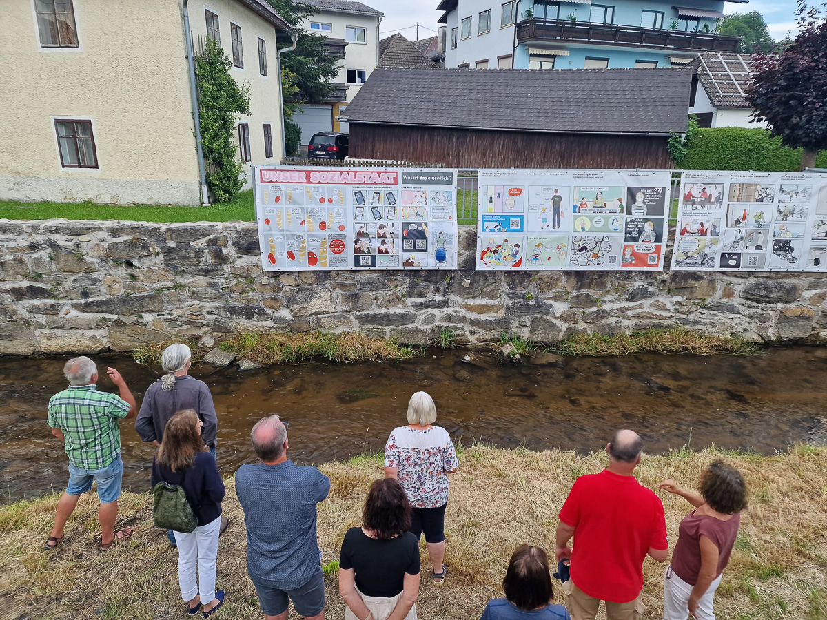Unter großem Publikumsinteresse wurde die Outdoor-Ausstellung „Unser Sozialstaat“ im außergewöhnlichen Freiluft-Ausstellungsgelände im Bachbett der Distl in Zwettl eröffnet. „Wir freuen uns, die von der Bildungsgruppe der SPÖ Gallneukirchen entwickelte Wanderausstellung nach Zwettl bekommen zu haben!“, erklärte der Zwettler SPÖ-Vorsitzende Herbert Enzenhofer bei der Eröffnung.