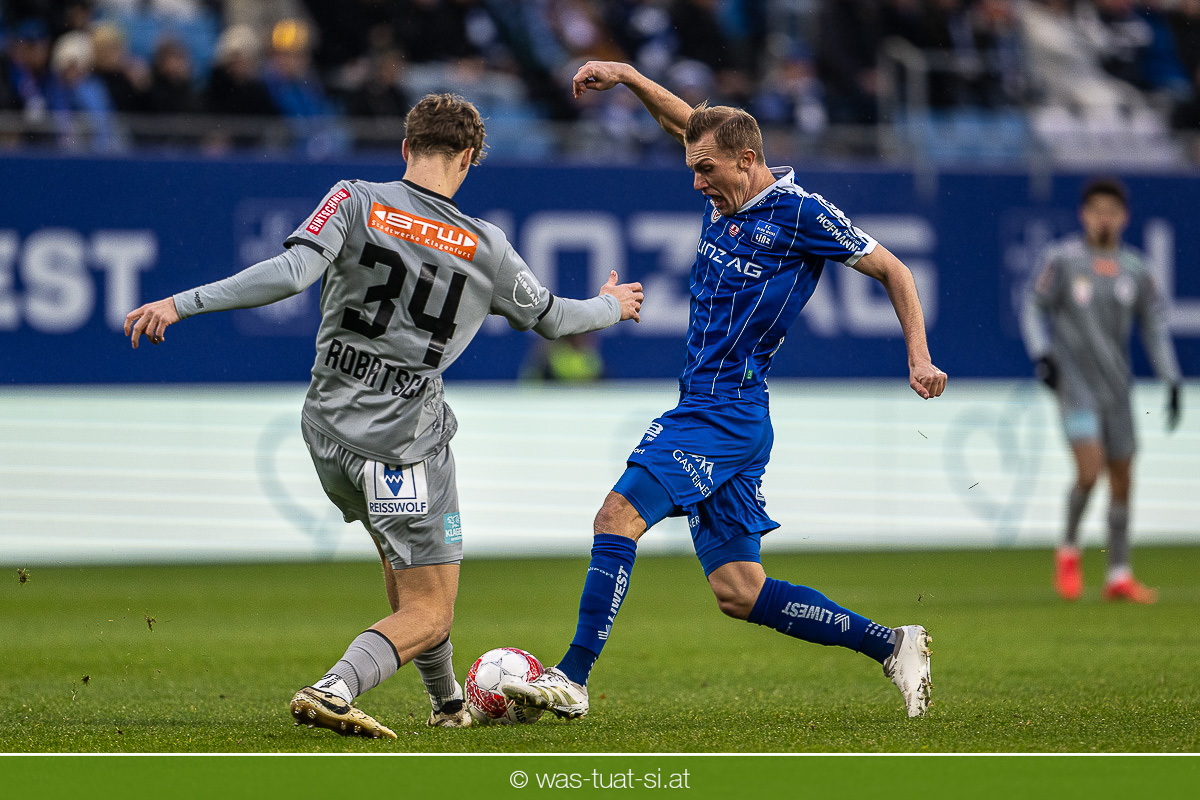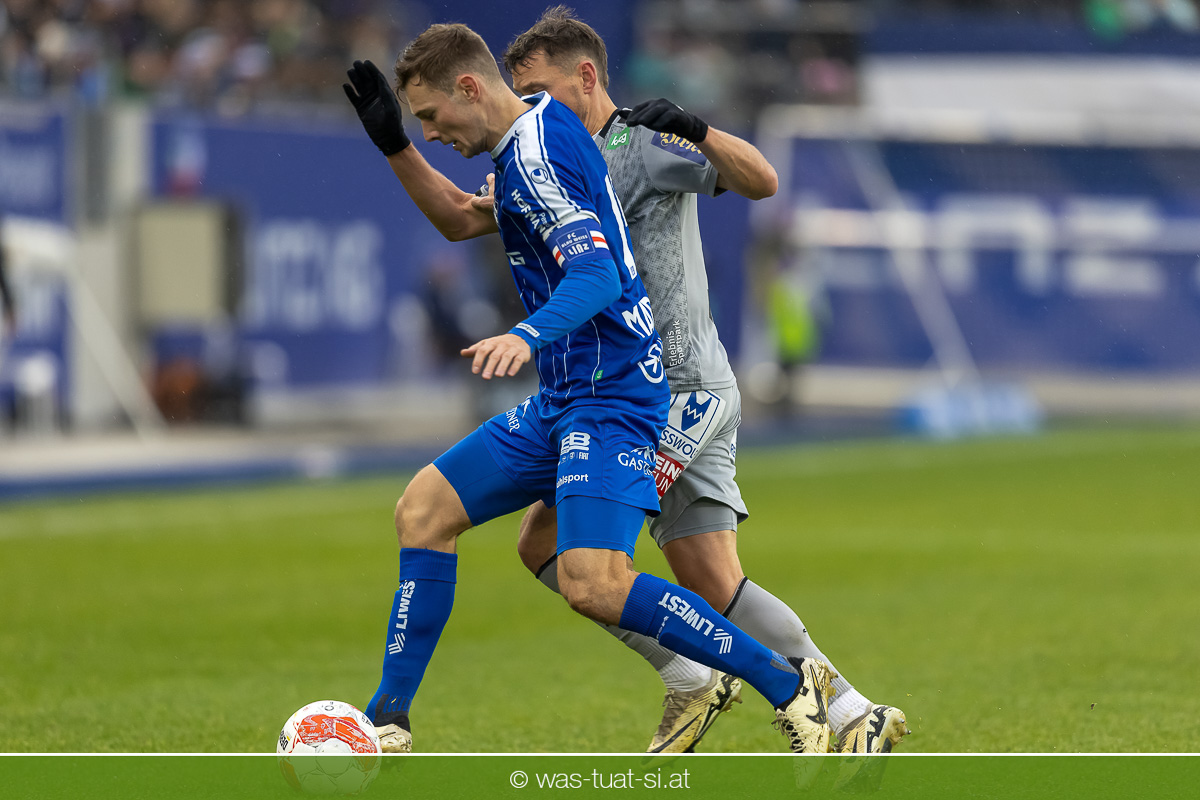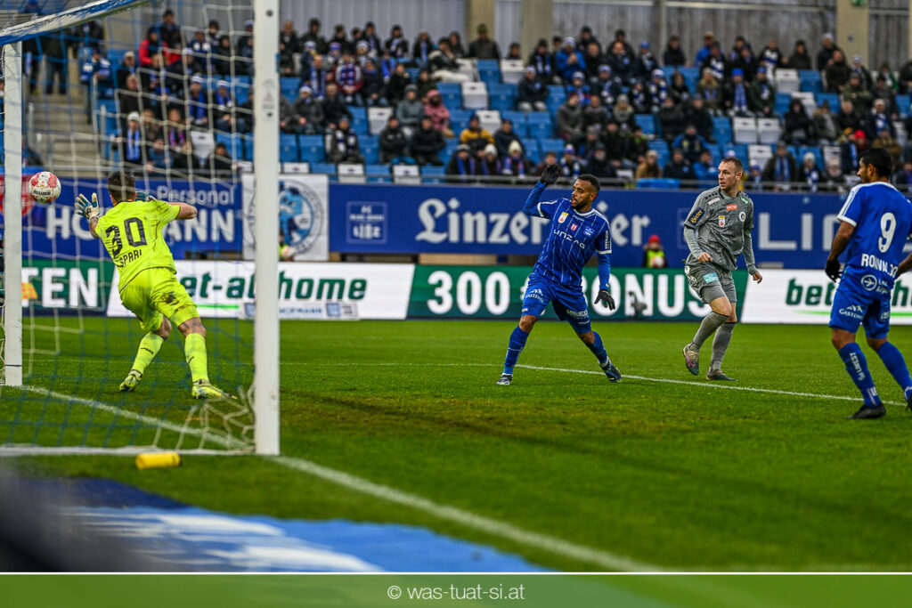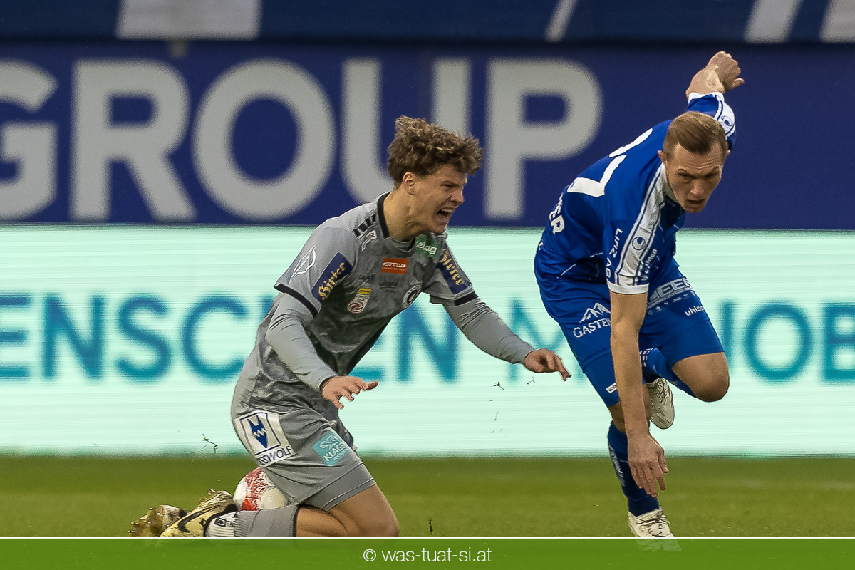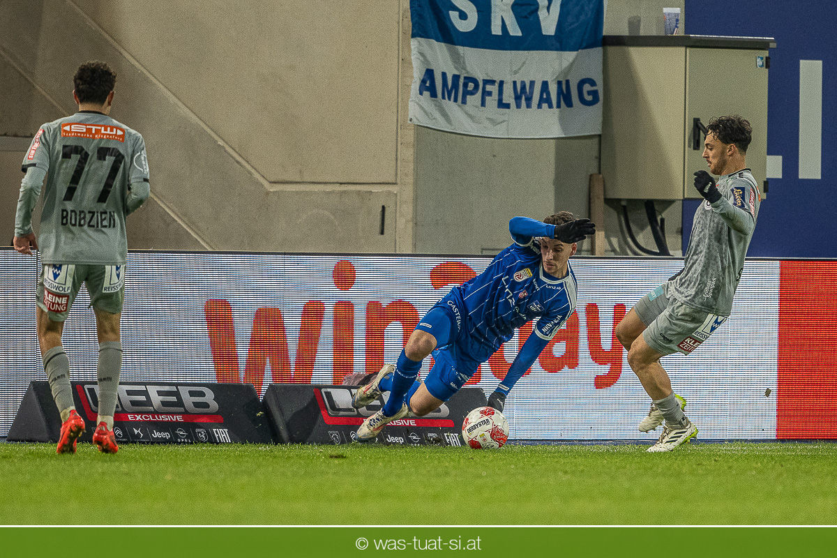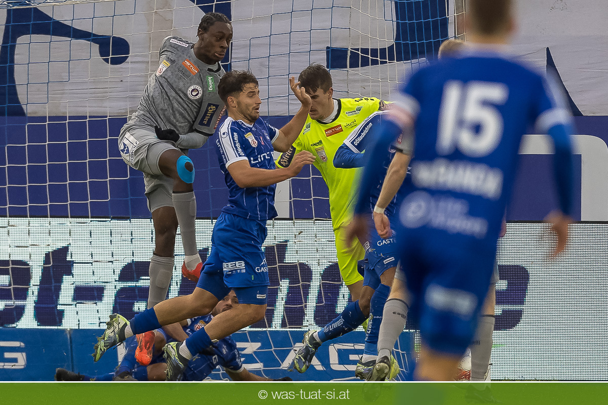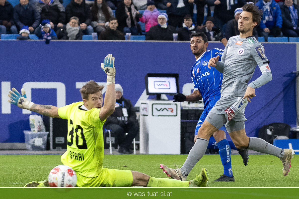 Aufregung dann in der 21. Minute, als Schiedsrichter Jakob Semler auf einmal auf den Punkt zeigte. Alem Pasic kam gegen Bobzien im Strafraum etwas zu spät – ein Elfer war die Folge, der Gefoulte selbst ließ sich nicht zwei Mal bitten und stellte auf 1:0. Schnell aber hatten die Blau-Weißen die Köpfe wieder oben, konnten die Pacult-Elf wieder unter Druck setzen und kamen in der 33. Minute zum Ausgleich über Goiginger. Hatten zumindest die Zuschauer schon geglaubt – doch nach langem VAR-Check wurde der Treffer wegen eines vermeintlichen Foulspiels von Ronivaldo an Keeper Spari zurückgenommen – eine sehr harte Entscheidung.