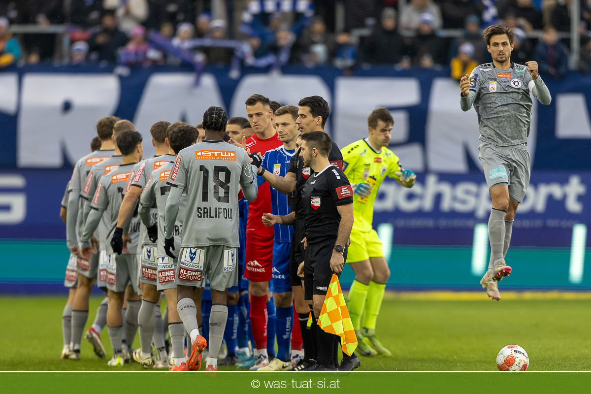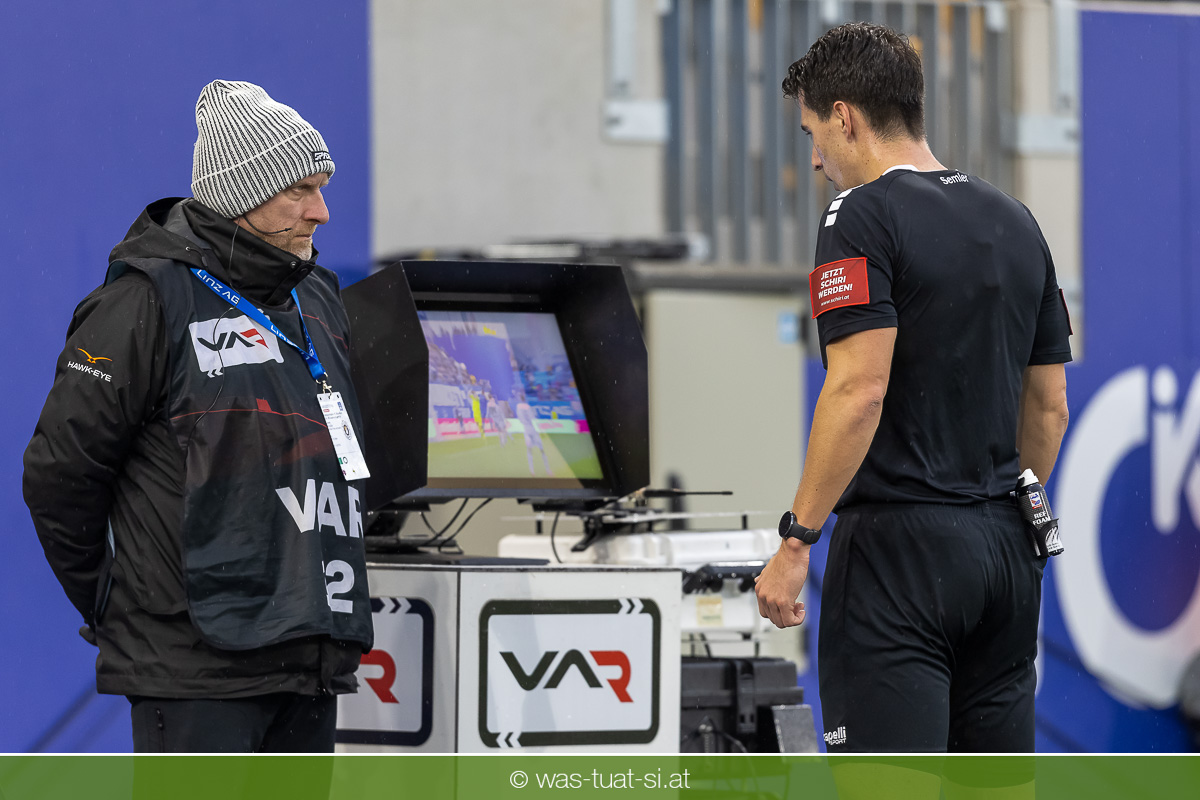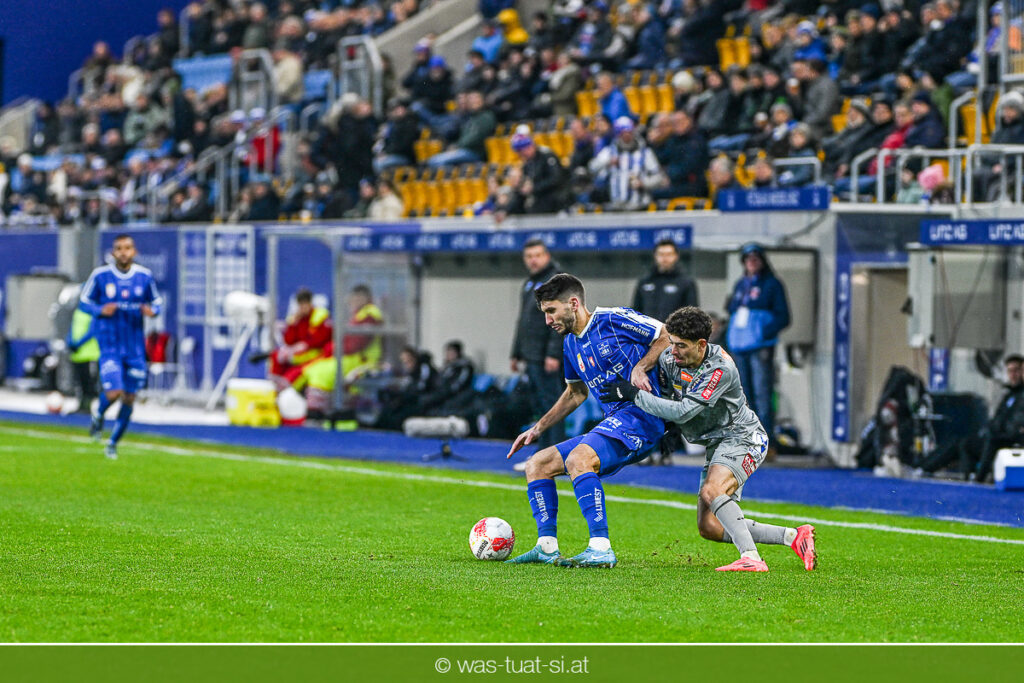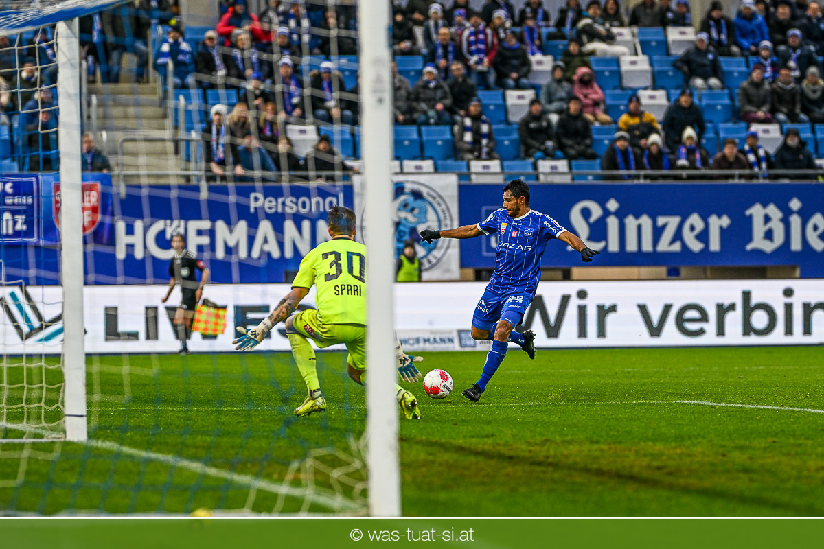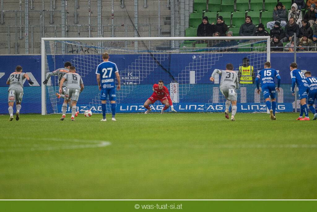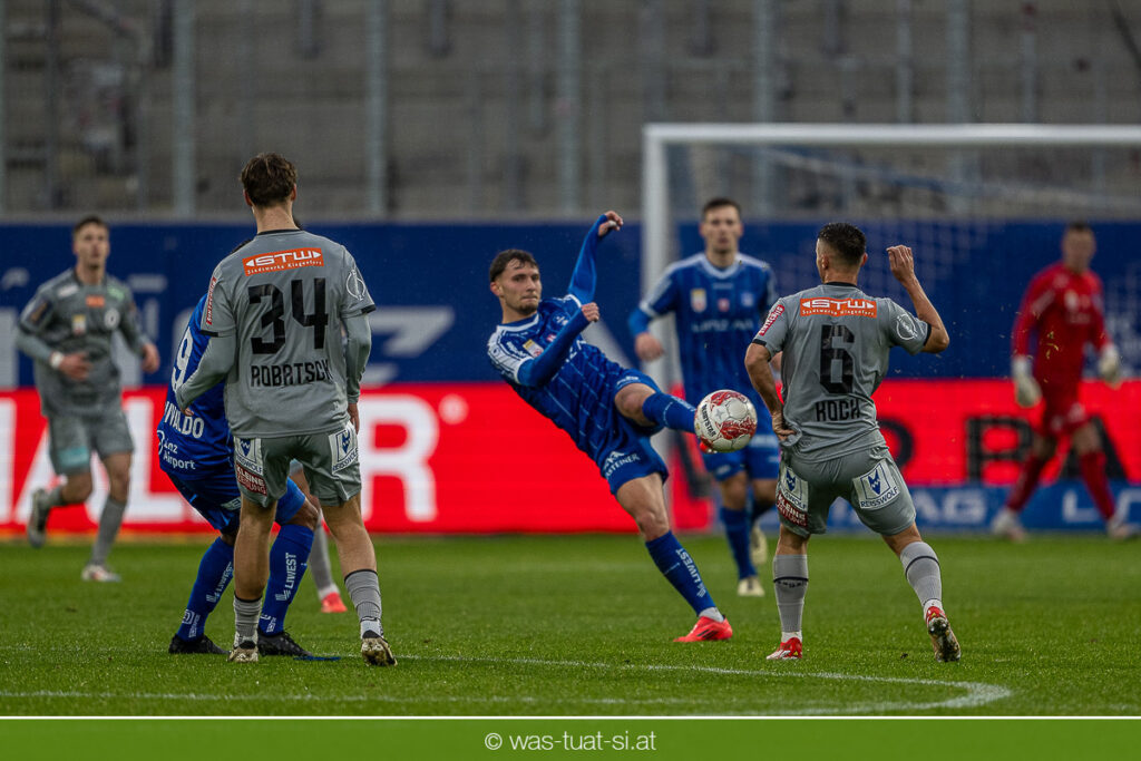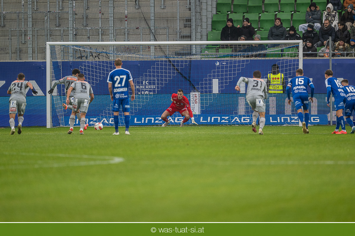 Aufregung dann in der 21. Minute, als Schiedsrichter Jakob Semler auf einmal auf den Punkt zeigte. Alem Pasic kam gegen Bobzien im Strafraum etwas zu spät – ein Elfer war die Folge, der Gefoulte selbst ließ sich nicht zwei Mal bitten und stellte auf 1:0. Schnell aber hatten die Blau-Weißen die Köpfe wieder oben, konnten die Pacult-Elf wieder unter Druck setzen und kamen in der 33. Minute zum Ausgleich über Goiginger. Hatten zumindest die Zuschauer schon geglaubt – doch nach langem VAR-Check wurde der Treffer wegen eines vermeintlichen Foulspiels von Ronivaldo an Keeper Spari zurückgenommen – eine sehr harte Entscheidung.