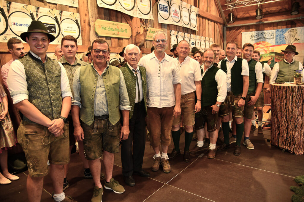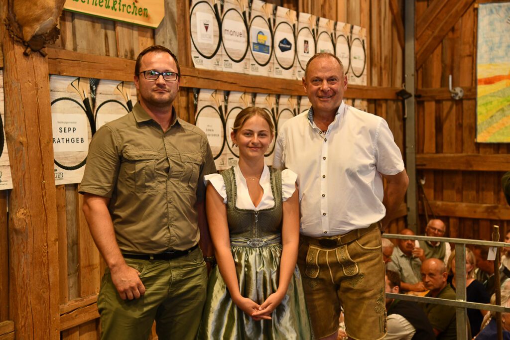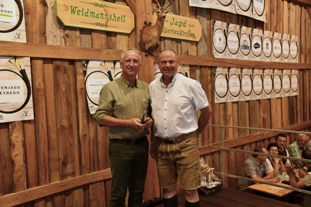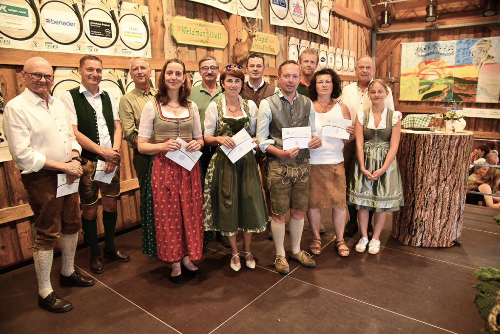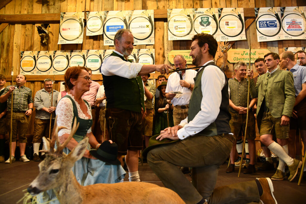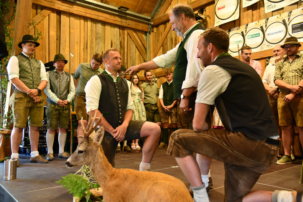 Ein besonderes Highlight war der feierliche Jungjägerschlag. 40 frischgebackene Jungjägerinnen und Jungjäger – als jüngster Tobias Wiesinger mit 16 Jahren – wurden von Bezirksjägermeister Sepp Rathgeb und dem Landesobmann für jagdliches Brauchtum, Bezirksjägermeister von Steyr, Rudolf Kern, mit erfolgreichem Abschluss der „Grünen Matura“ nach traditionellem Ritus in die Jägerschaft aufgenommen. Zugleich wurde auf der Bühne auch der älteste Jäger für seine jagdliche Treue mit dem ersten brandneuen Abzeichen „80jährige Mitgliedschaft im OÖ. Landesjagdverband“ ausgezeichnet: Der rüstige Ehrenbürger Otto Scheuchenstuhl aus Alberndorf, der mit 95 Jahren nach wie vor das Weidwerk vorbildlich ausübt.