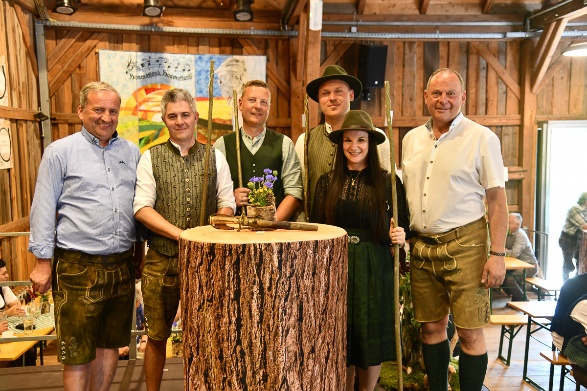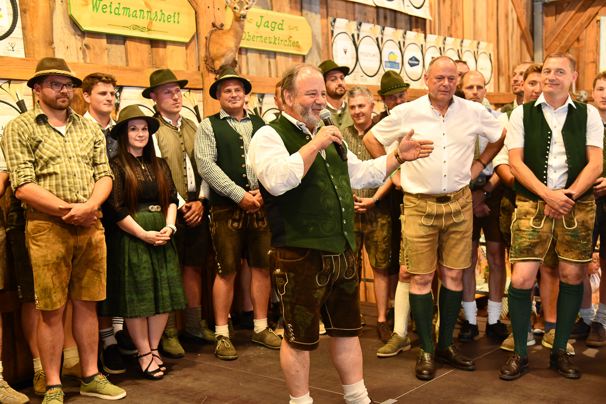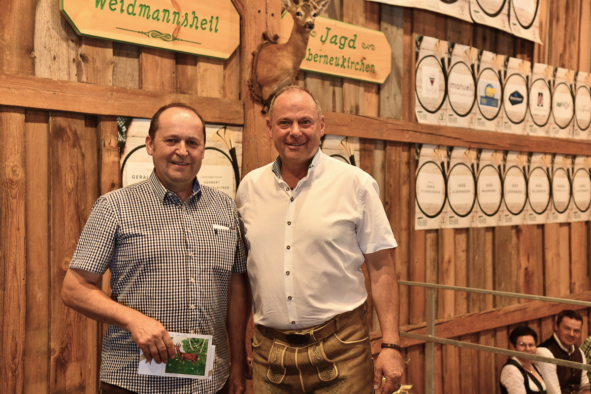 Ein besonderes Highlight war der feierliche Jungjägerschlag. 40 frischgebackene Jungjägerinnen und Jungjäger – als jüngster Tobias Wiesinger mit 16 Jahren – wurden von Bezirksjägermeister Sepp Rathgeb und dem Landesobmann für jagdliches Brauchtum, Bezirksjägermeister von Steyr, Rudolf Kern, mit erfolgreichem Abschluss der „Grünen Matura“ nach traditionellem Ritus in die Jägerschaft aufgenommen. Zugleich wurde auf der Bühne auch der älteste Jäger für seine jagdliche Treue mit dem ersten brandneuen Abzeichen „80jährige Mitgliedschaft im OÖ. Landesjagdverband“ ausgezeichnet: Der rüstige Ehrenbürger Otto Scheuchenstuhl aus Alberndorf, der mit 95 Jahren nach wie vor das Weidwerk vorbildlich ausübt.