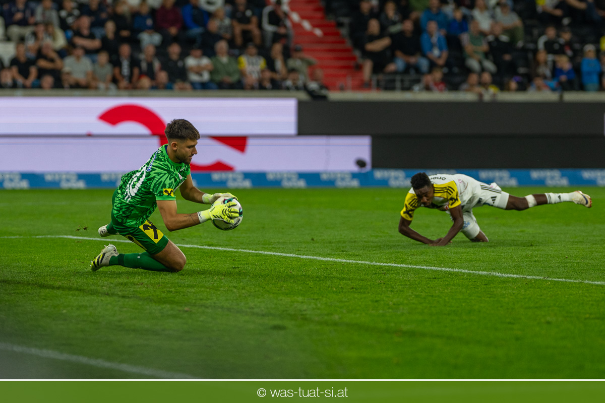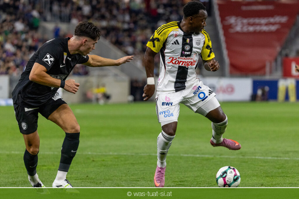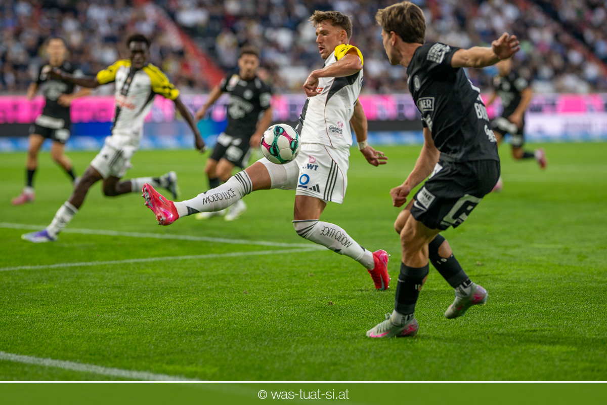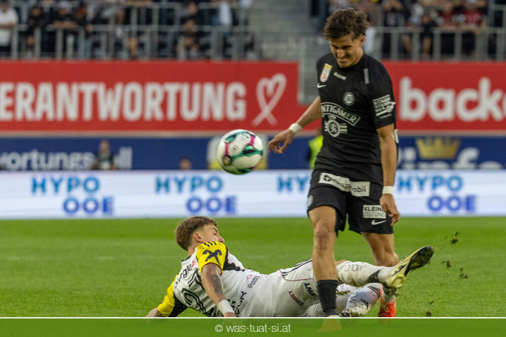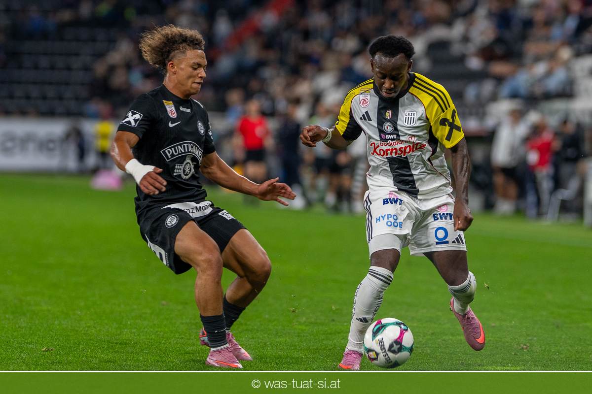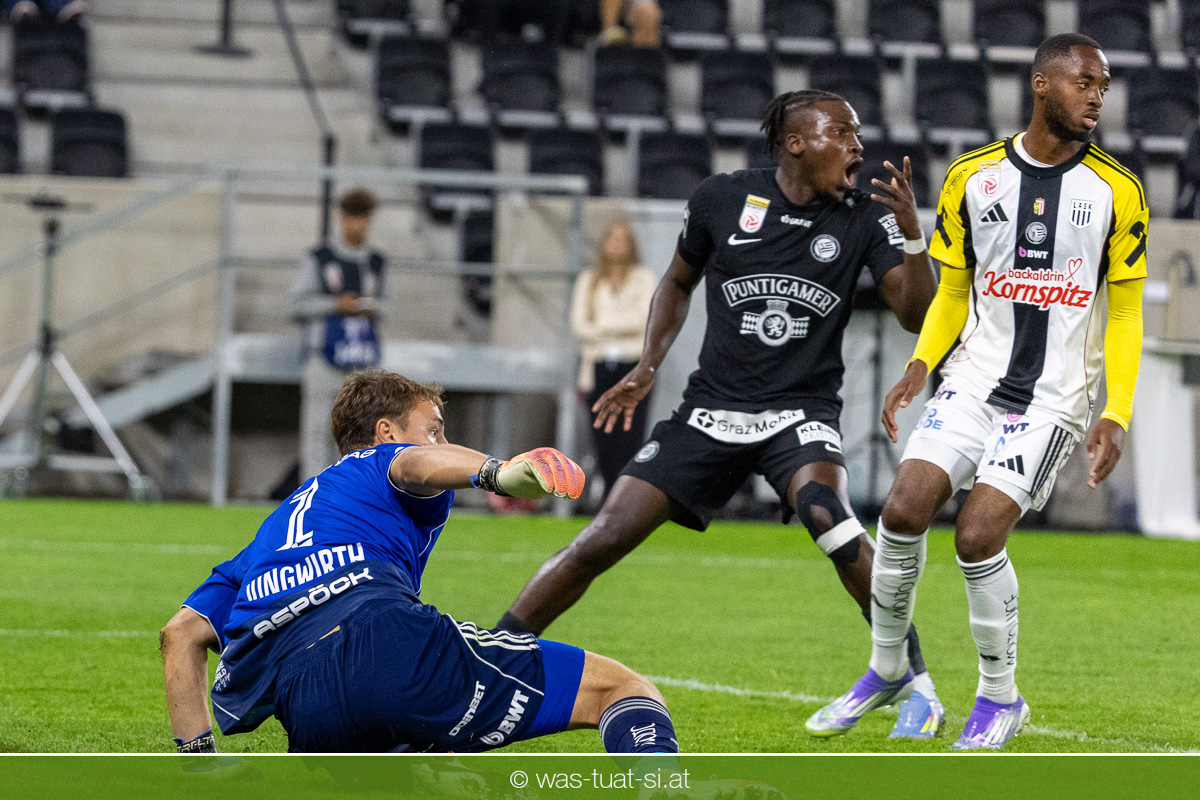 Der Meister ließ auch danach immer wieder seine Klasse aufblitzen, allen voran im Umschaltspiel nach Ballgewinn, wo die Grazer mit viel Tempo agierten und zu weiteren Möglichkeiten gelangten. Etwa nach 34 Minuten, als sich LASK-Keeper Lukas Jungwirth gegen Außenverteidiger Max Johnston auszeichnen konnte. Die Athletiker in dieser Phase mit wesentlich mehr Ballbesitz – insgesamt 67 Prozent standen nach den ersten 45 Minuten zu Buche – und mit phasenweise sehr gefälligem Spiel in der Aufbauzone wie auch im Mitteldrittel. Was fehlte, waren jedoch die klaren Torszenen, weil man im Angriffsdrittel oftmals zu unpräzise agierte und zahlreiche Hereingaben beim Gegner landeten.