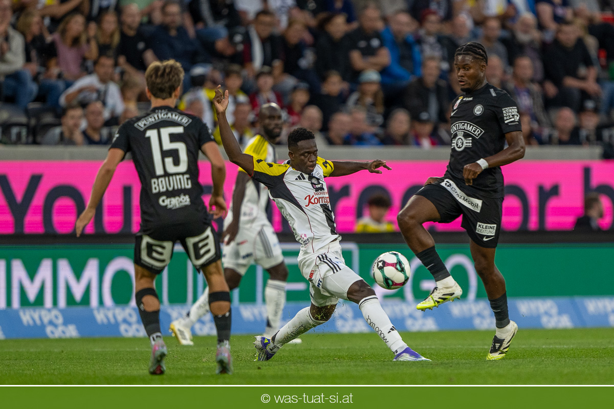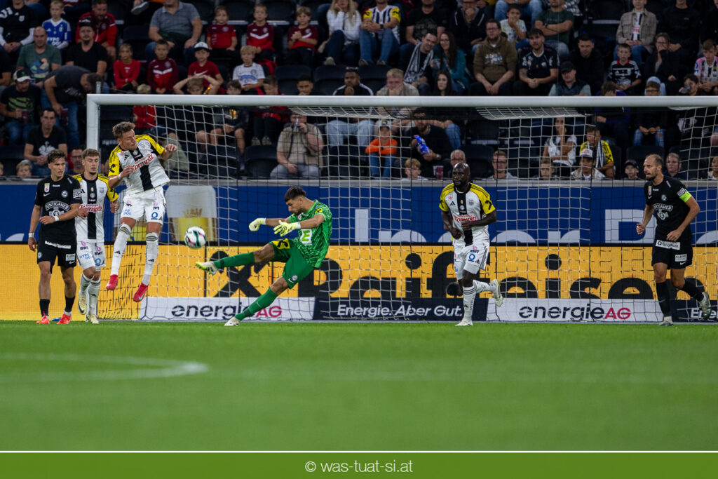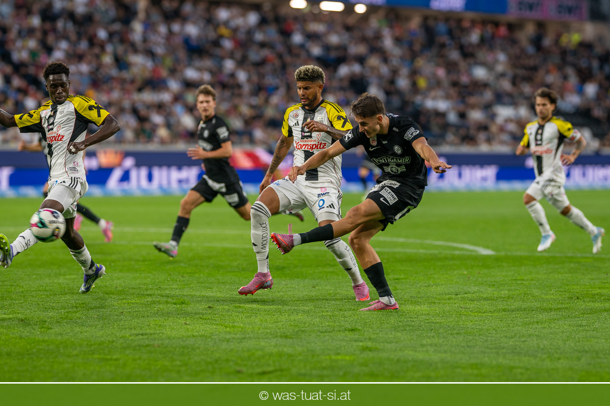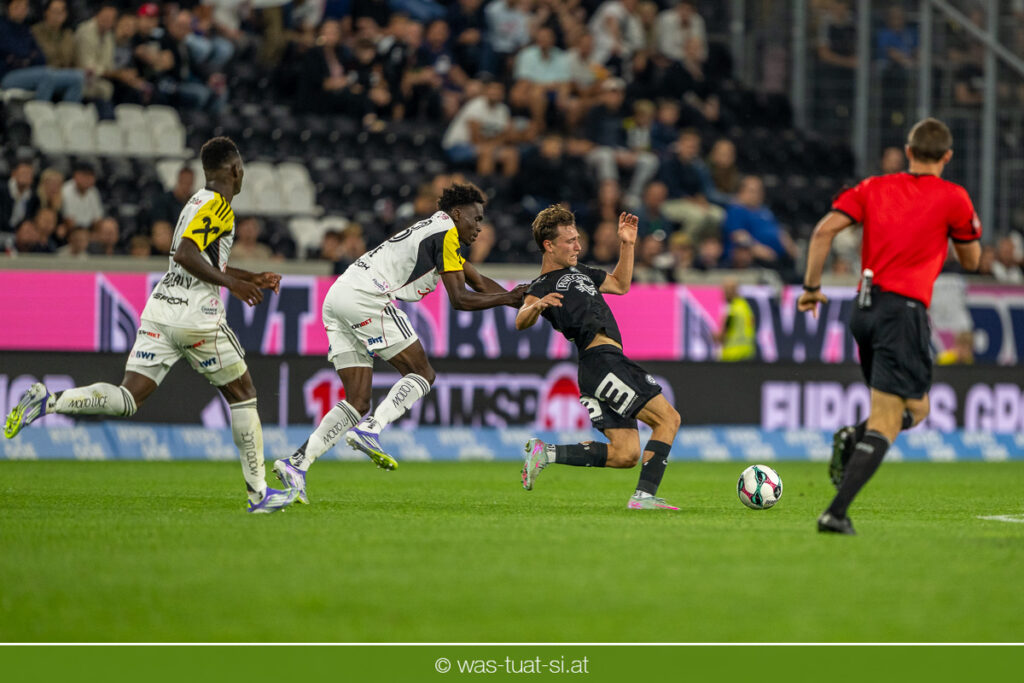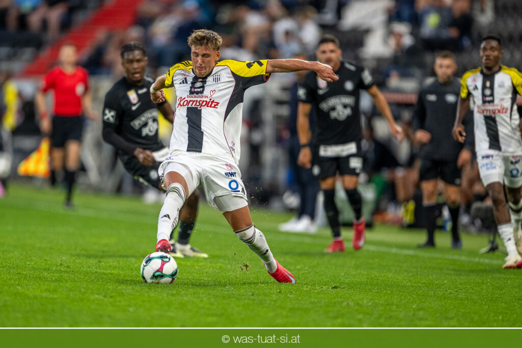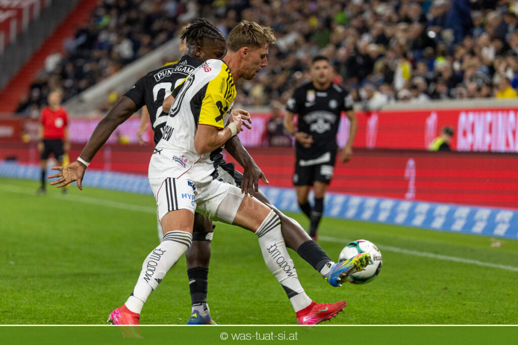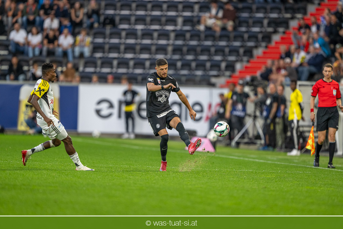 Der Meister ließ auch danach immer wieder seine Klasse aufblitzen, allen voran im Umschaltspiel nach Ballgewinn, wo die Grazer mit viel Tempo agierten und zu weiteren Möglichkeiten gelangten. Etwa nach 34 Minuten, als sich LASK-Keeper Lukas Jungwirth gegen Außenverteidiger Max Johnston auszeichnen konnte. Die Athletiker in dieser Phase mit wesentlich mehr Ballbesitz – insgesamt 67 Prozent standen nach den ersten 45 Minuten zu Buche – und mit phasenweise sehr gefälligem Spiel in der Aufbauzone wie auch im Mitteldrittel. Was fehlte, waren jedoch die klaren Torszenen, weil man im Angriffsdrittel oftmals zu unpräzise agierte und zahlreiche Hereingaben beim Gegner landeten.