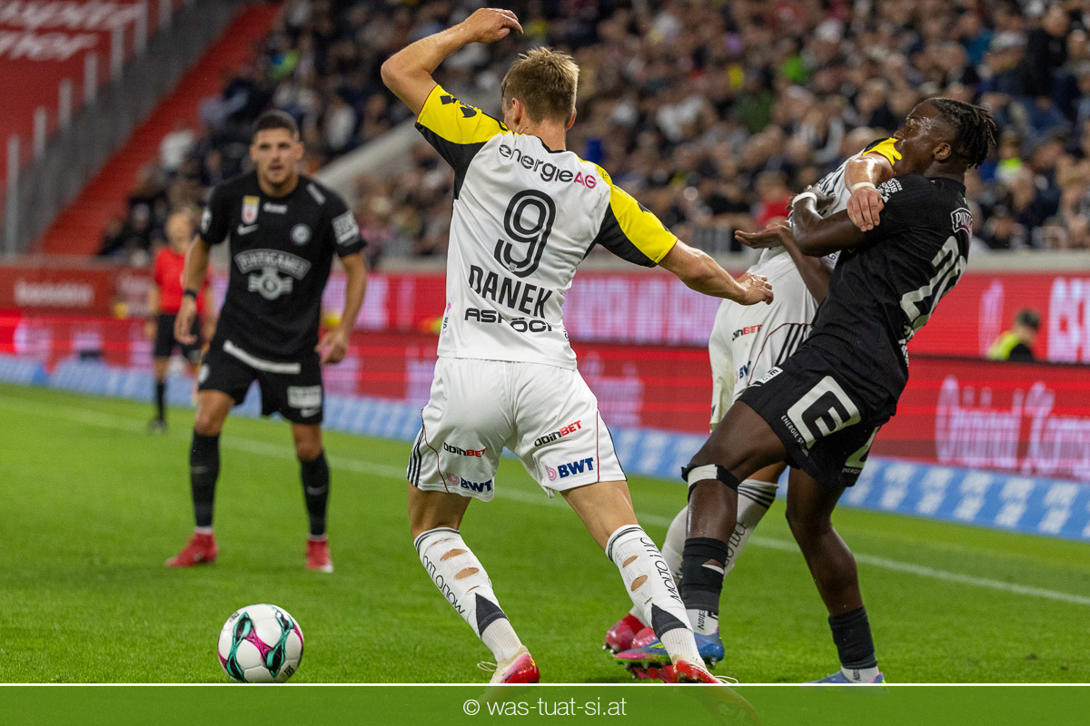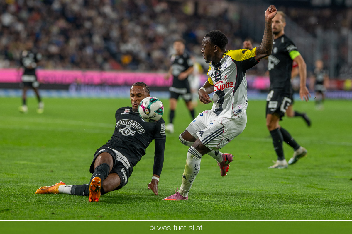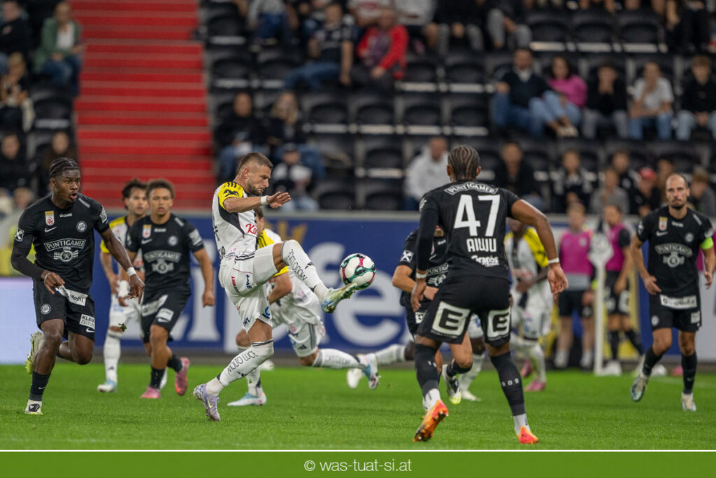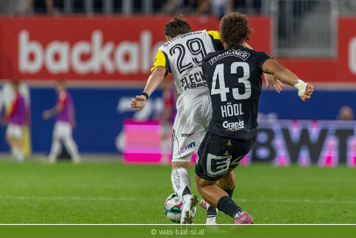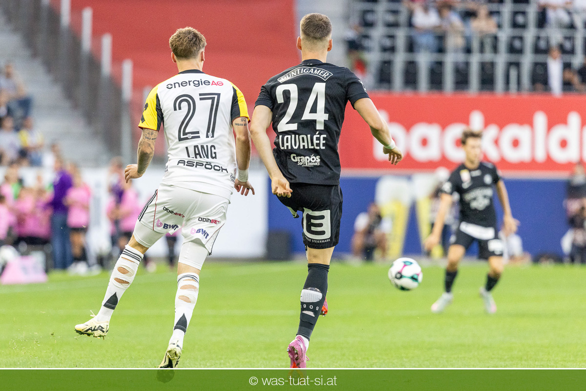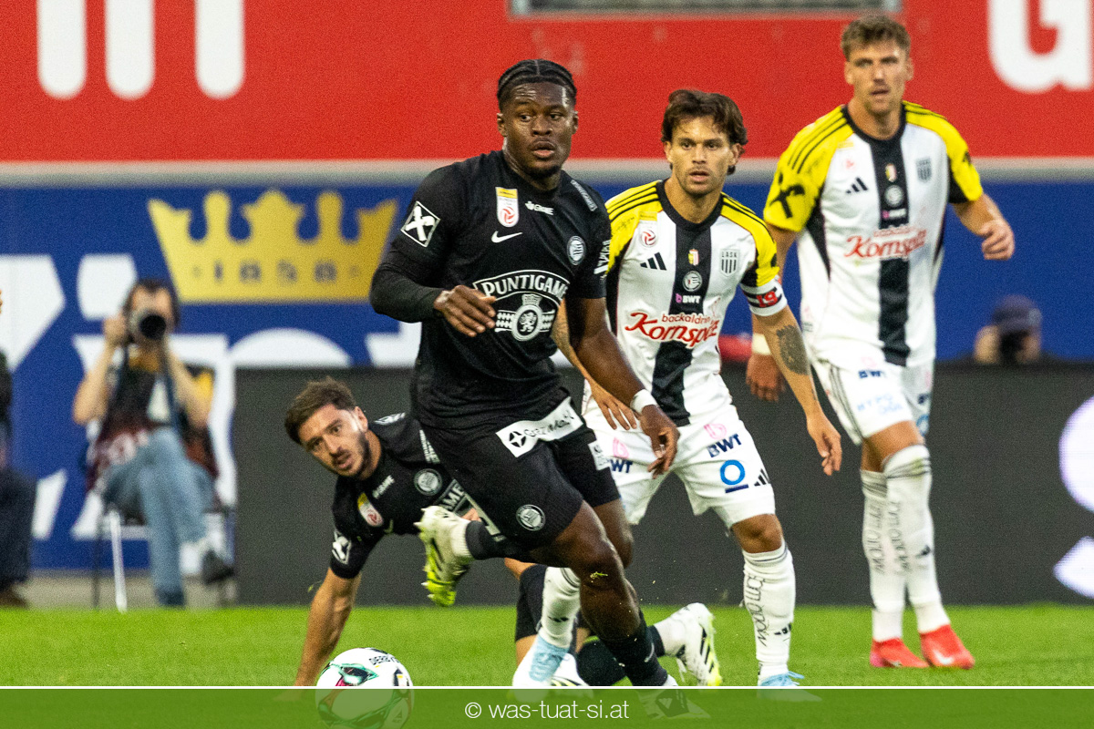 Der Meister ließ auch danach immer wieder seine Klasse aufblitzen, allen voran im Umschaltspiel nach Ballgewinn, wo die Grazer mit viel Tempo agierten und zu weiteren Möglichkeiten gelangten. Etwa nach 34 Minuten, als sich LASK-Keeper Lukas Jungwirth gegen Außenverteidiger Max Johnston auszeichnen konnte. Die Athletiker in dieser Phase mit wesentlich mehr Ballbesitz – insgesamt 67 Prozent standen nach den ersten 45 Minuten zu Buche – und mit phasenweise sehr gefälligem Spiel in der Aufbauzone wie auch im Mitteldrittel. Was fehlte, waren jedoch die klaren Torszenen, weil man im Angriffsdrittel oftmals zu unpräzise agierte und zahlreiche Hereingaben beim Gegner landeten.