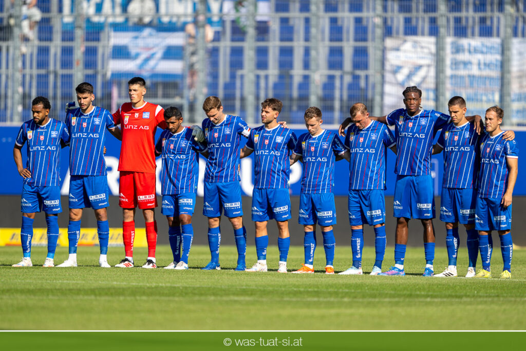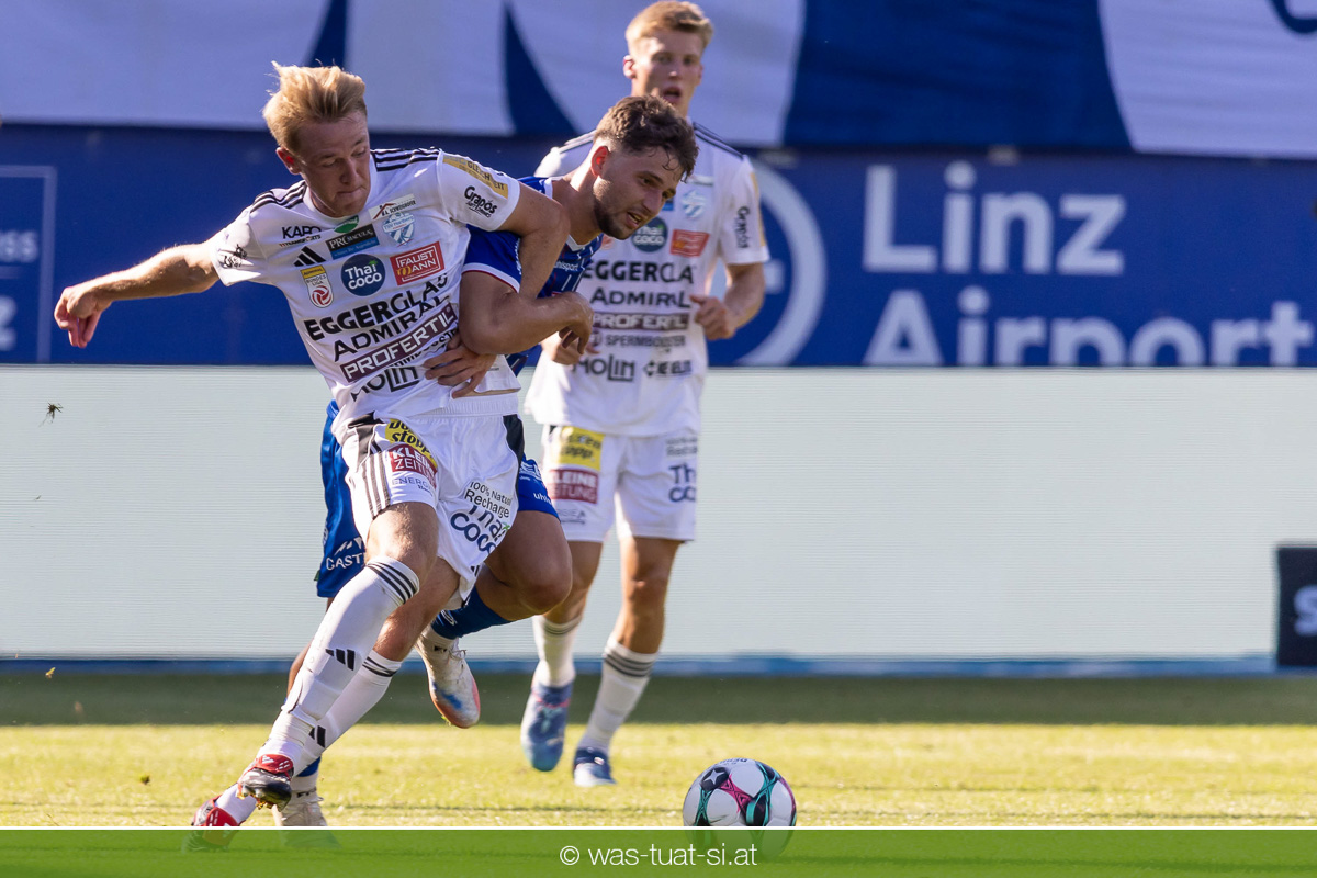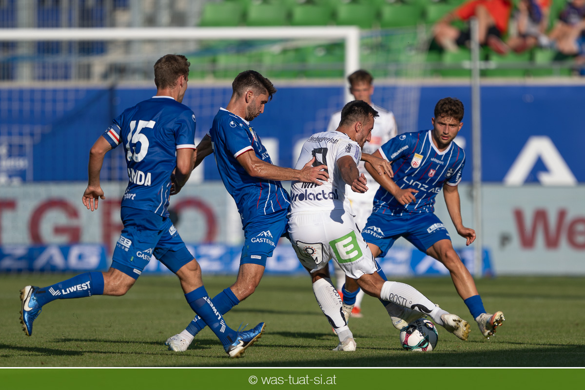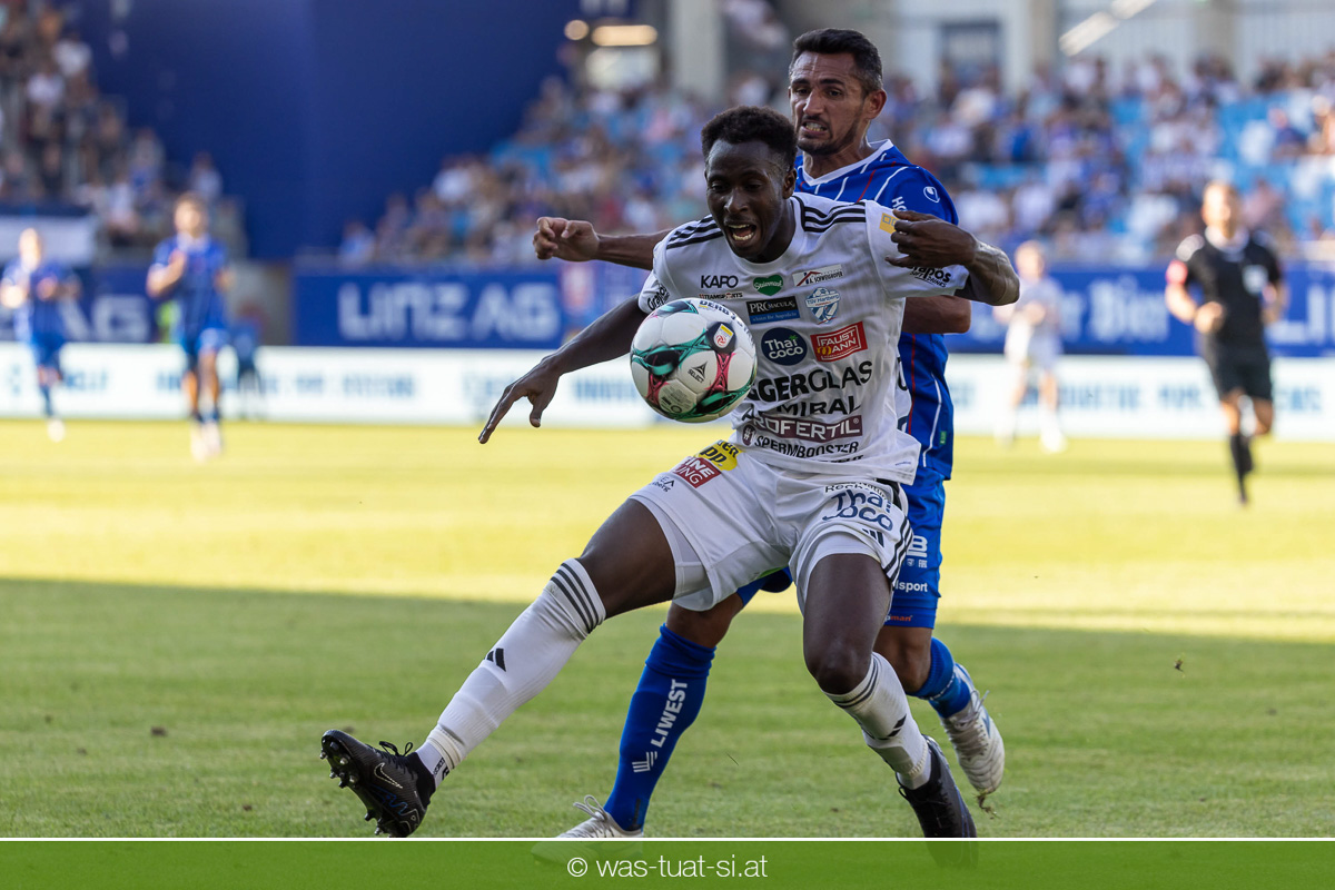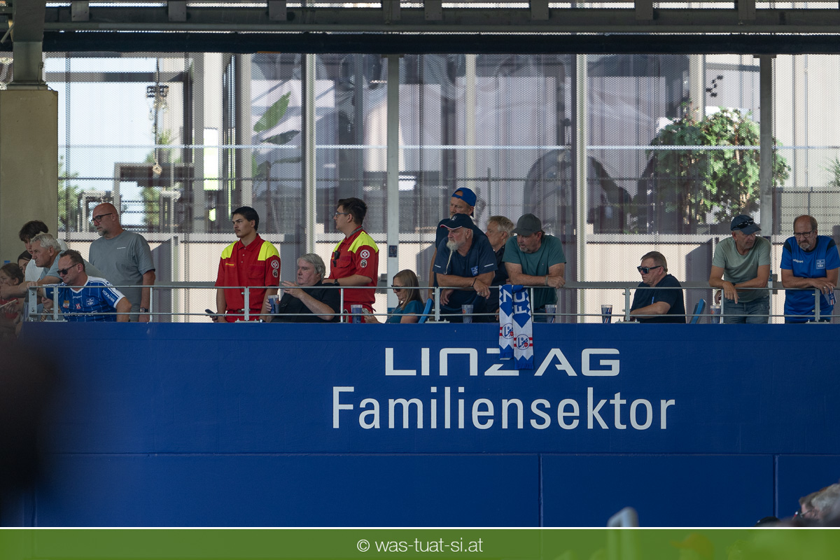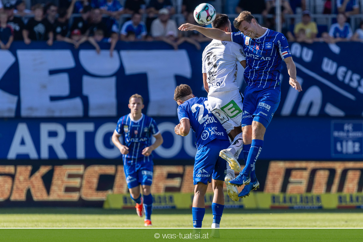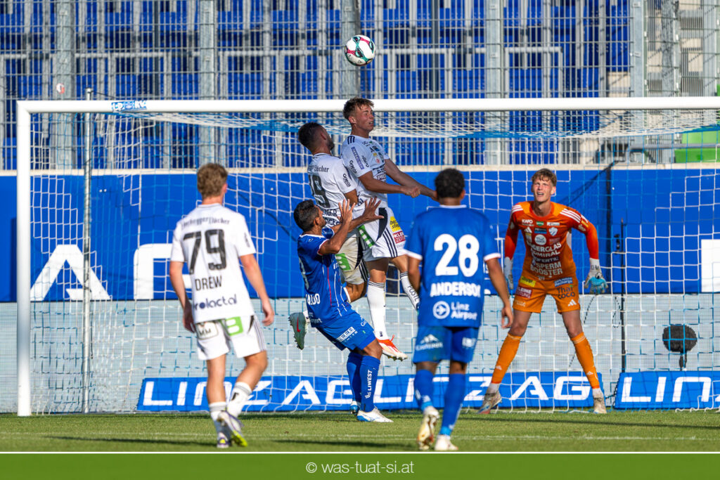 Bei hochsommerlichen Temperaturen über 30 Grad starteten die Hausherren aktiv ins Spiel. Von Beginn an bestimmten die Linzer das Geschehen, ließen den Ball gut zirkulieren und hielten den Gegner weitgehend in der eigenen Hälfte. Zwingende Chancen blieben jedoch Mangelware. Ronivaldo und Nico Maier versuchten es aus der Distanz, fanden aber keinen Weg vorbei an Hartbergs Keeper Tom Hülsmann. Defensiv standen die Gäste kompakt und lange Zeit schien es auf ein torloses Remis zur Pause hinauszulaufen. Doch in der vierten Minute der Nachspielzeit der ersten Hälfte nutzte Hartberg seine erste wirklich gefährliche Aktion: Über rechts kam Elias Havel durch, legte auf Jed Drew ab und der traf im Nachsetzen zum 0:1. Ein bitterer Schlag für die Linzer, die bis dahin klar tonangebend waren.