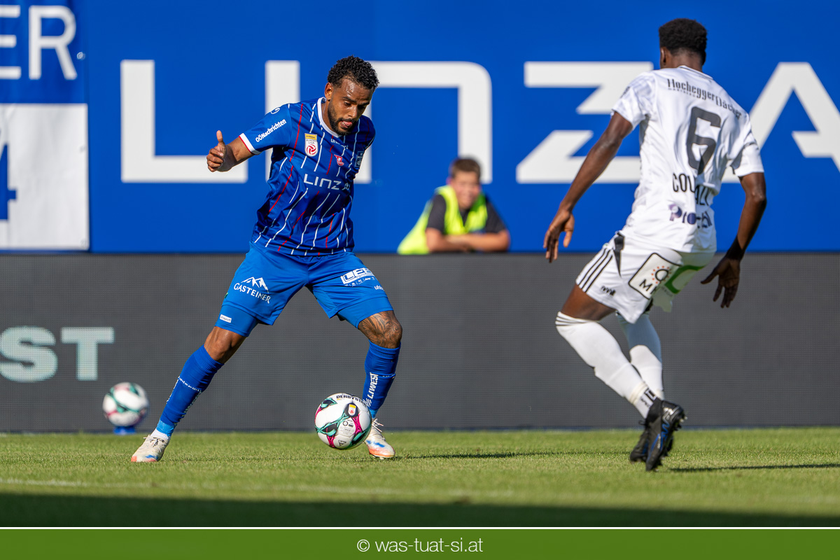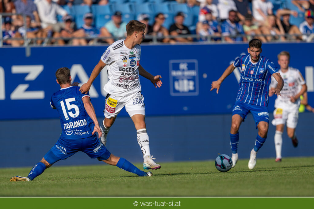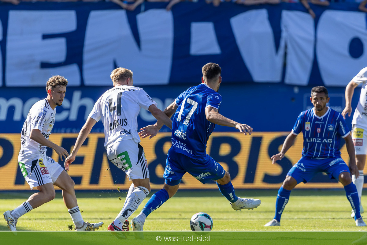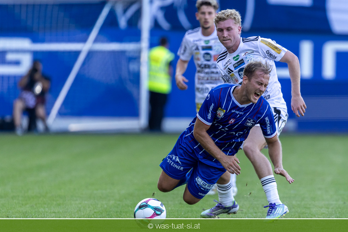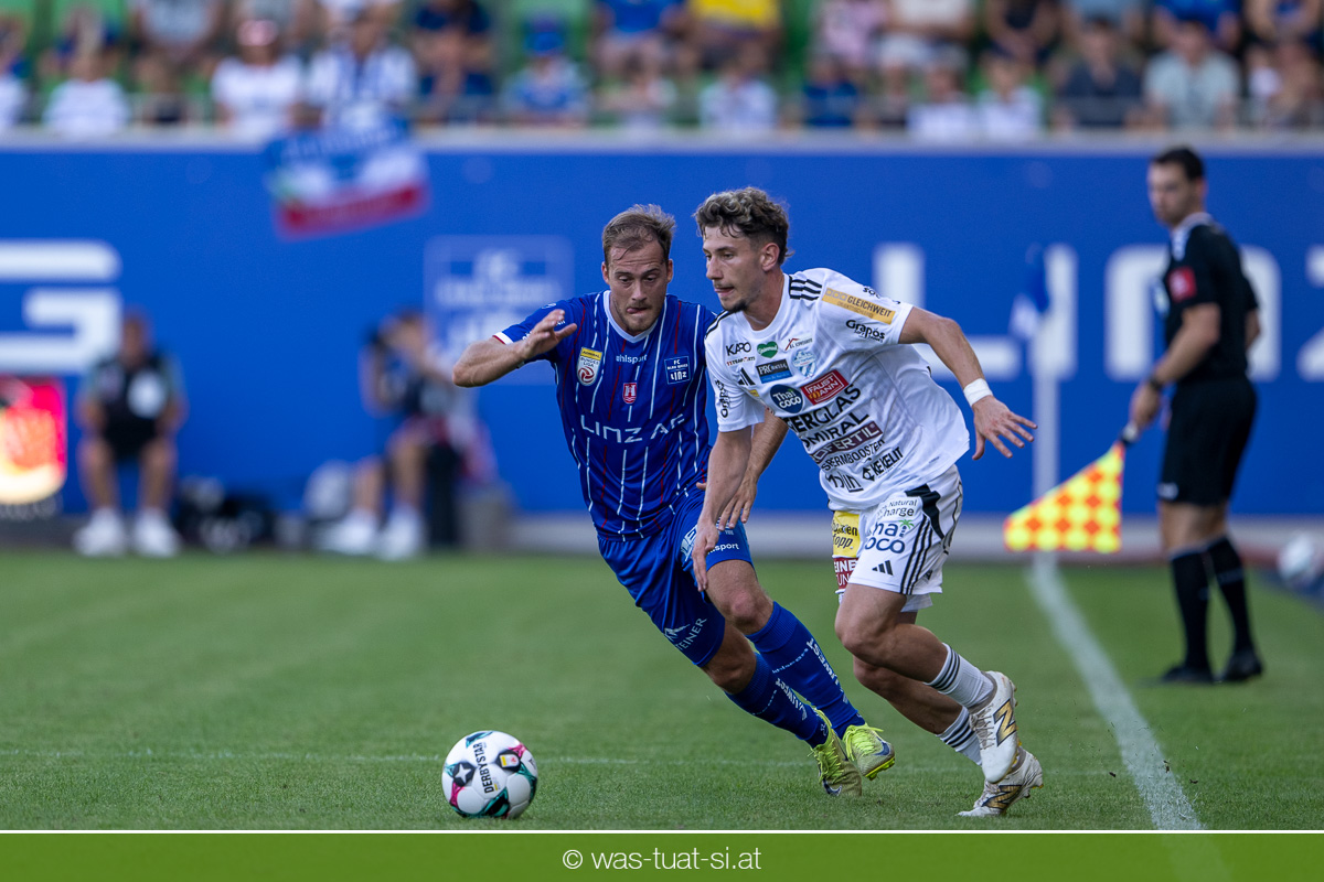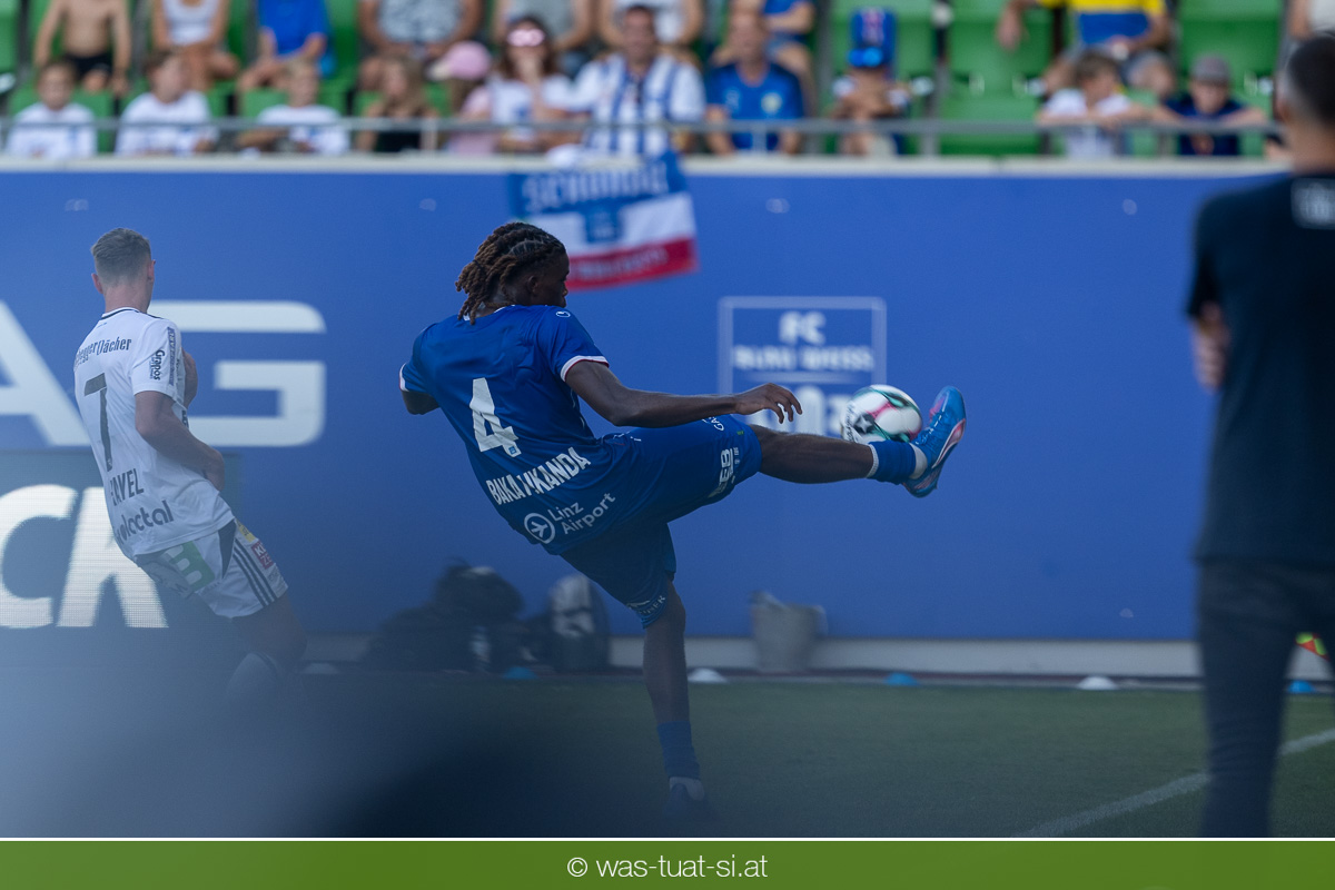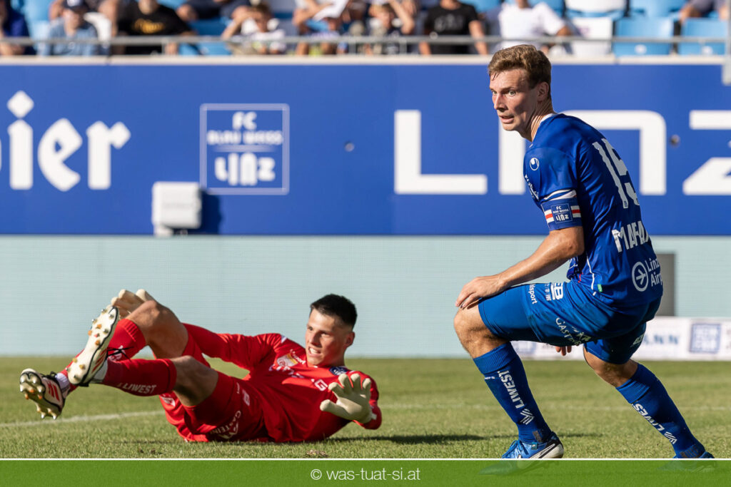 Bei hochsommerlichen Temperaturen über 30 Grad starteten die Hausherren aktiv ins Spiel. Von Beginn an bestimmten die Linzer das Geschehen, ließen den Ball gut zirkulieren und hielten den Gegner weitgehend in der eigenen Hälfte. Zwingende Chancen blieben jedoch Mangelware. Ronivaldo und Nico Maier versuchten es aus der Distanz, fanden aber keinen Weg vorbei an Hartbergs Keeper Tom Hülsmann. Defensiv standen die Gäste kompakt und lange Zeit schien es auf ein torloses Remis zur Pause hinauszulaufen. Doch in der vierten Minute der Nachspielzeit der ersten Hälfte nutzte Hartberg seine erste wirklich gefährliche Aktion: Über rechts kam Elias Havel durch, legte auf Jed Drew ab und der traf im Nachsetzen zum 0:1. Ein bitterer Schlag für die Linzer, die bis dahin klar tonangebend waren.