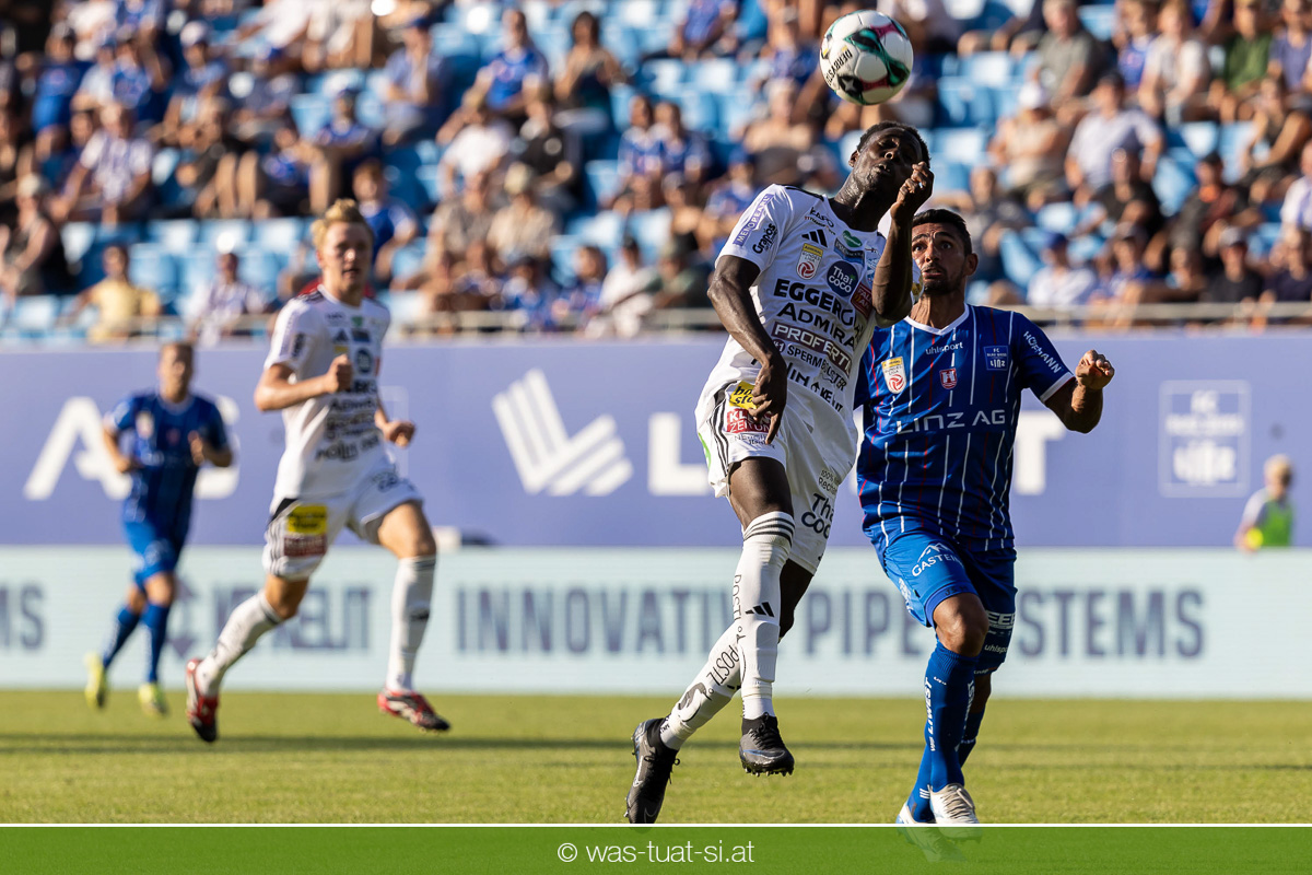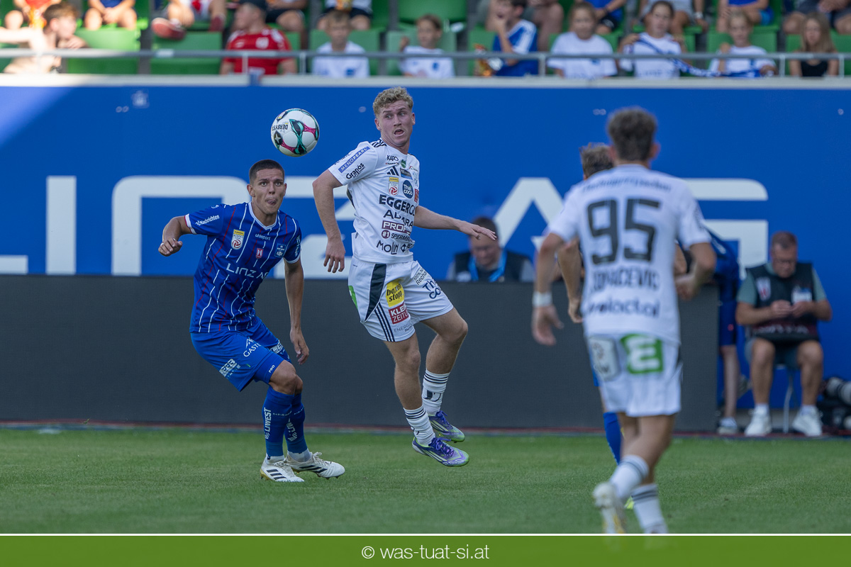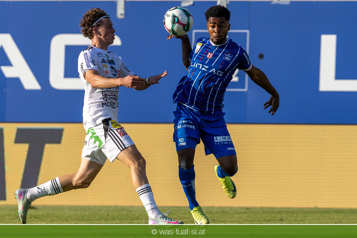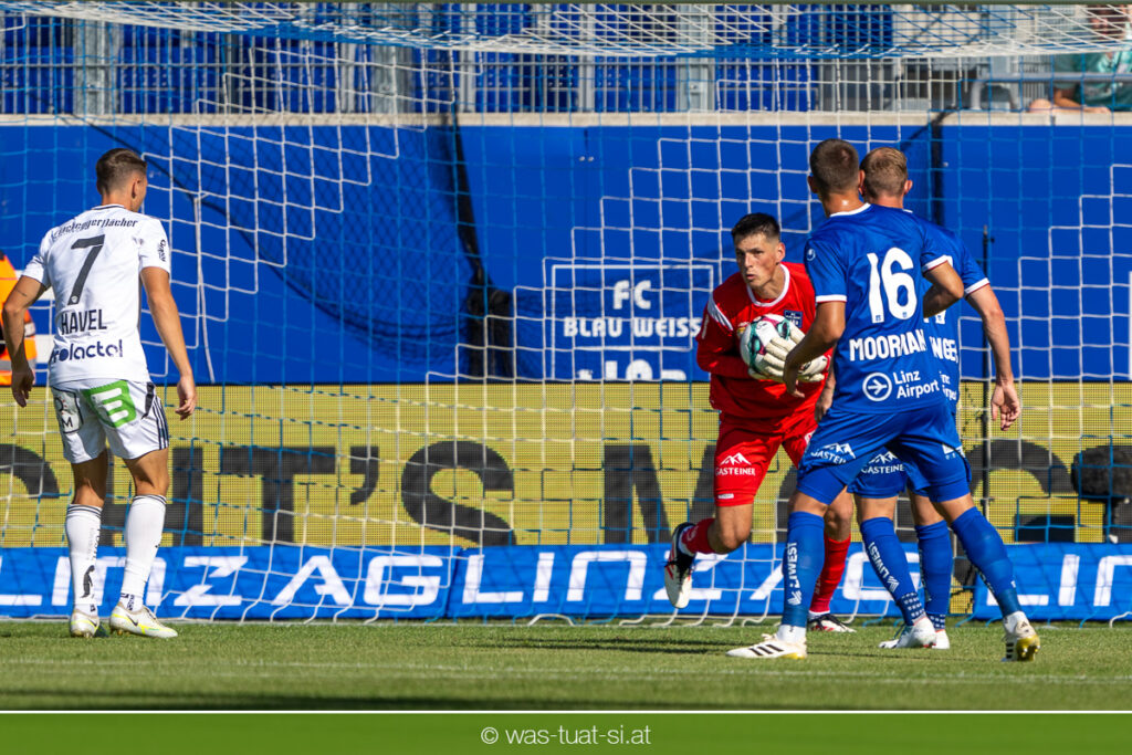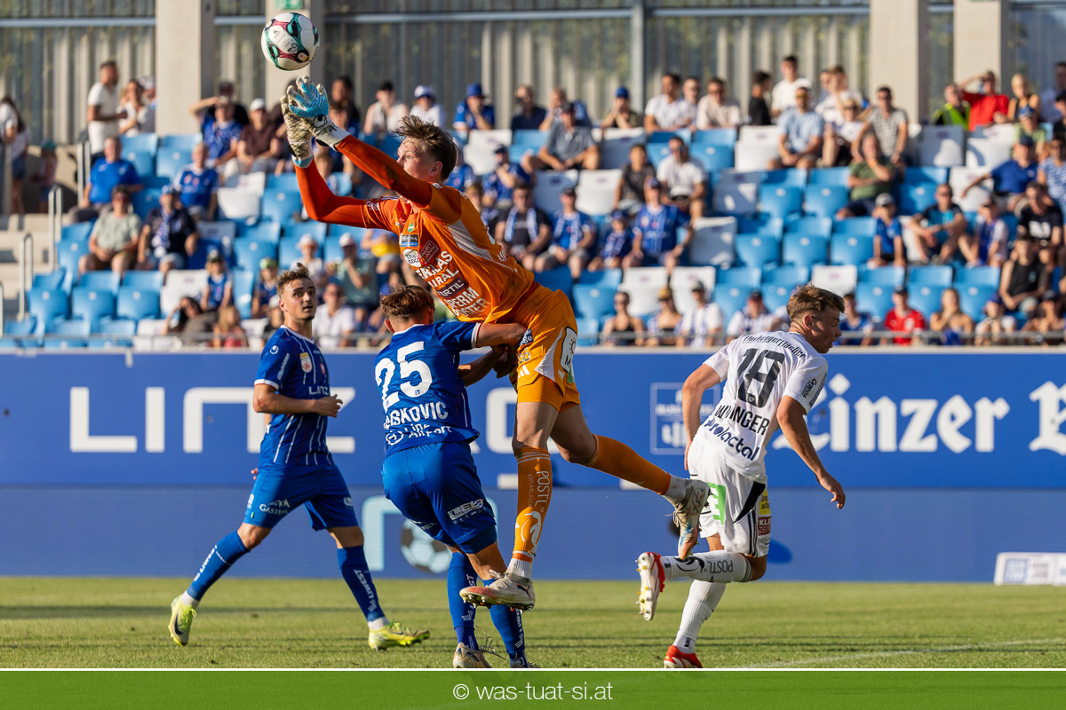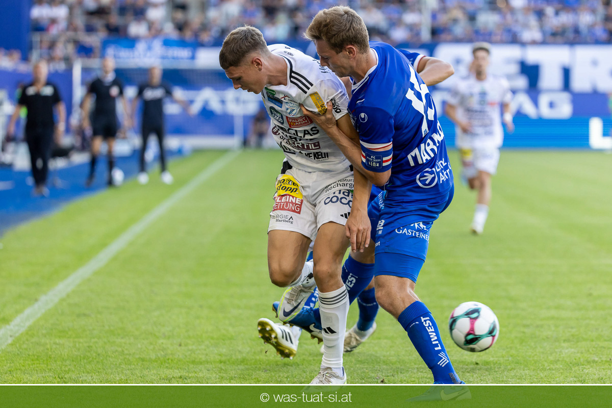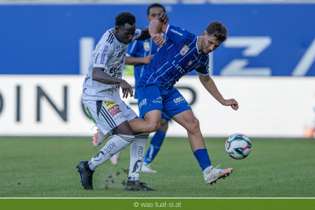 Bei hochsommerlichen Temperaturen über 30 Grad starteten die Hausherren aktiv ins Spiel. Von Beginn an bestimmten die Linzer das Geschehen, ließen den Ball gut zirkulieren und hielten den Gegner weitgehend in der eigenen Hälfte. Zwingende Chancen blieben jedoch Mangelware. Ronivaldo und Nico Maier versuchten es aus der Distanz, fanden aber keinen Weg vorbei an Hartbergs Keeper Tom Hülsmann. Defensiv standen die Gäste kompakt und lange Zeit schien es auf ein torloses Remis zur Pause hinauszulaufen. Doch in der vierten Minute der Nachspielzeit der ersten Hälfte nutzte Hartberg seine erste wirklich gefährliche Aktion: Über rechts kam Elias Havel durch, legte auf Jed Drew ab und der traf im Nachsetzen zum 0:1. Ein bitterer Schlag für die Linzer, die bis dahin klar tonangebend waren.