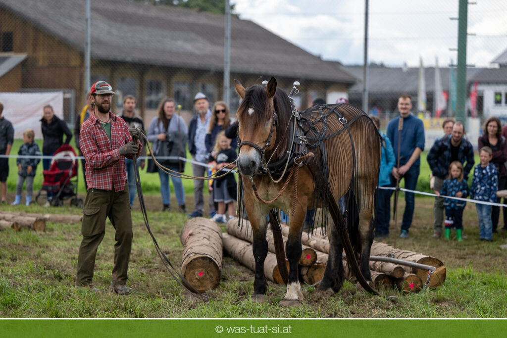 Ein beeindruckender Programmpunkt war das Holzrücken mit Noriker-Wallach Hubert, der unter der Anleitung von Dominik Zabilka schwere Baumstämme zog. Dabei wurde gezeigt, wie umweltschonend und effektiv Pferdearbeit im Wald funktionieren kann.
