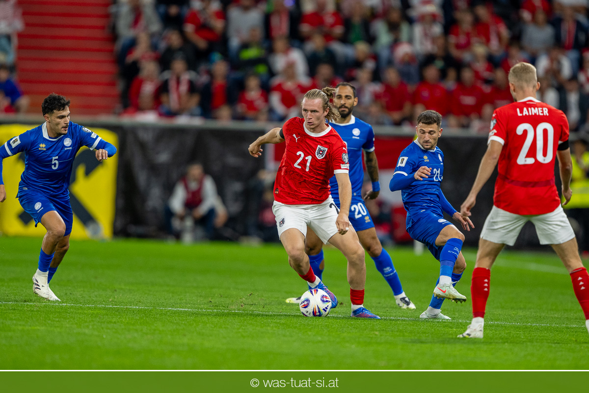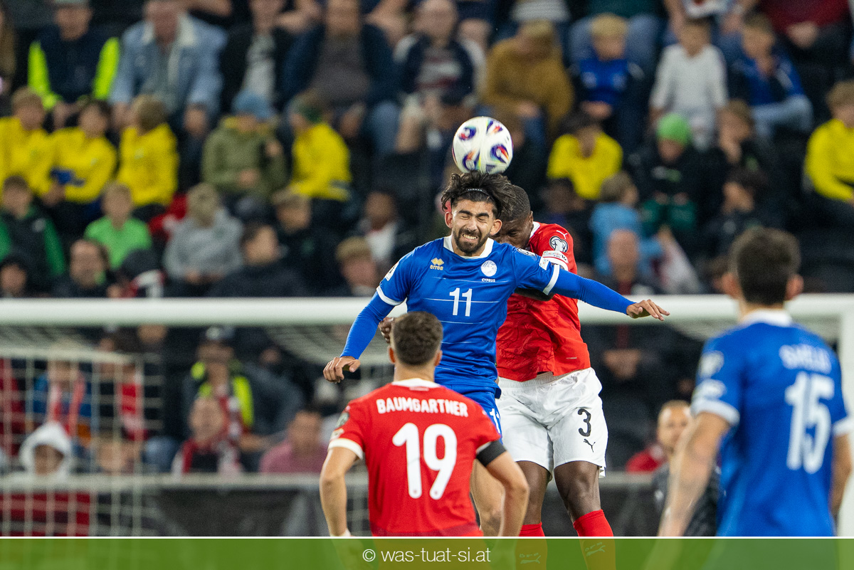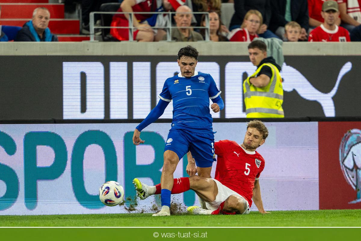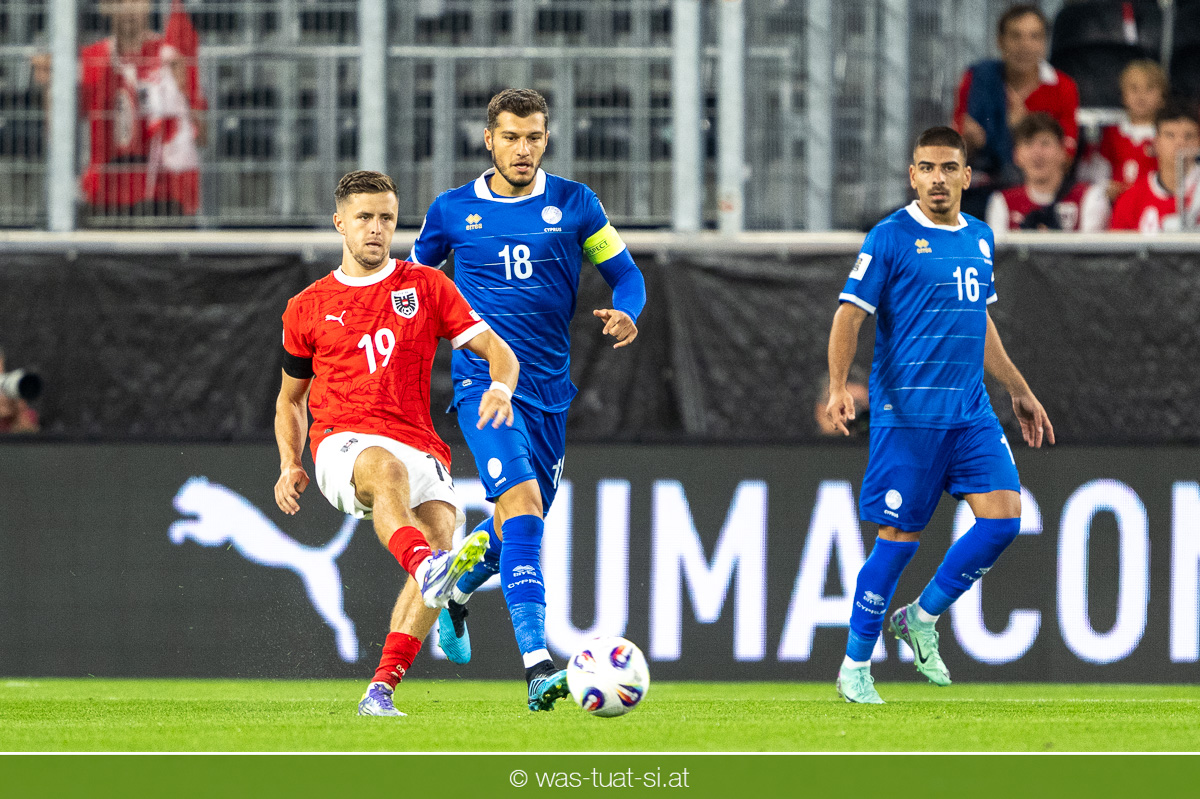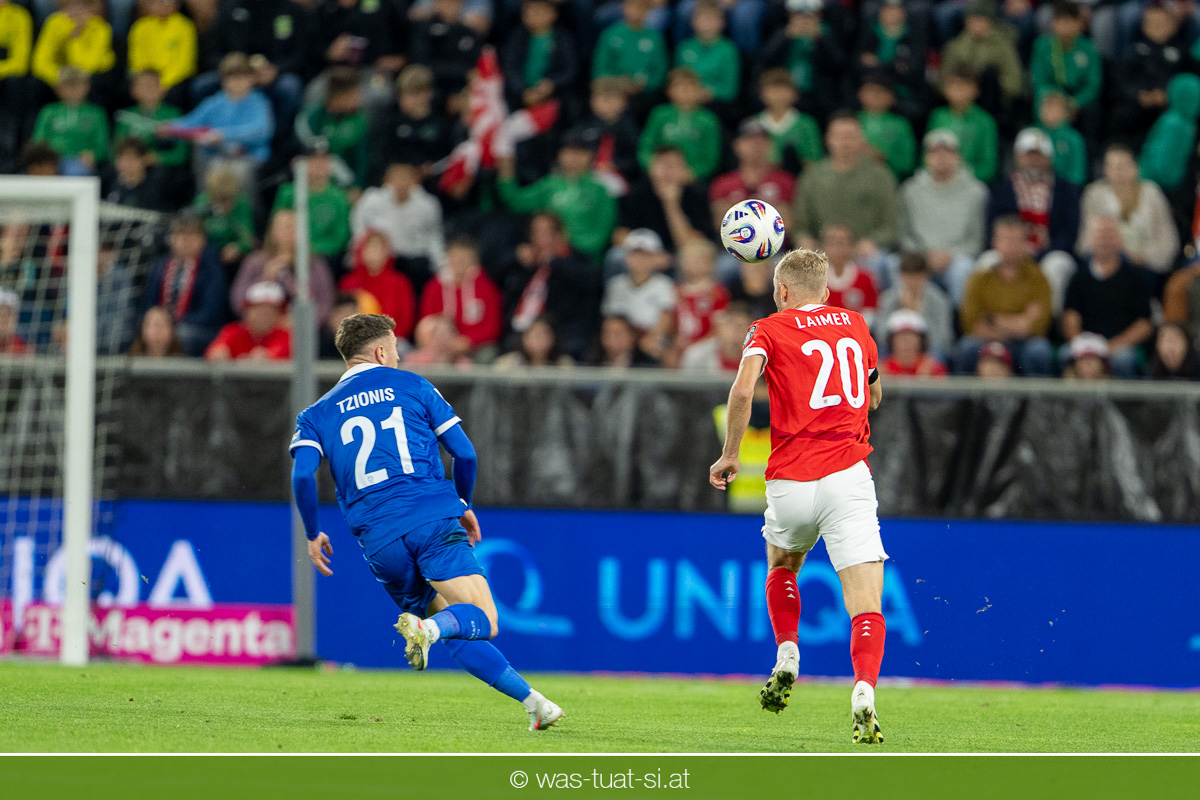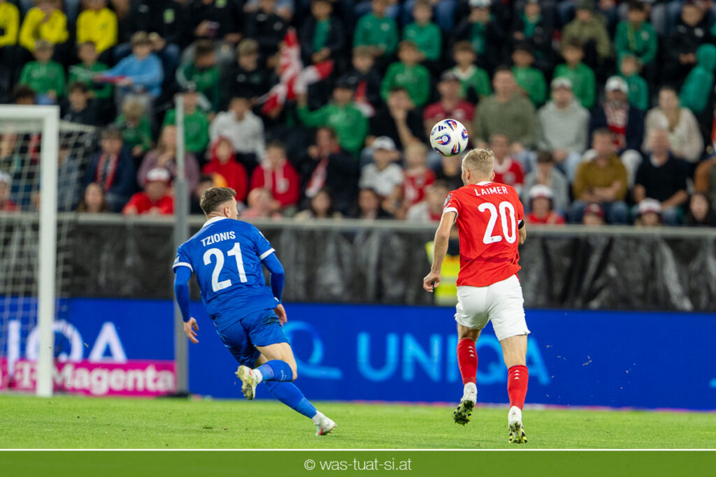 In der 23. Minute werden dann die Zyprer brandgefährlich: Ioannis Pittas trifft aus spitzem Winkel die Außenstange. Auf der Gegenseite findet dann auch Konrad Laimer eine richtig gute Gelegenheit vor, legt den Ball von der rechten Seite auf das Tor zulaufend aber links vorbei (26.).