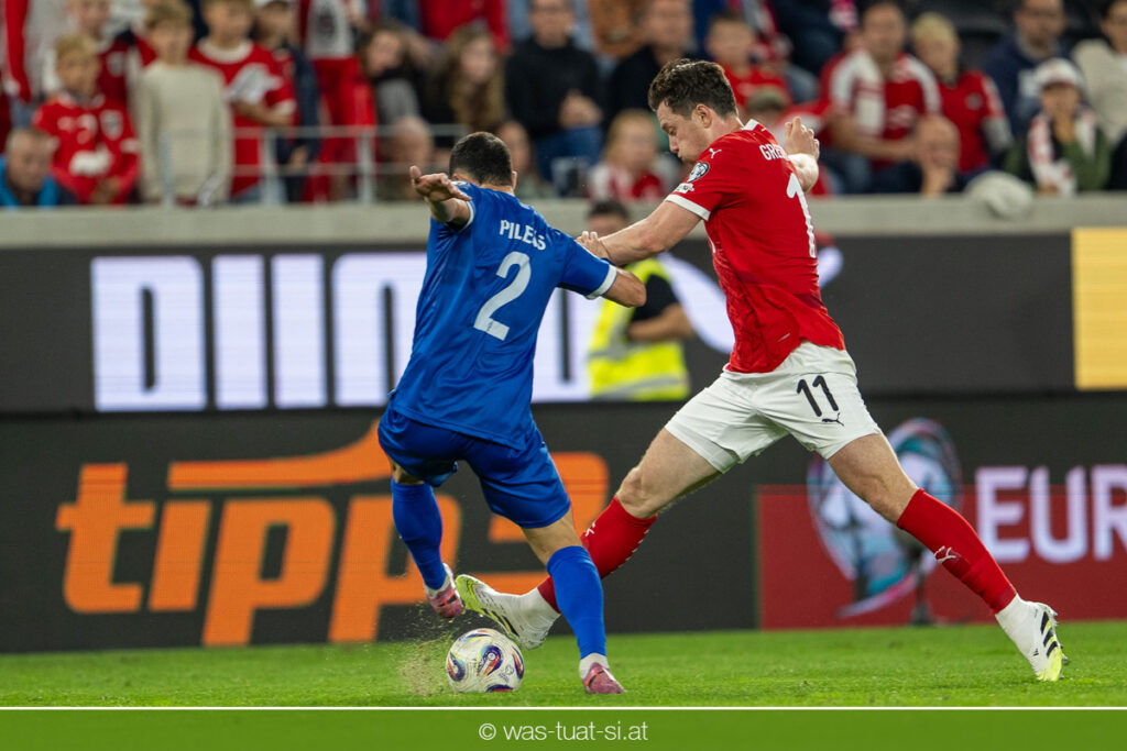 Kurz nach dem Seitenwechsel wird Christoph Baumgartner im gegnerischen Sechzehner zu Fall gebracht, doch die Pfeife vom dänischen Schiedsrichter Jakob Kehlet bleibt stumm (48.). Die ÖFB-Auswahl, bei der Marko Arnautovic in der Halbzeit durch Michael Gregoritsch ersetzt wurde, drängt Zypern vermehrt in die eigene Hälfte. David Alaba flankt auf Christoph Baumgartner, doch der wird wenige Meter vor dem Tor gefoult. Christos Sielis steigt dem Offensivspieler auf den Knöchel – nach einem On-Field-Review gibt es Elfmeter für Österreich!