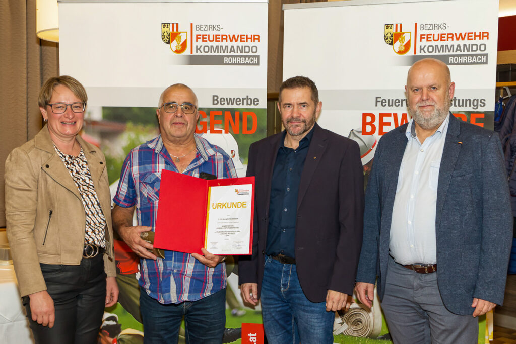 Georg Schaubmaier, Ehren-Oberbrandinspektor der Feuerwehr St. Oswald bei Haslach erhielt für seine mehr als 23 jährige Tätigkeit als Bewerter bei der Feuerwehrjugend das goldene Feuerwehr-Ehrenabzeichen des Bezirkes Rohrbach verliehen