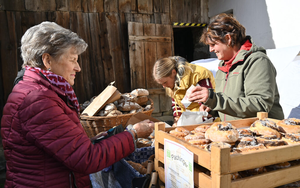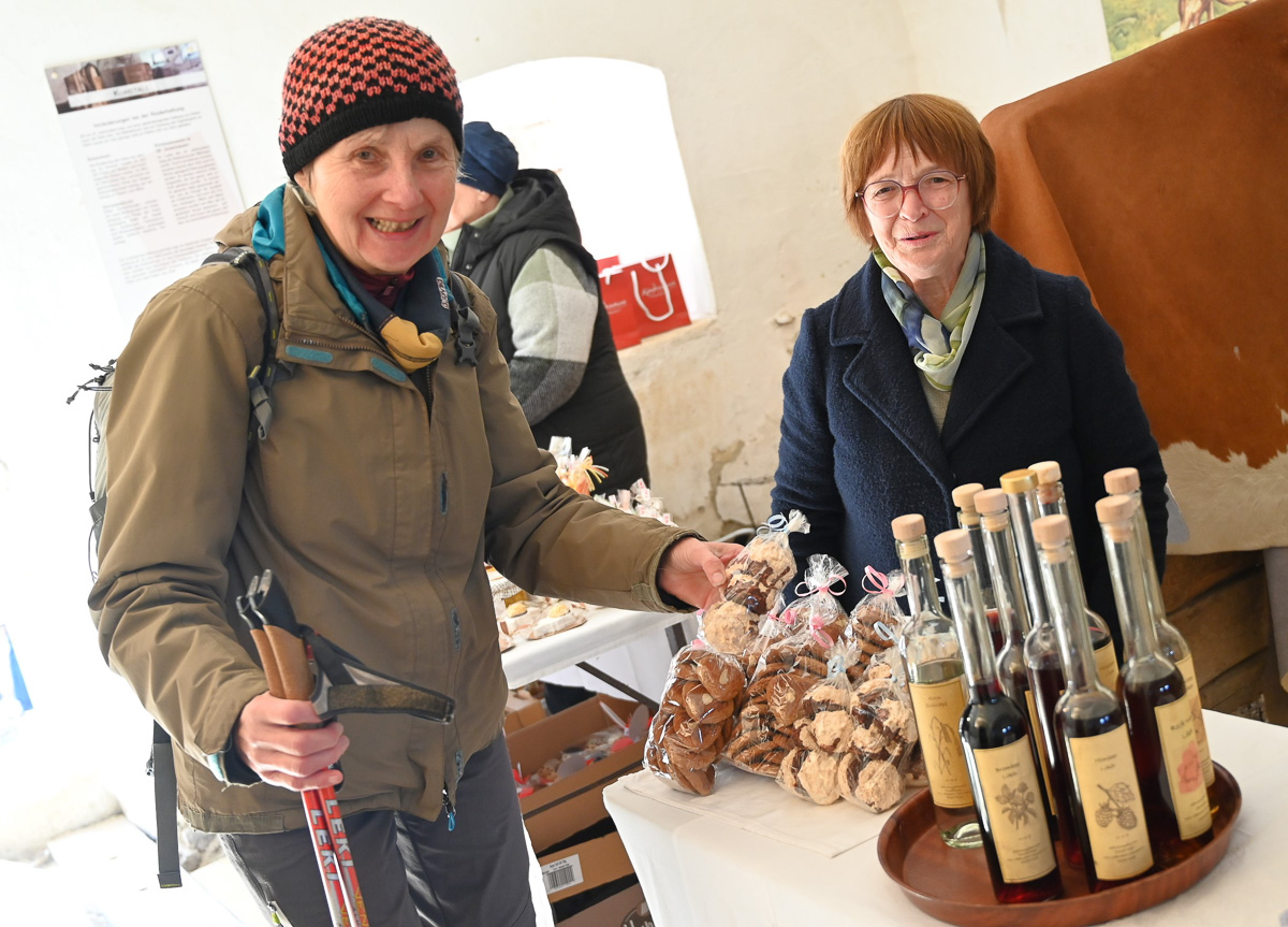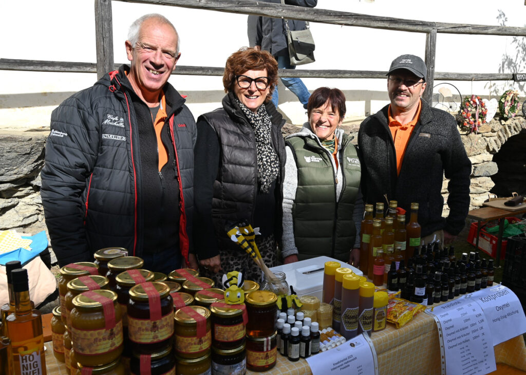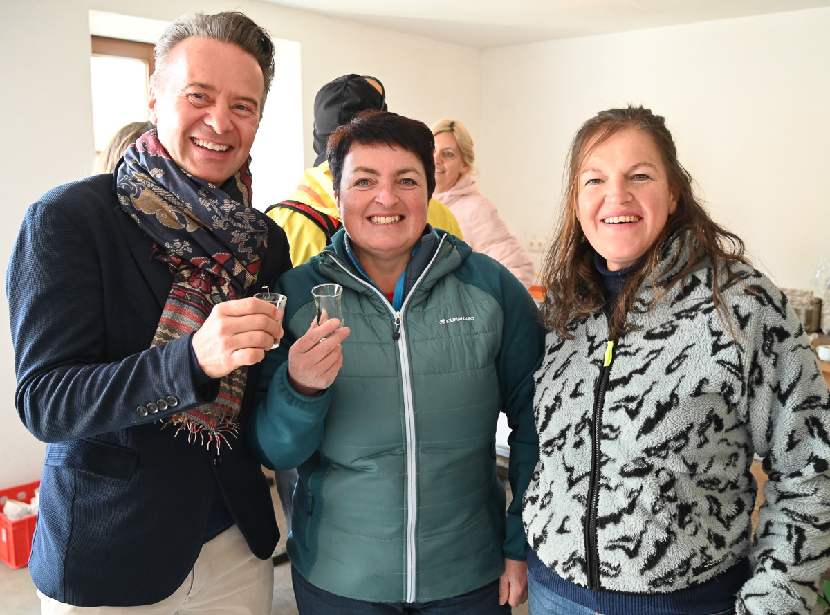 Überraschend tauchte zur Rast auch Modeschöpfer Gottfried Birklbauer der aus Haibach stammt auf. Ein Begrüßungsstamperl aus den Händen der Ortsbäuerin Renate Weissengruber war ihm sicher.