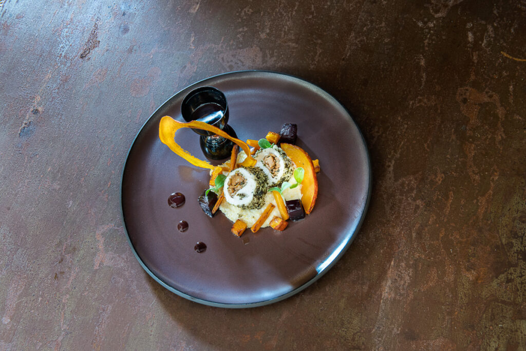 Mit Eierschwammerl gefüllte Hühnerroulade im Kürbiskernmantel
