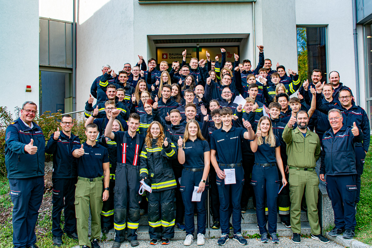 Die Ausbilder und Bezirks-Feuerwehrkommandant OBR Ing. Johannes Enzenhofer gratulierten allen Teilnehmer*innen zum positiven Abschluss dieses “Grundlehrgangs”, welcher sie ab sofort zum Ausrücken bei Einsätzen in ihren Feuerwehren berechtigt.