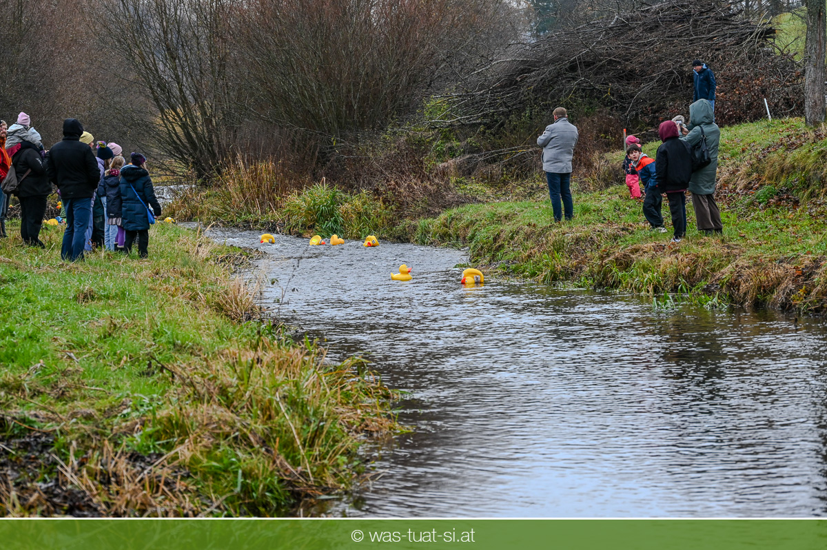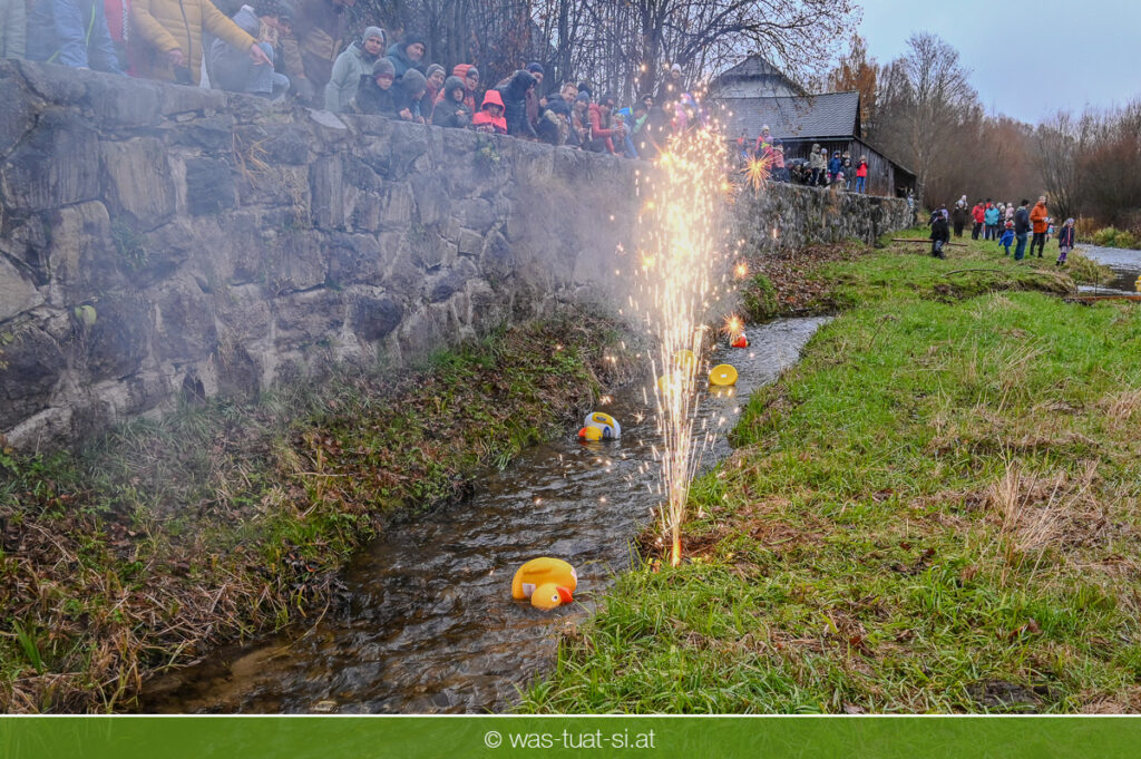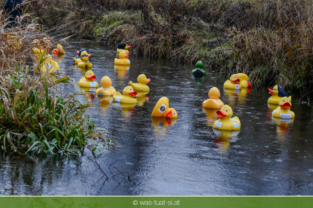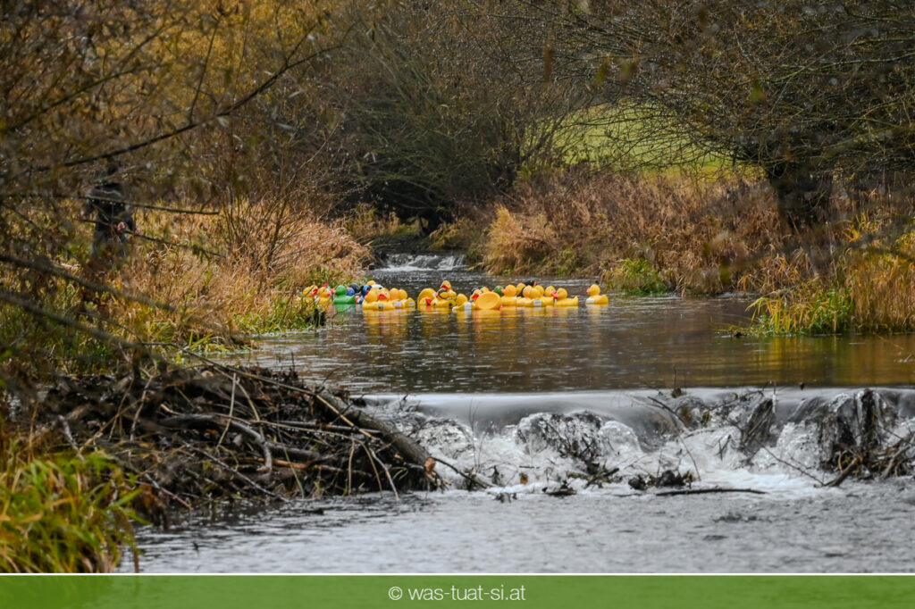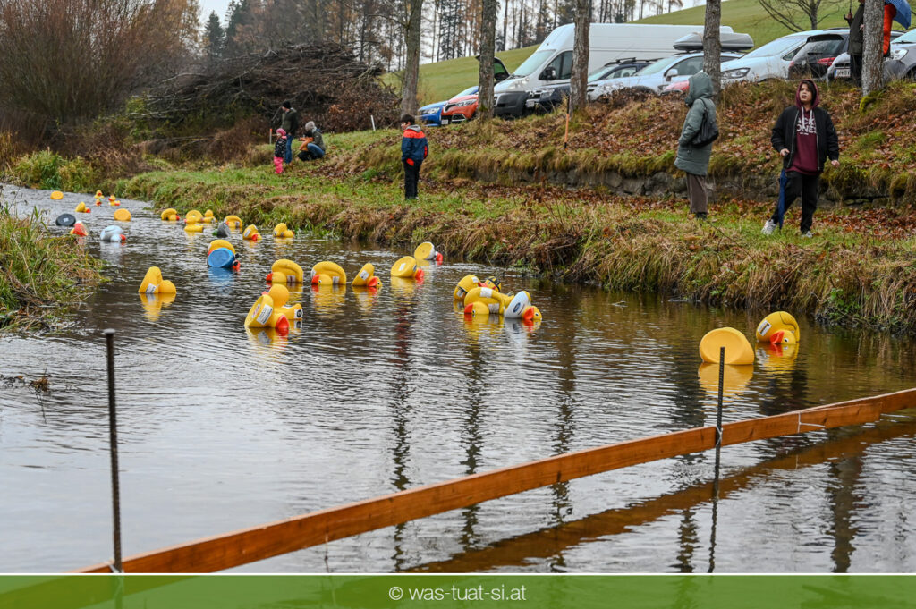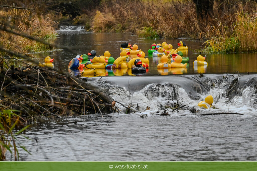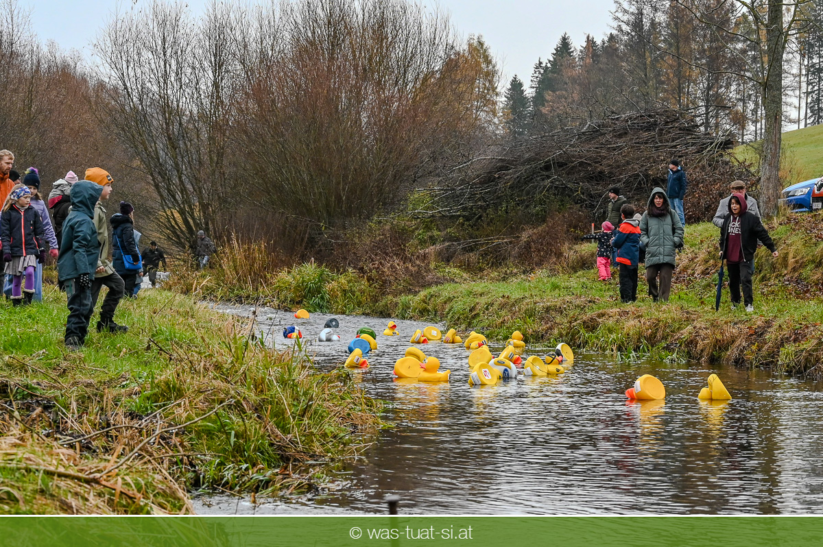 Beim traditionellen Ganslrennen in Zwettl an der Rodl verwandelte sich der Bachlauf in ein buntes Entenrennen. Mehr als 20 gelbe Gummientchen wurden zu Wasser gelassen und kämpften sich durch Strömungen und Bieberbauten, während zahlreiche Zuschauer das Spektakel vom Ufer aus verfolgten.