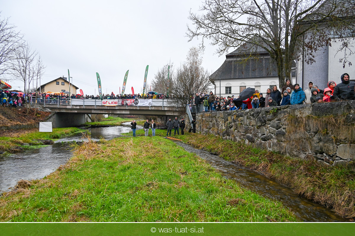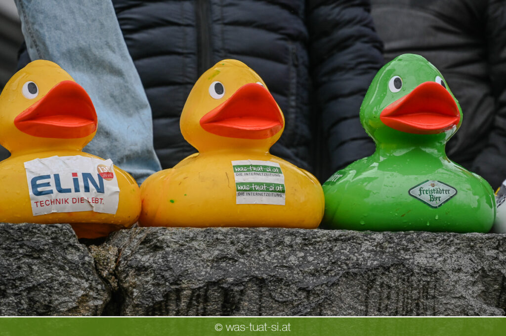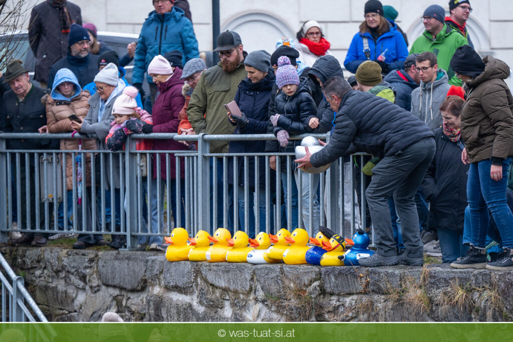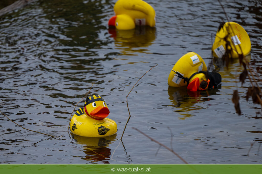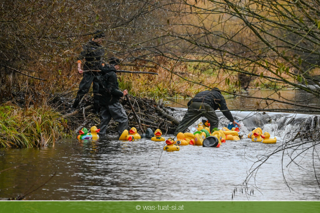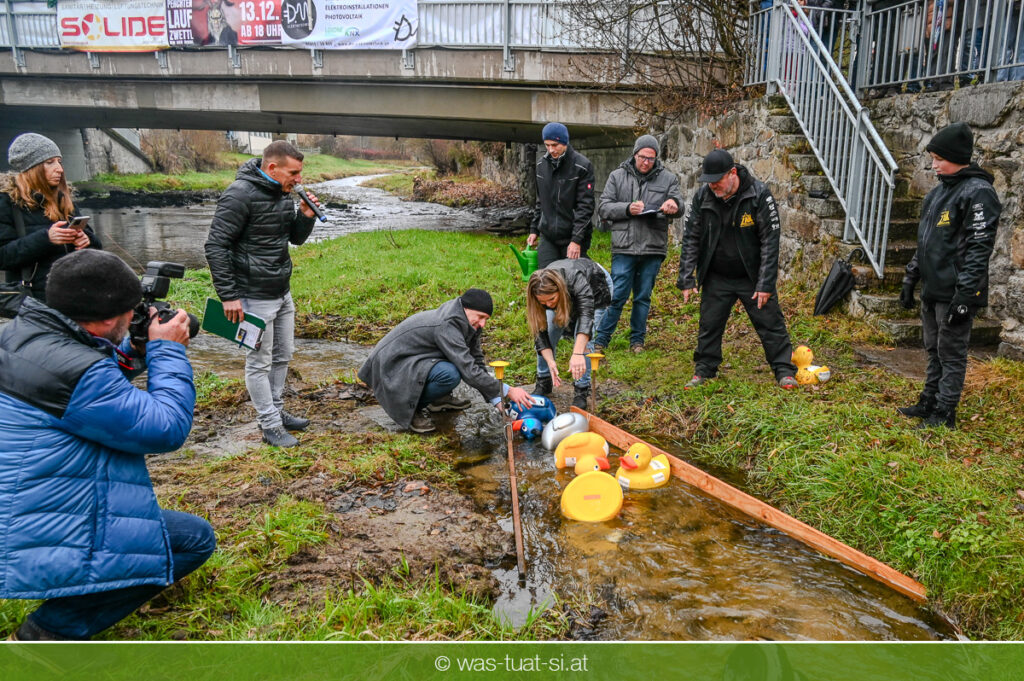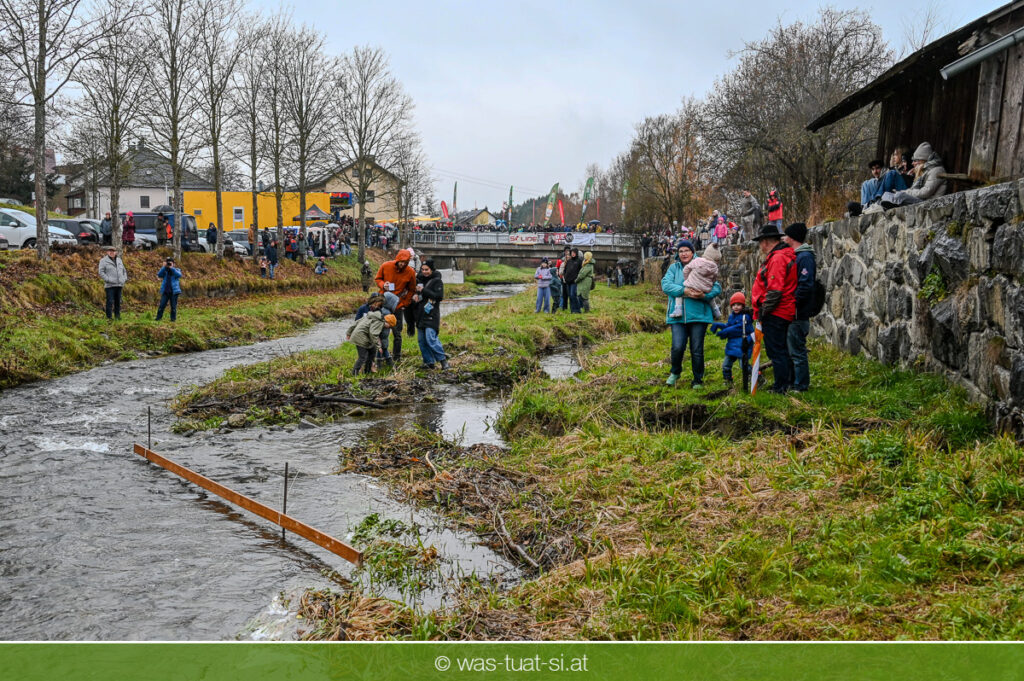 Beim traditionellen Ganslrennen in Zwettl an der Rodl verwandelte sich der Bachlauf in ein buntes Entenrennen. Mehr als 20 gelbe Gummientchen wurden zu Wasser gelassen und kämpften sich durch Strömungen und Bieberbauten, während zahlreiche Zuschauer das Spektakel vom Ufer aus verfolgten.