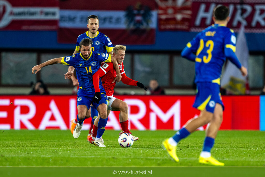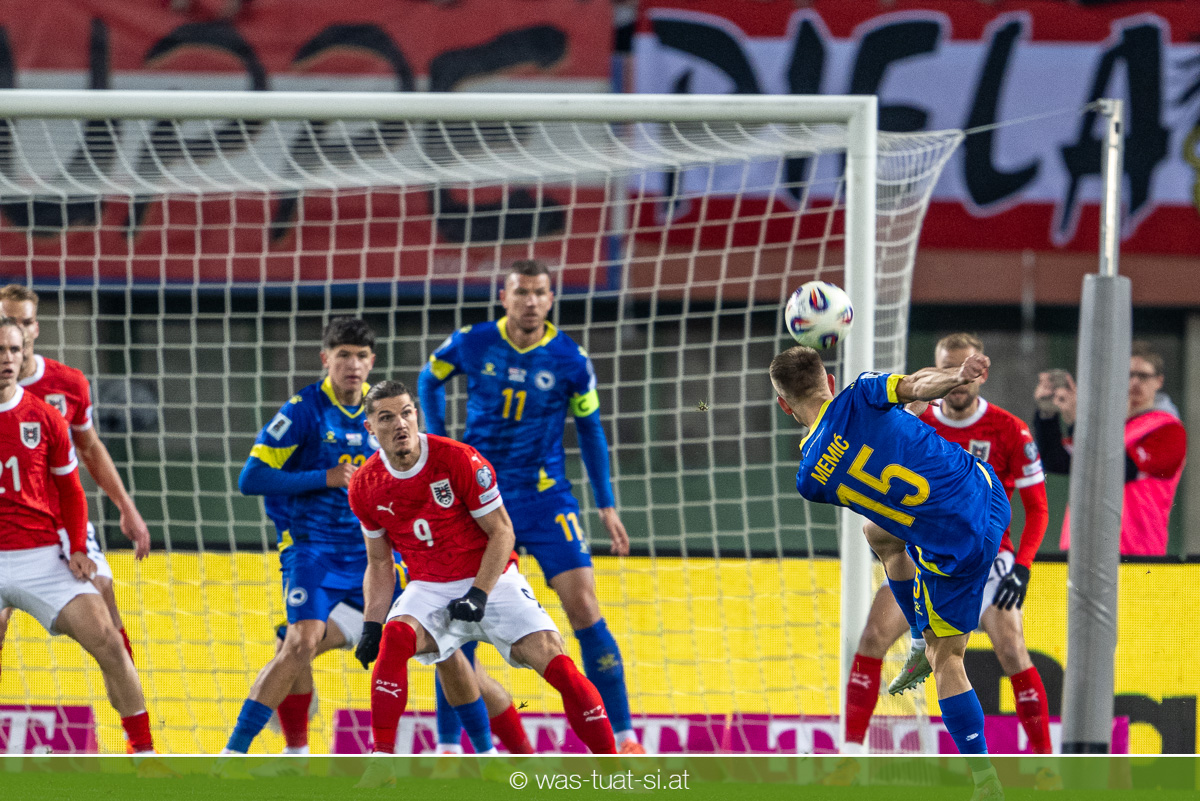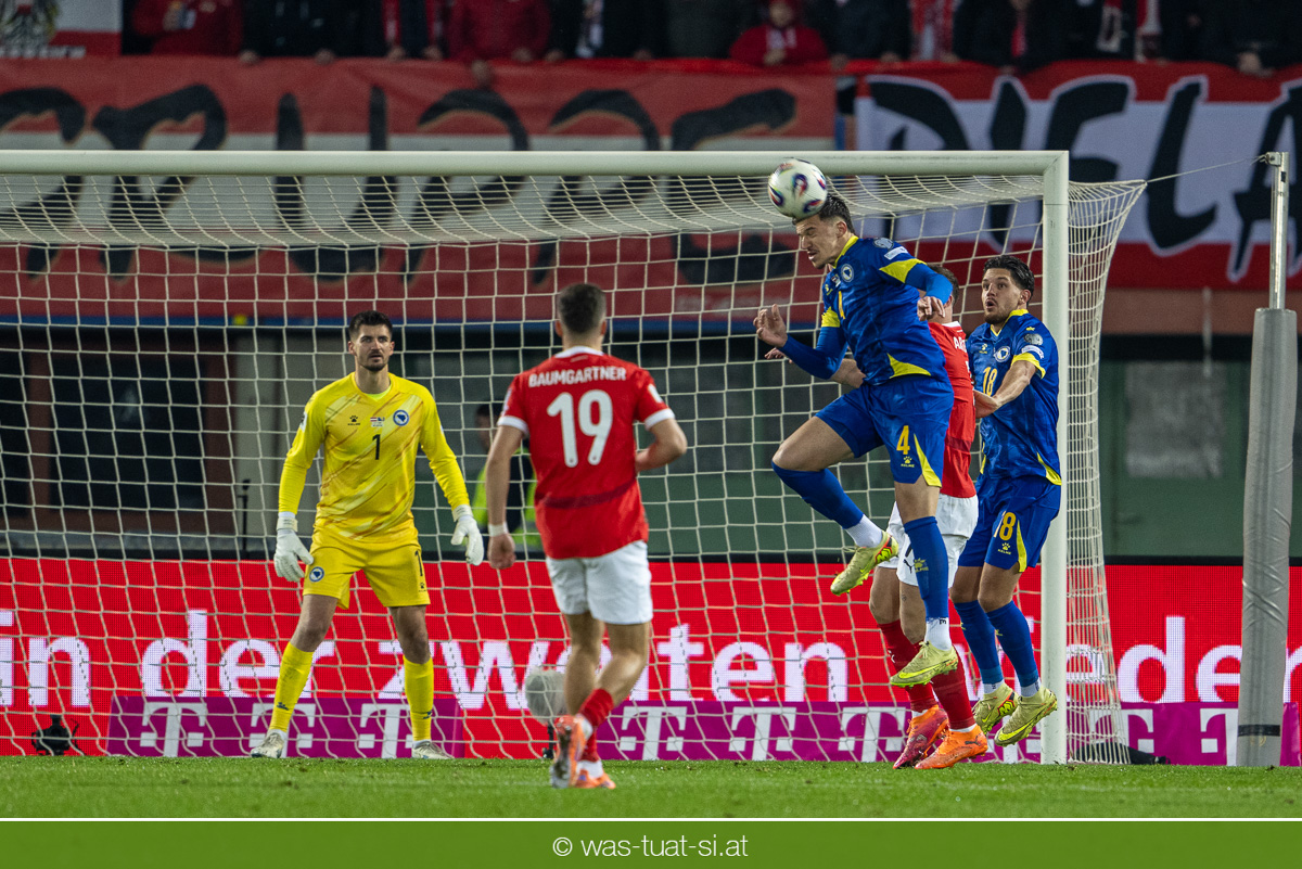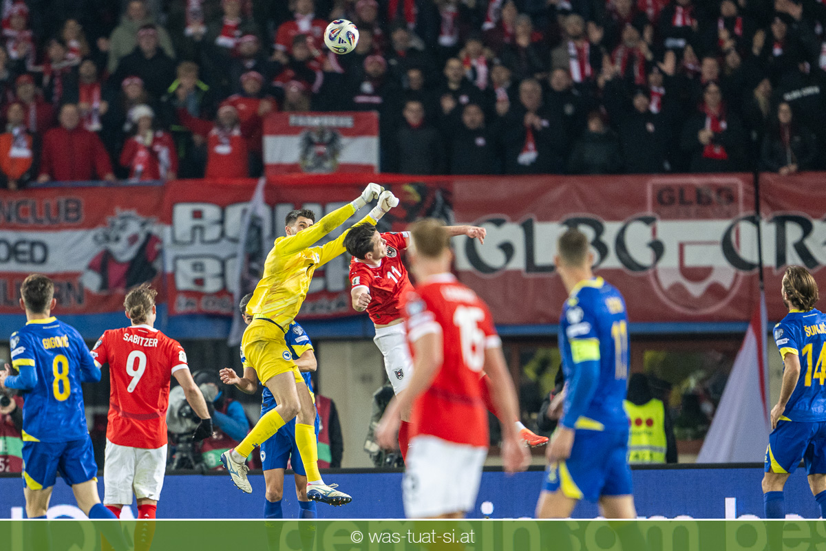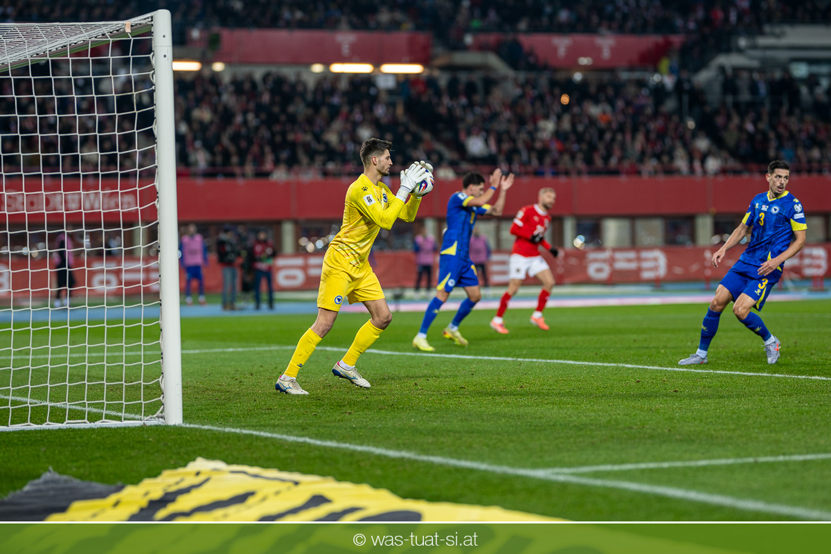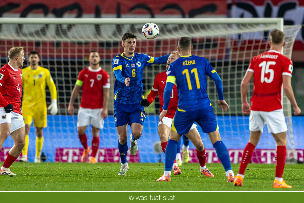 Auf der Gegenseite haben die Bosnier in der 11. Minute ihre erste Chance und die Gäste präsentieren sich effizient. Ein Bajraktarevic-Schuss wird zum Corner abgeblockt. Der erste Corner wird zu einem zweiten abgewehrt und dieser bringt Bosnien in Front. Nach einer Faustabwehr von Schlager kommt Amar Memic am Strafraum zum Schuss. Der Aufsetzer landet im Fünfmeterraum bei Haris Tabakovic, der schneller reagiert als die österreichische Defensive und den Ball zur frühen bosnischen Führung einköpft (12.). Österreich ist nach dem Gegentreffer gleich um eine Antwort bemüht, die bosnische Defensive steht aber tief und kompakt und lässt keine echte Ausgleichschance zu. Nach einer schönen Kombination hat Wimmer auf dem rechten Flügel Platz, seine Hereingabe fängt Vasilj im Tor der Gäste ab (27.). Die bis dahin beste Kombination des Spiels schließt Nicolas Seiwald aus 16 Metern mit einem schönen Schuss ab, aber Vasilj ist wieder zur Stelle und verhindert den Ausgleich (35.). Es folgt gleich die nächste Möglichkeit hinterher. Marcel Sabitzer scheitert mit seinem Versuch aus spitzem Winkel jedoch ebenfalls an Vasilj (37.). Und die Schlussoffensive der ÖFB-Auswahl wird in der 43. Minute vermeintlich mit dem verdienten Ausgleich durch Konrad Laimer belohnt. Nach VAR-Intervention wird das Tor jedoch aberkannt. Österreich geht mit dem 0:1-Rückstand in die Kabine.