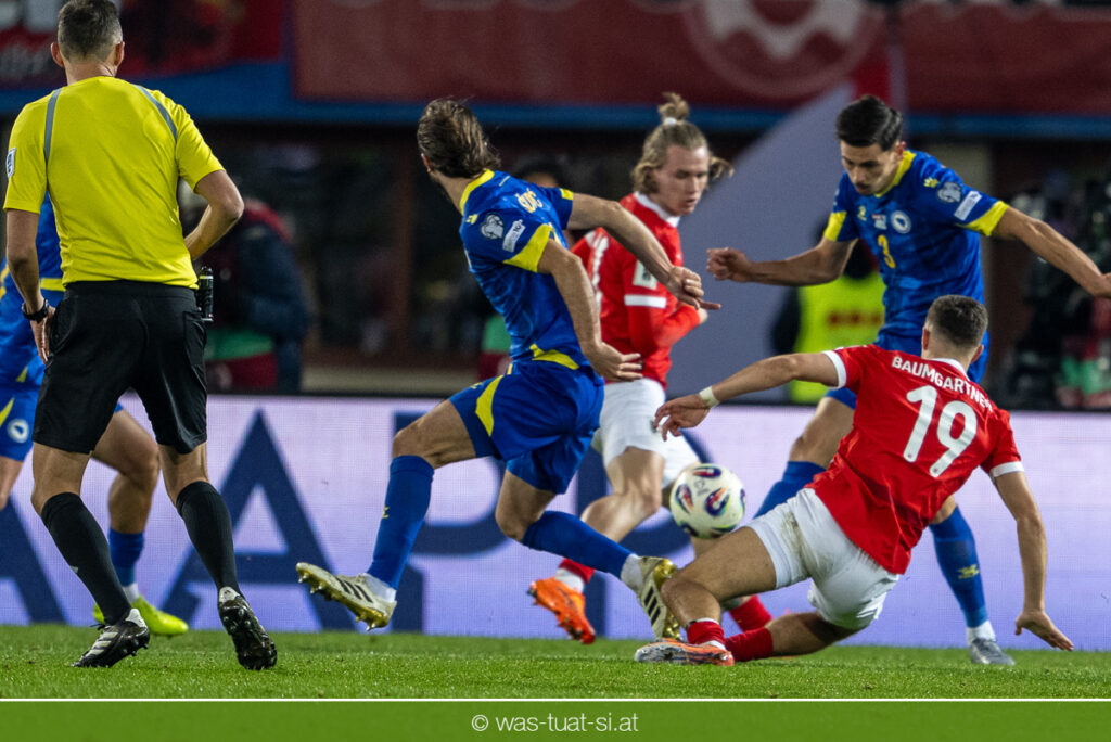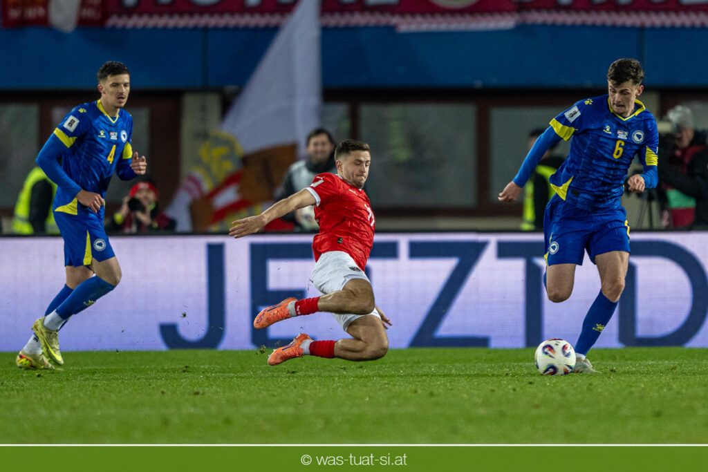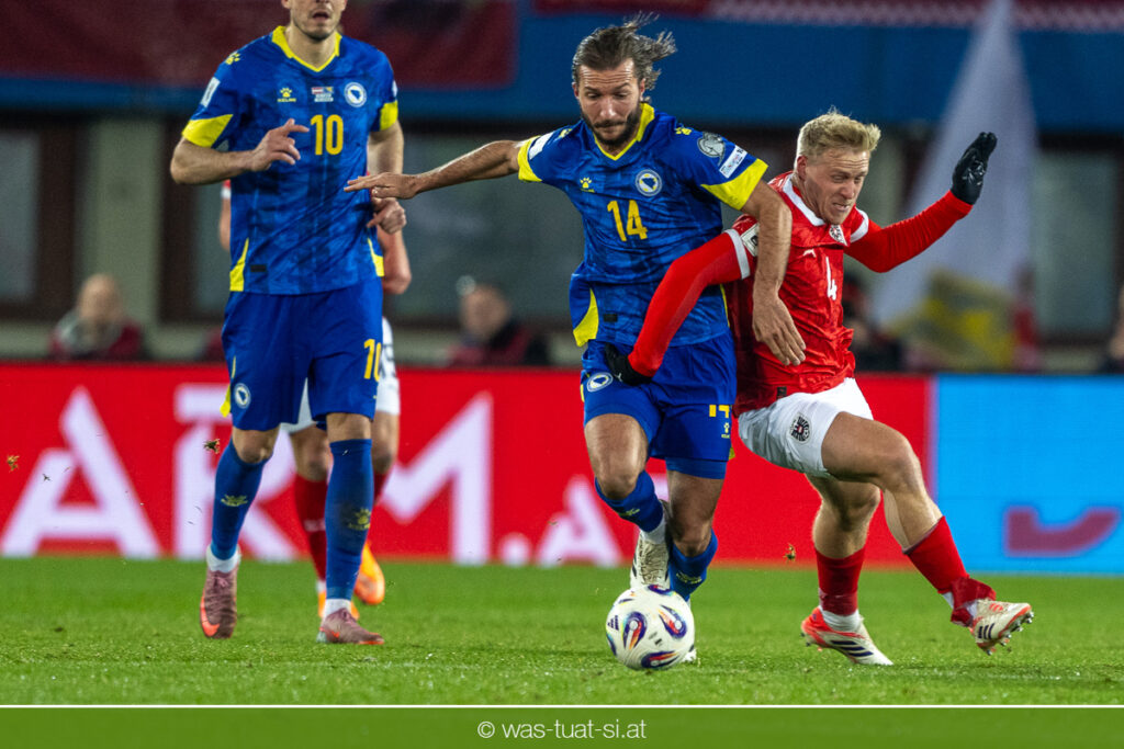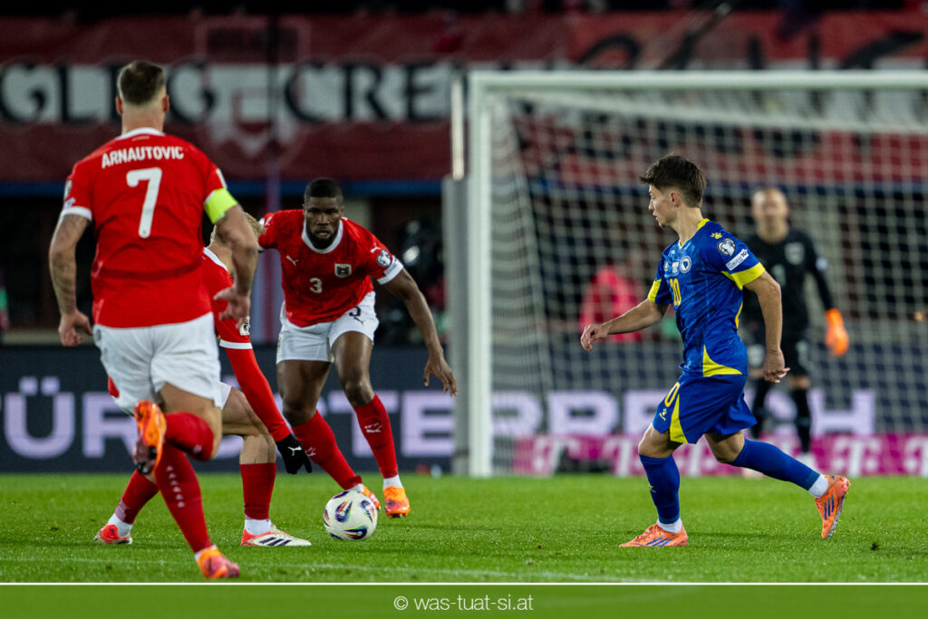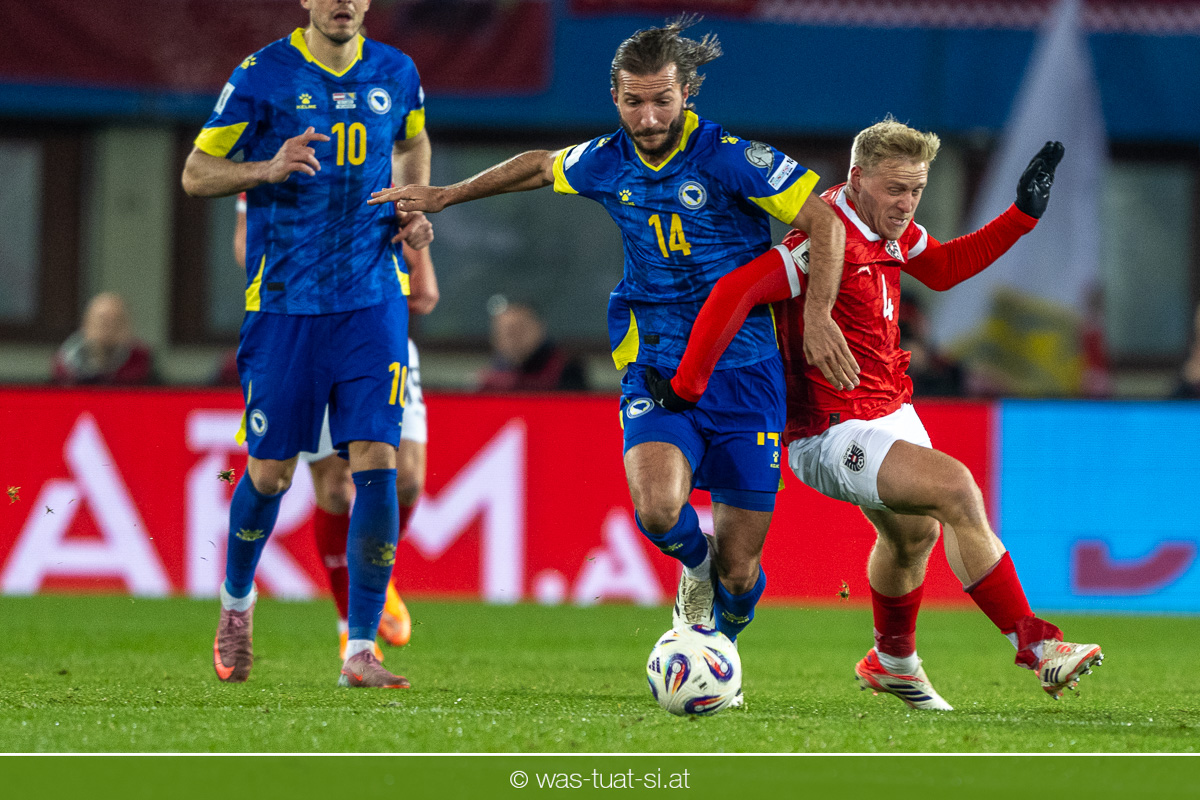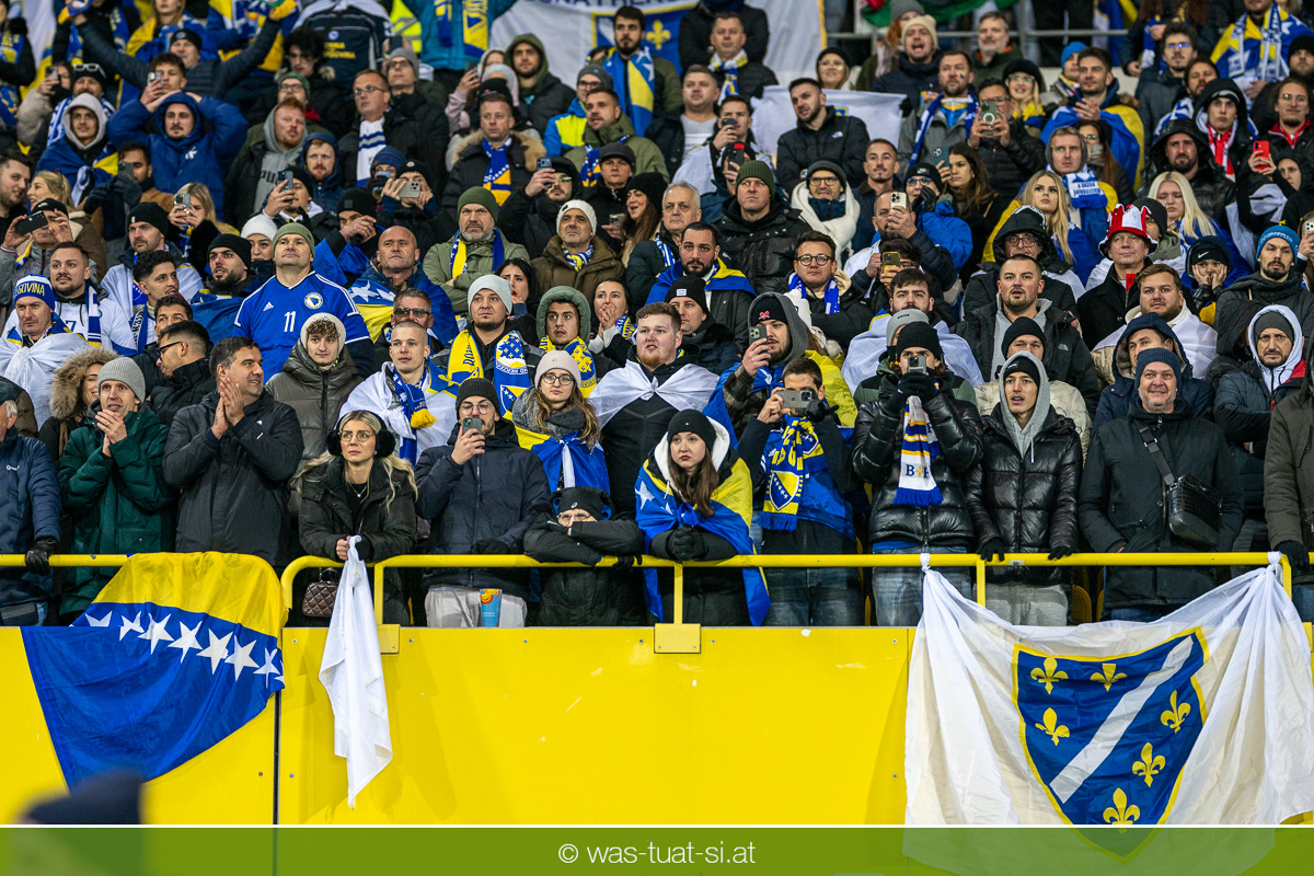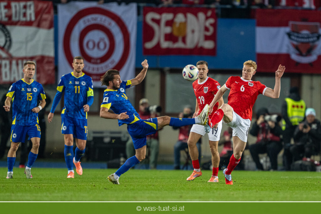 Auf der Gegenseite haben die Bosnier in der 11. Minute ihre erste Chance und die Gäste präsentieren sich effizient. Ein Bajraktarevic-Schuss wird zum Corner abgeblockt. Der erste Corner wird zu einem zweiten abgewehrt und dieser bringt Bosnien in Front. Nach einer Faustabwehr von Schlager kommt Amar Memic am Strafraum zum Schuss. Der Aufsetzer landet im Fünfmeterraum bei Haris Tabakovic, der schneller reagiert als die österreichische Defensive und den Ball zur frühen bosnischen Führung einköpft (12.). Österreich ist nach dem Gegentreffer gleich um eine Antwort bemüht, die bosnische Defensive steht aber tief und kompakt und lässt keine echte Ausgleichschance zu. Nach einer schönen Kombination hat Wimmer auf dem rechten Flügel Platz, seine Hereingabe fängt Vasilj im Tor der Gäste ab (27.). Die bis dahin beste Kombination des Spiels schließt Nicolas Seiwald aus 16 Metern mit einem schönen Schuss ab, aber Vasilj ist wieder zur Stelle und verhindert den Ausgleich (35.). Es folgt gleich die nächste Möglichkeit hinterher. Marcel Sabitzer scheitert mit seinem Versuch aus spitzem Winkel jedoch ebenfalls an Vasilj (37.). Und die Schlussoffensive der ÖFB-Auswahl wird in der 43. Minute vermeintlich mit dem verdienten Ausgleich durch Konrad Laimer belohnt. Nach VAR-Intervention wird das Tor jedoch aberkannt. Österreich geht mit dem 0:1-Rückstand in die Kabine.
