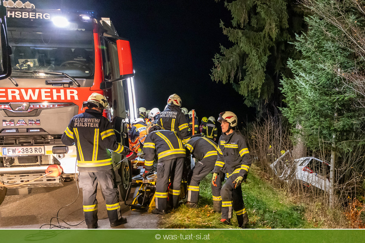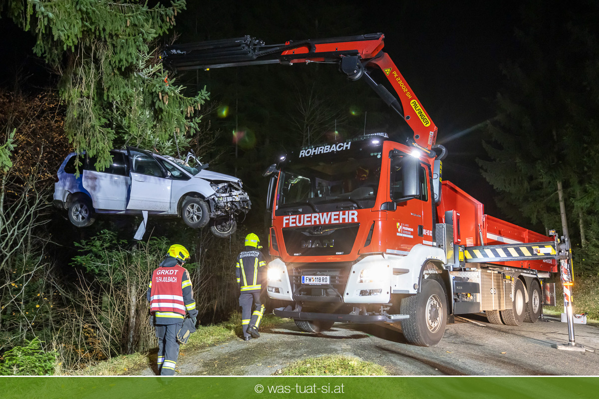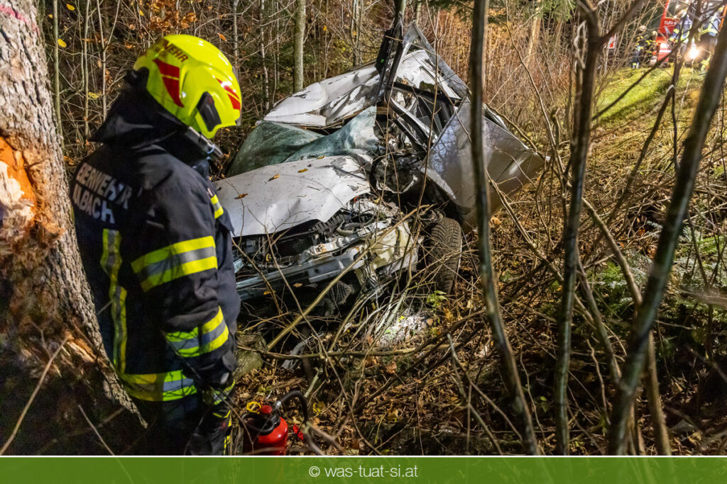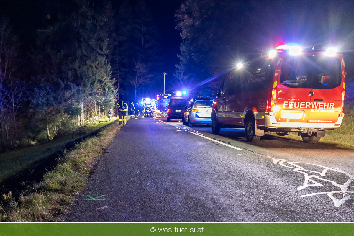 Am Freitagabend, kam es im Gemeindegebiet von Julbach (Bezirk Rohrbach) zu einem folgenschweren Verkehrsunfall. Aus bislang ungeklärter Ursache verlor ein Autofahrer die Kontrolle über sein Fahrzeug, kam von der Fahrbahn ab und krachte frontal gegen einen Baum. Der Lenker wurde dabei im Wrack eingeklemmt. Die Feuerwehren Julbach, Peilstein, Ulrichsberg und Ödenkirchen wurden alarmiert. Die Einsatzleitung übernahm die Feuerwehr Ulrichsberg, die gemeinsam mit der FF Julbach die Menschenrettung durchführte. Nach medizinischer Erstversorgung durch das Rote Kreuz und einen Notarzt wurde der Schwerverletzte ins Krankenhaus gebracht. Zur Bergung des Unfallfahrzeugs wurde die FF Rohrbach mit dem Wechselladefahrzeug (WLF) hinzugezogen.