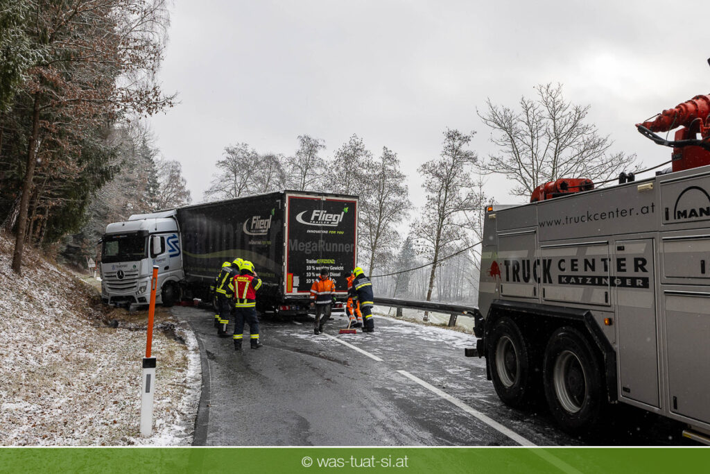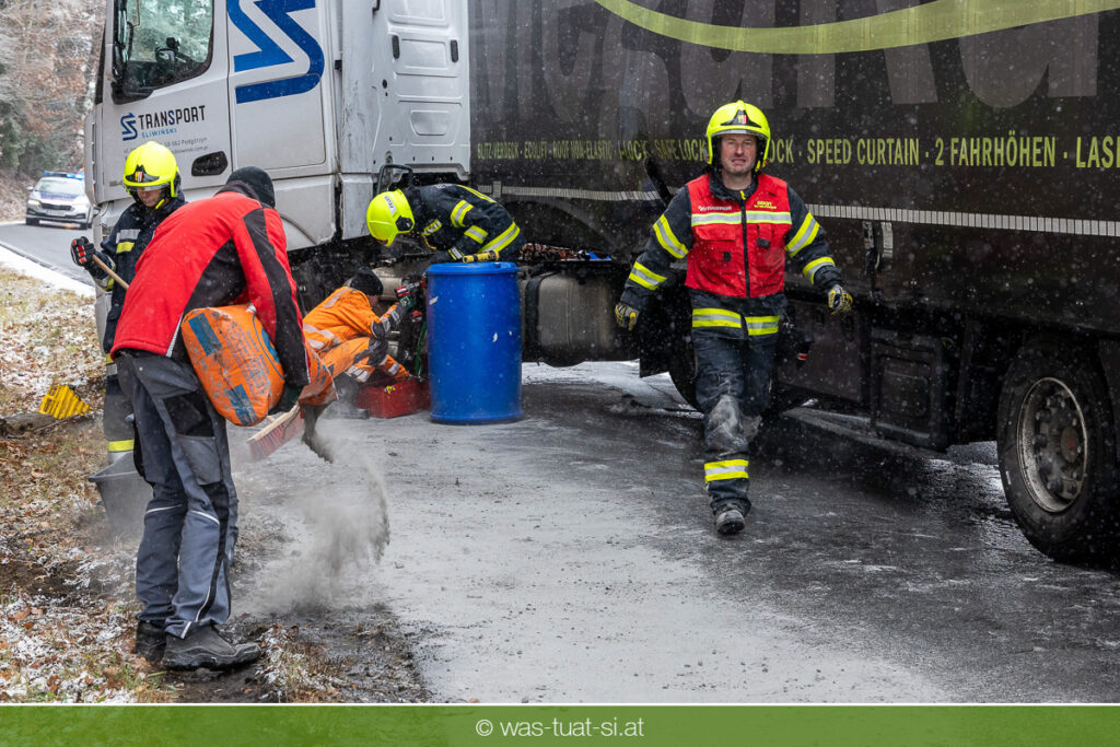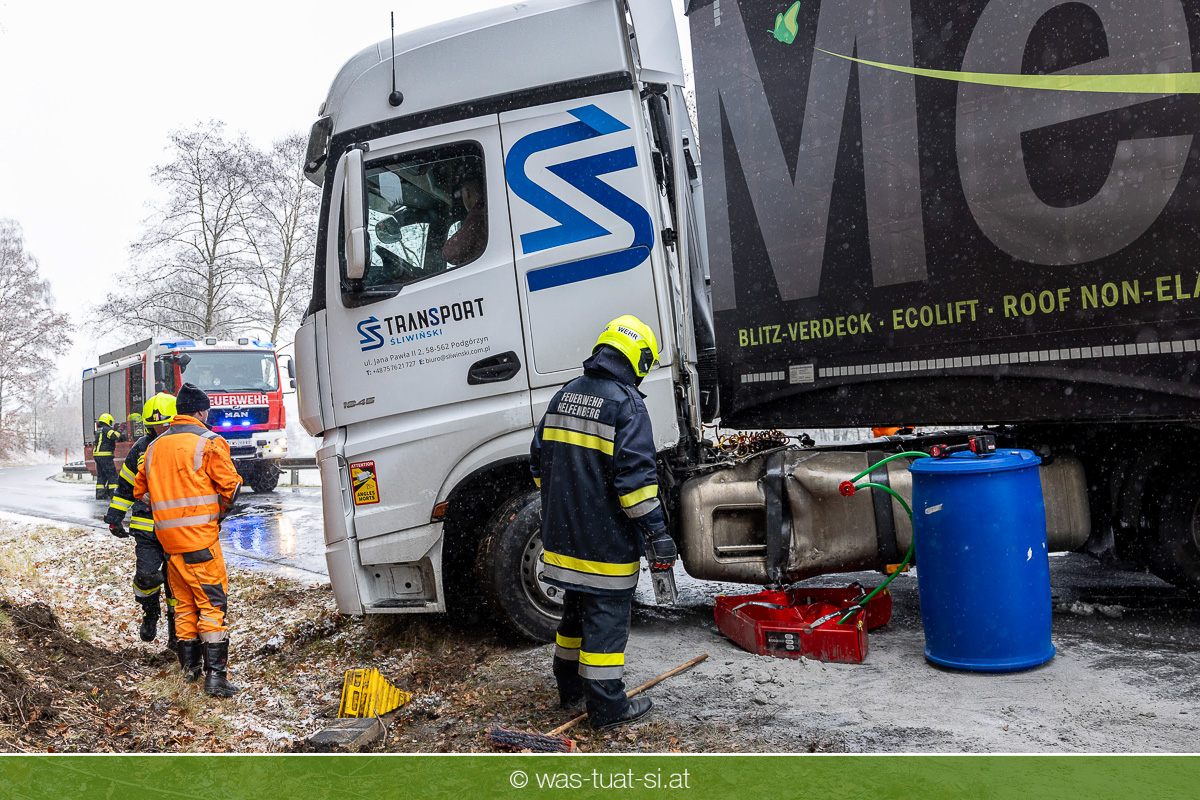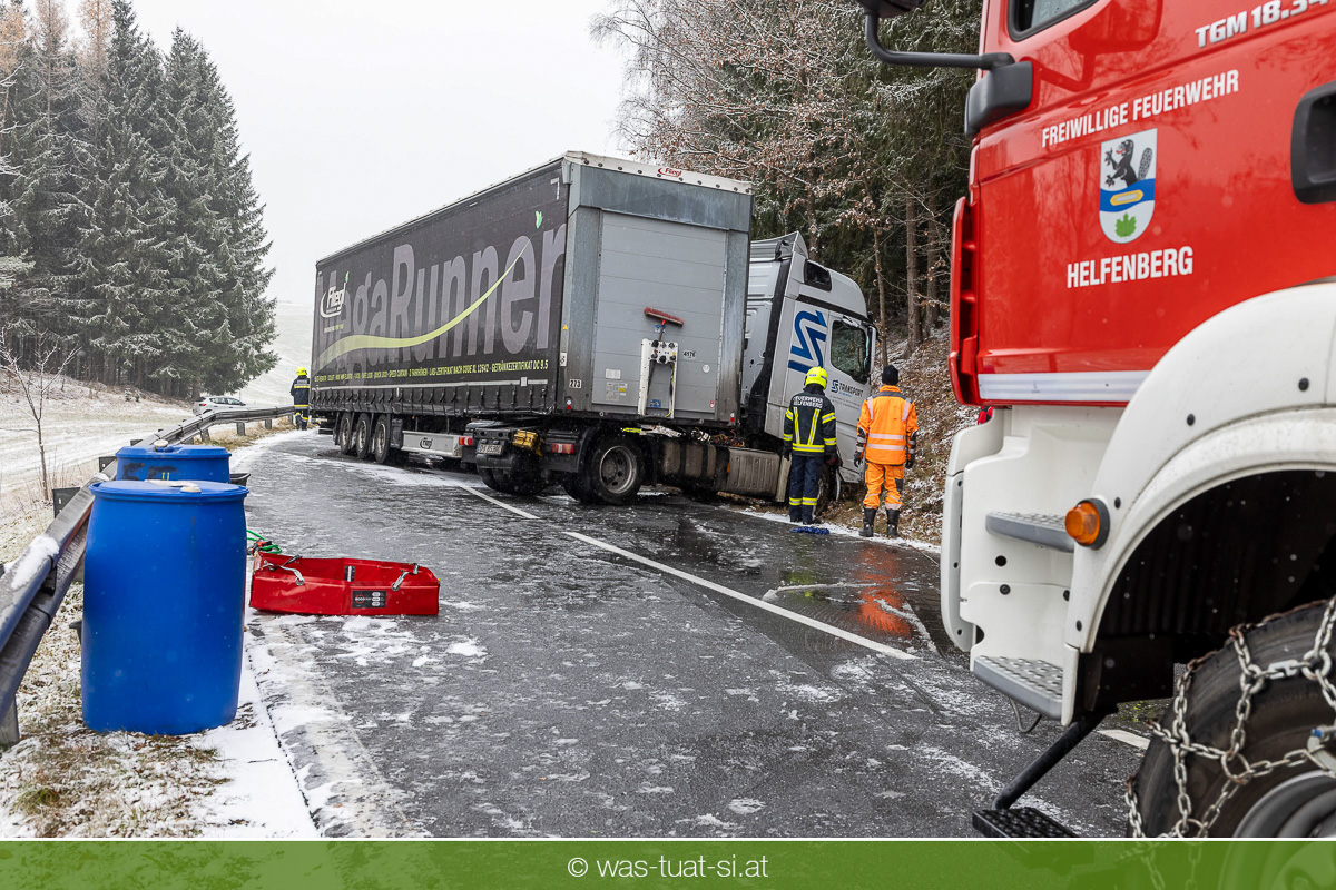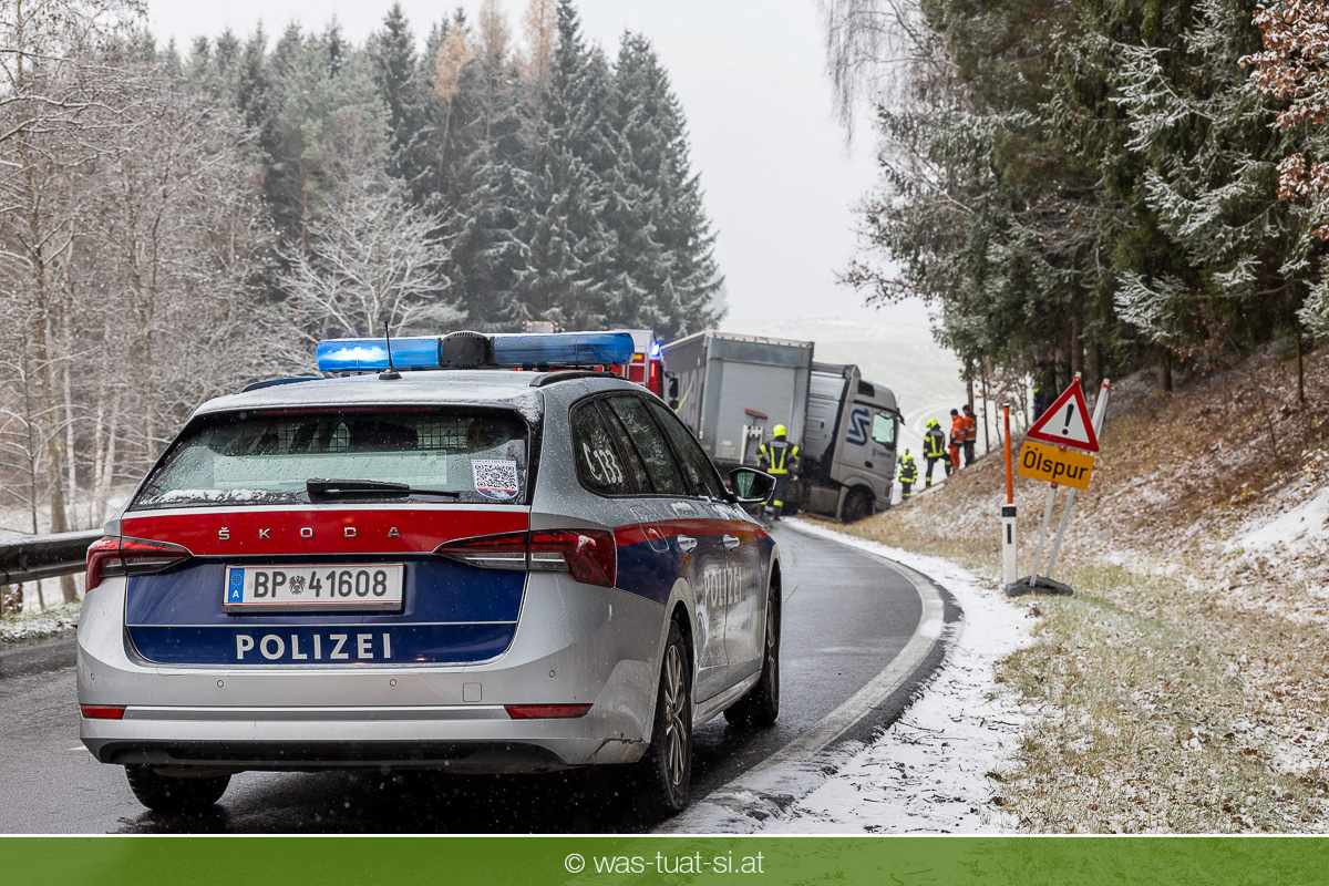 Einsetzender Schneefall machte die Straßen am Donnerstag, dem 20.11.25, gefährlich glatt. Gegen 9:40 Uhr kam es auf der B38 bei Preßleithen zu einem Unfall: Ein LKW rutschte ins Schleudern und blockierte beide Fahrtrichtungen. Dabei wurde der Treibstofftank beschädigt, wodurch größere Mengen Diesel austraten.
