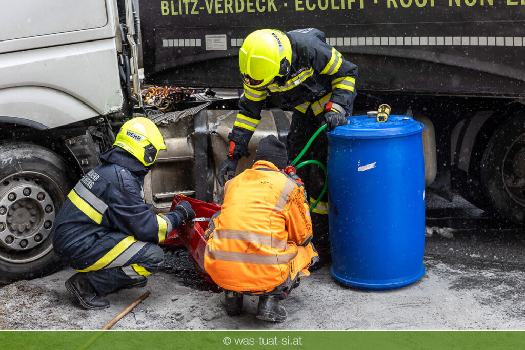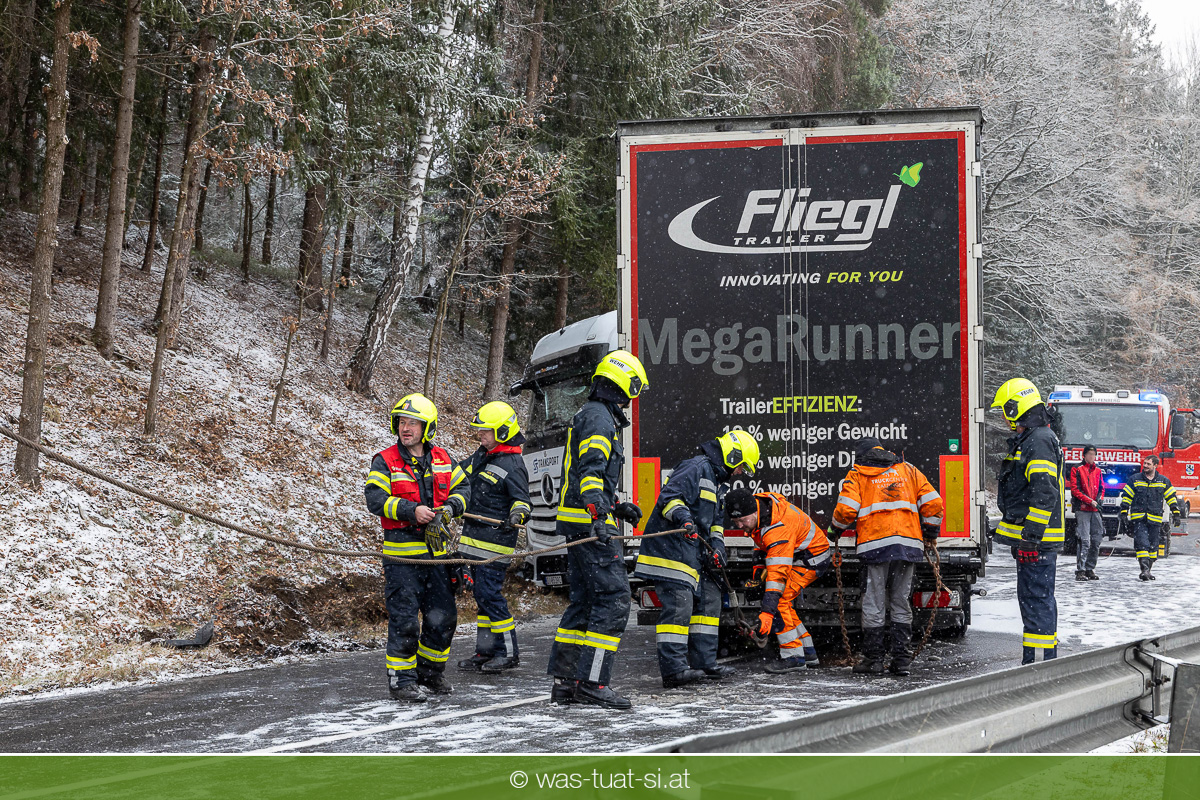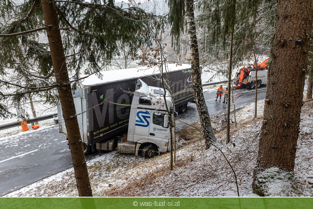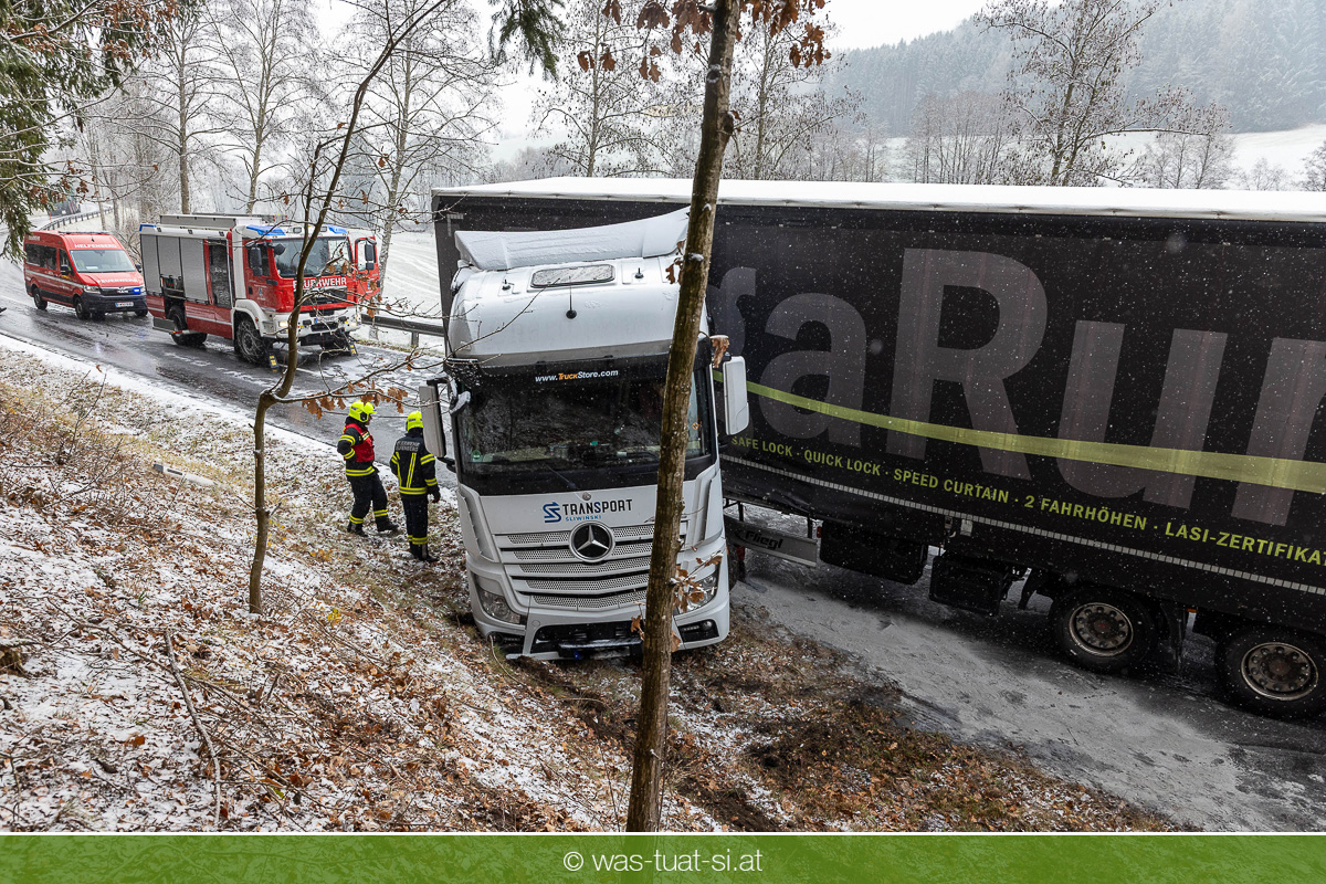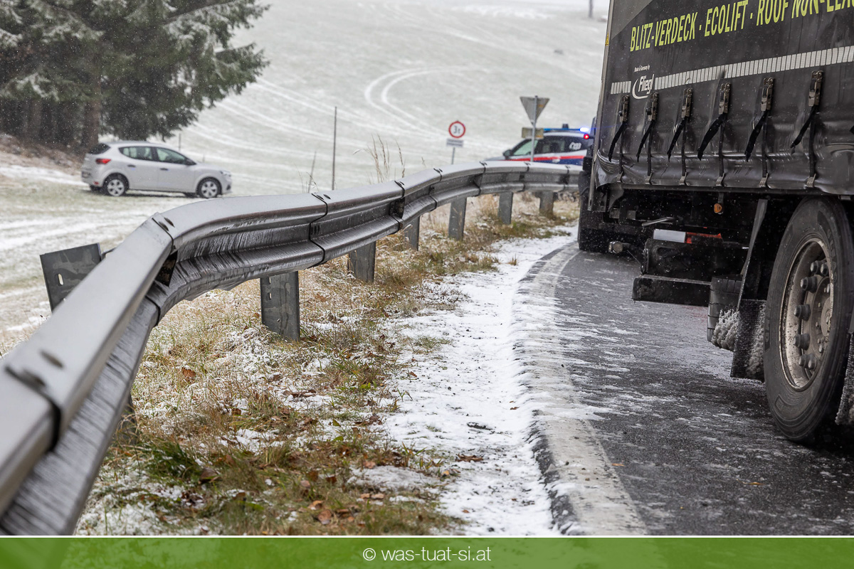 Einsetzender Schneefall machte die Straßen am Donnerstag, dem 20.11.25, gefährlich glatt. Gegen 9:40 Uhr kam es auf der B38 bei Preßleithen zu einem Unfall: Ein LKW rutschte ins Schleudern und blockierte beide Fahrtrichtungen. Dabei wurde der Treibstofftank beschädigt, wodurch größere Mengen Diesel austraten.