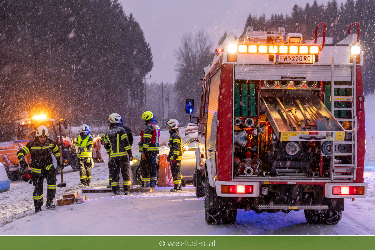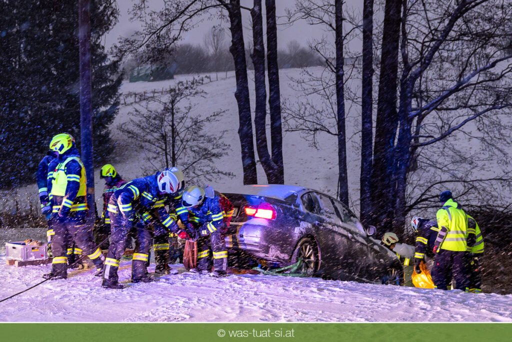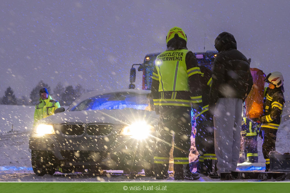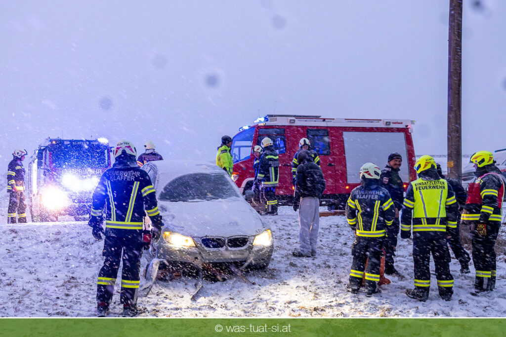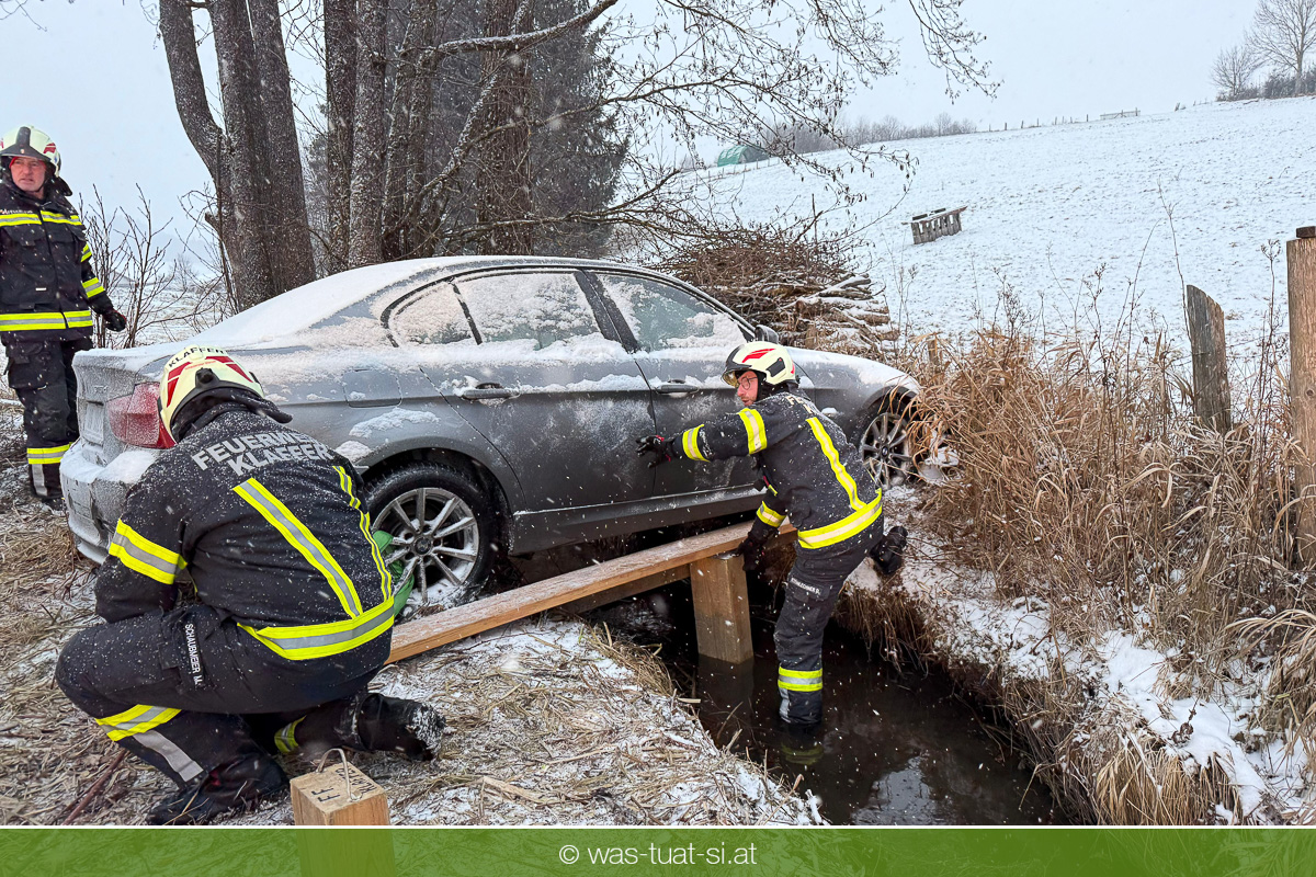 Heute um 16:56 Uhr wurde die FF Klaffer zu einer PKW-Bergung alarmiert. Ein Fahrzeug war bei starkem Schneefall von der Fahrbahn abgekommen und quer über einen Bach zum Stillstand gekommen.