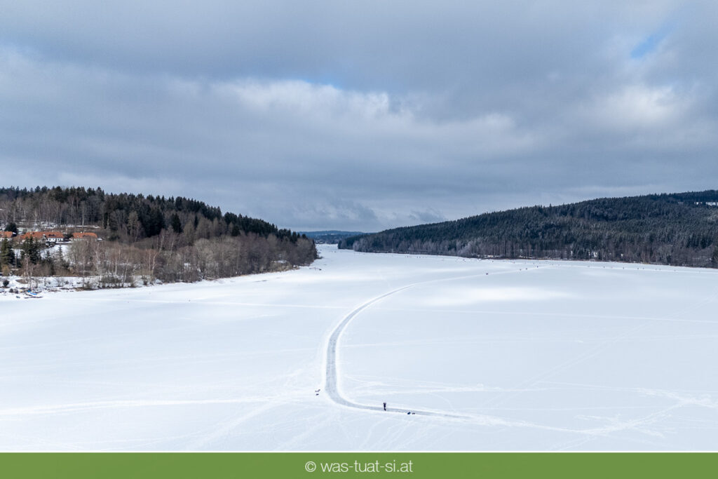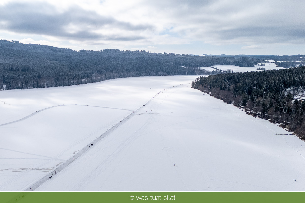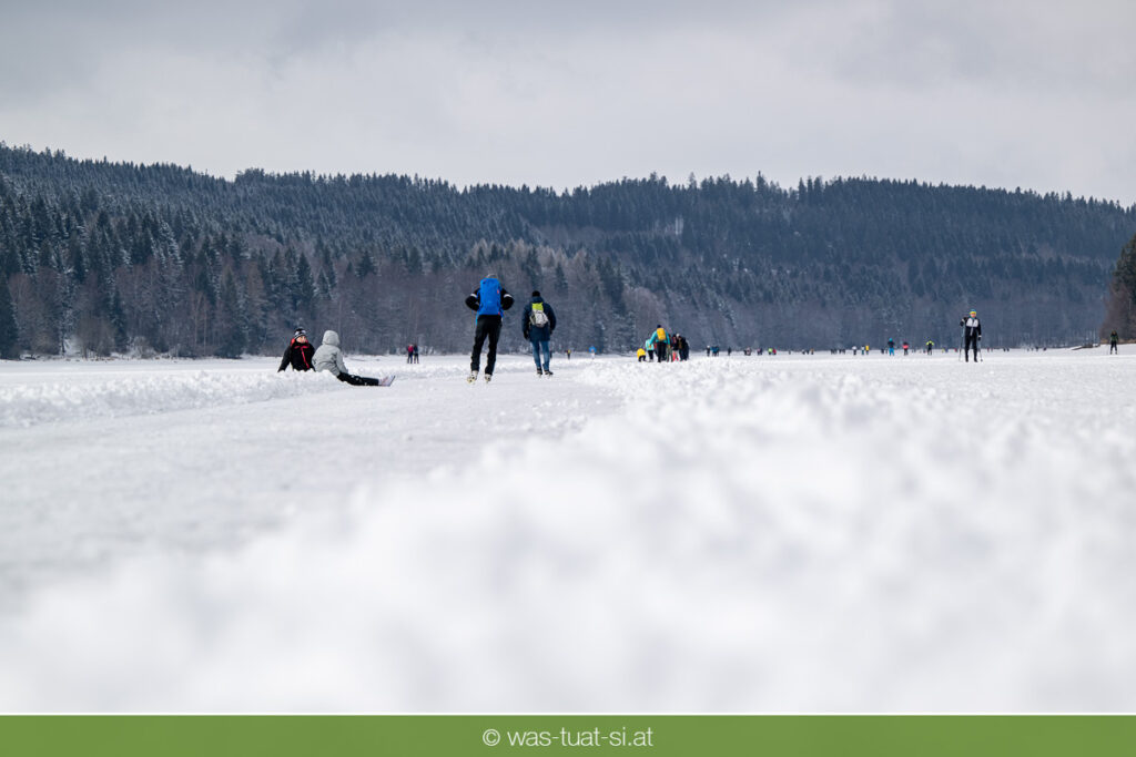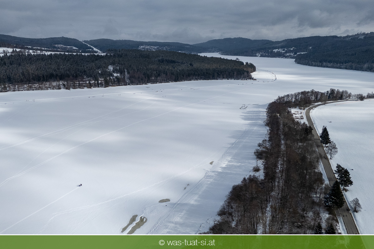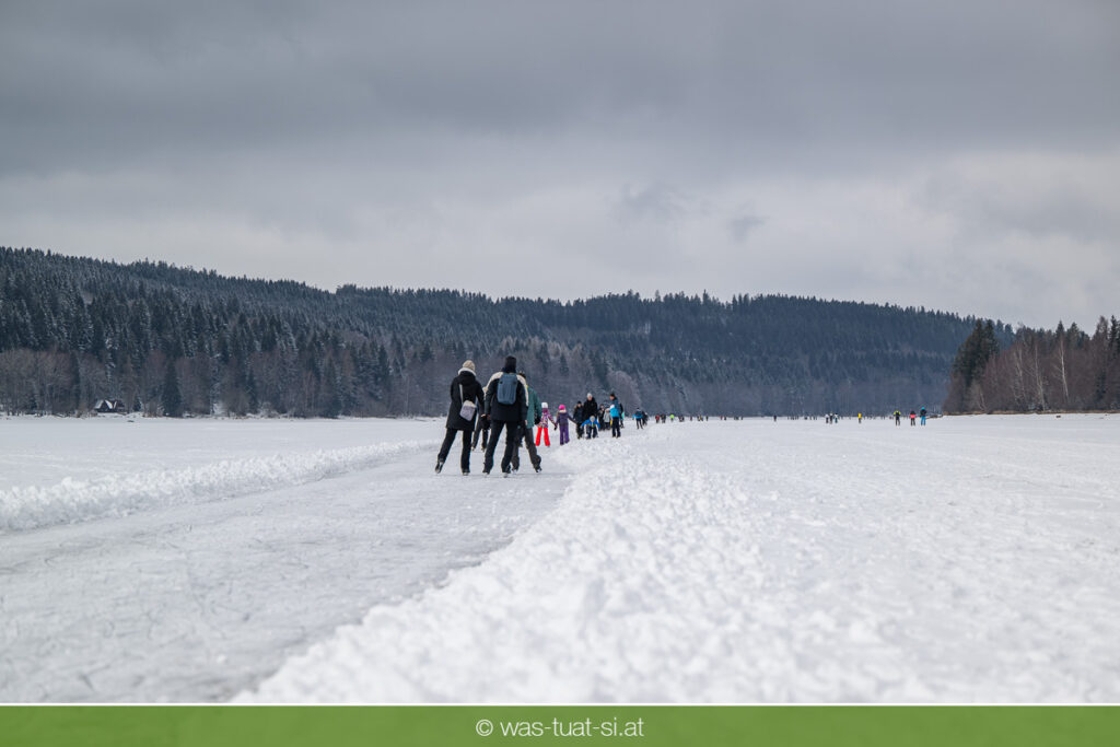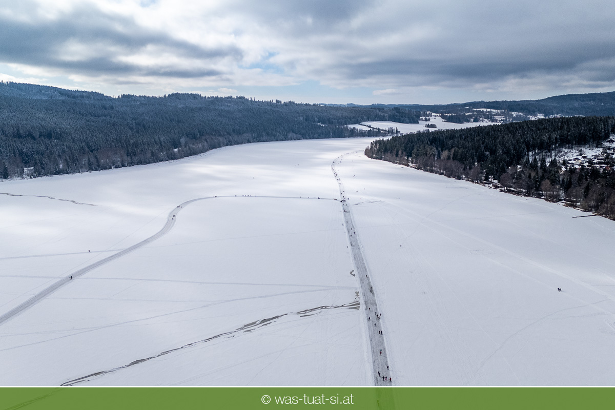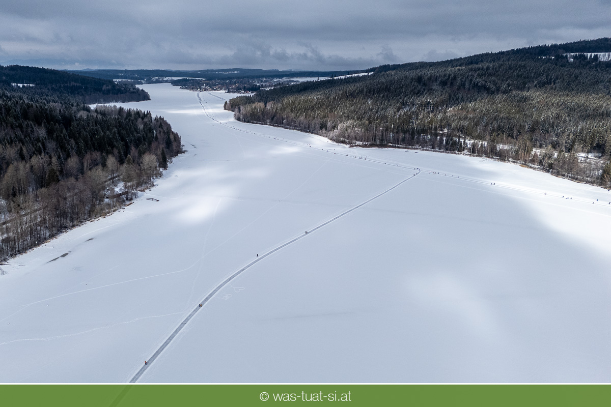 Bis zu 38 Kilometer lang ist die spektakuläre Schlittschuhtrasse auf dem zugefrorenen Lipno-Stausee – bei guten Bedingungen eine der längsten Natureisbahnen. Sie verbindet die Orte Horní Planá und Lipno nad Vltavou und bietet traumhafte Ausblicke und sportlichen Winterspaß. Ob auf Schlittschuhen, Langlaufskiern oder sogar mit dem Mountainbike: Das glatte Eis ist für alle ein Erlebnis. Die größte Wasserfläche der Region friert meist ab Dezember zu. Sobald die Eisdecke dick genug ist, werden sichere Zutrittsstellen markiert und die Bahnen präpariert.