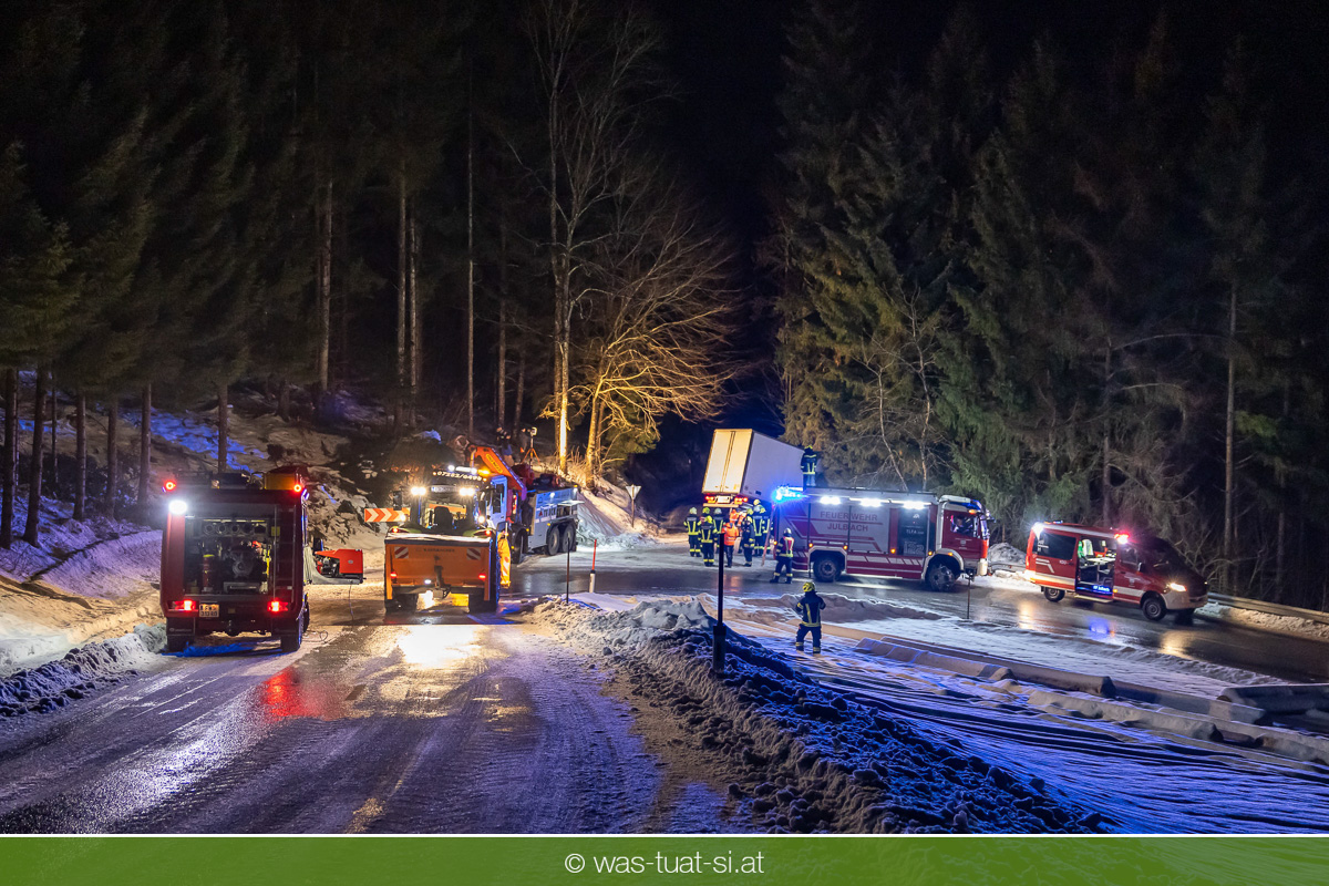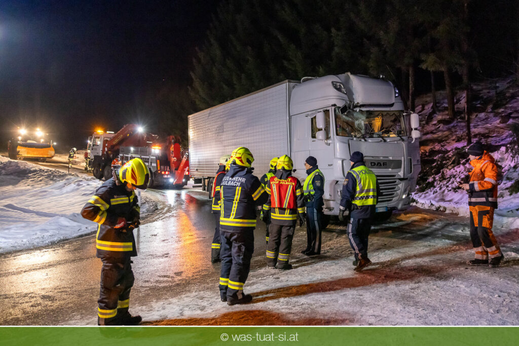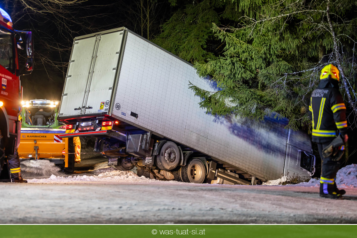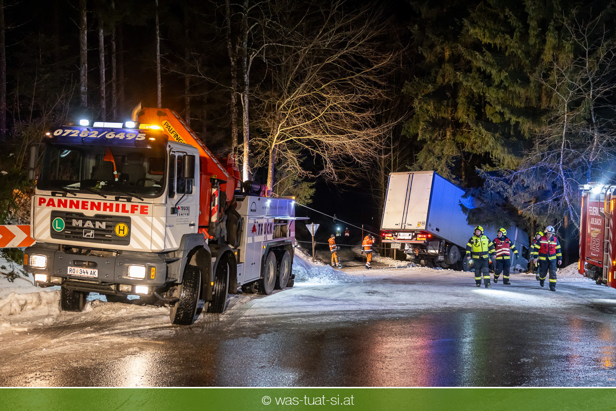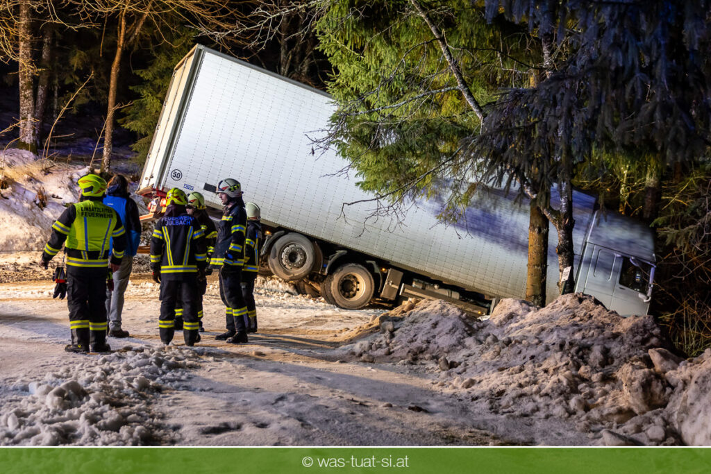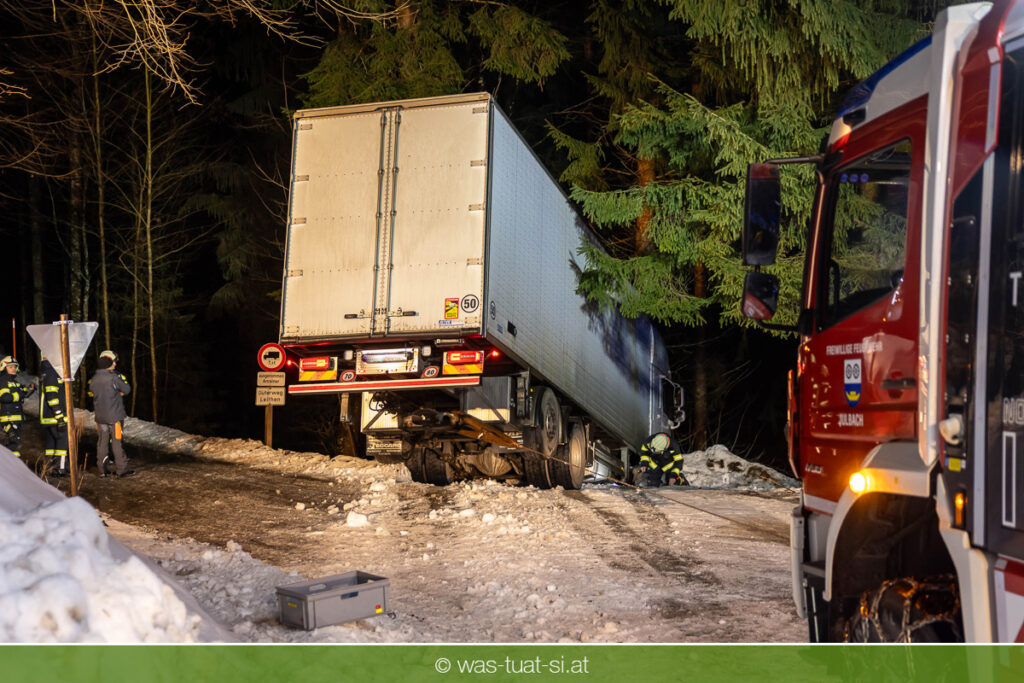 Ein LKW verlor auf der Eisglatter Fahrbahn die Kontrolle und rutschte in den Straßengraben. Die Feuerwehren Hinterschiffl und Julbach wurden umgehend alarmiert und übernahmen gemeinsam die Sicherung der Unfallstelle sowie die Unterstützung bei der aufwendigen Bergung.