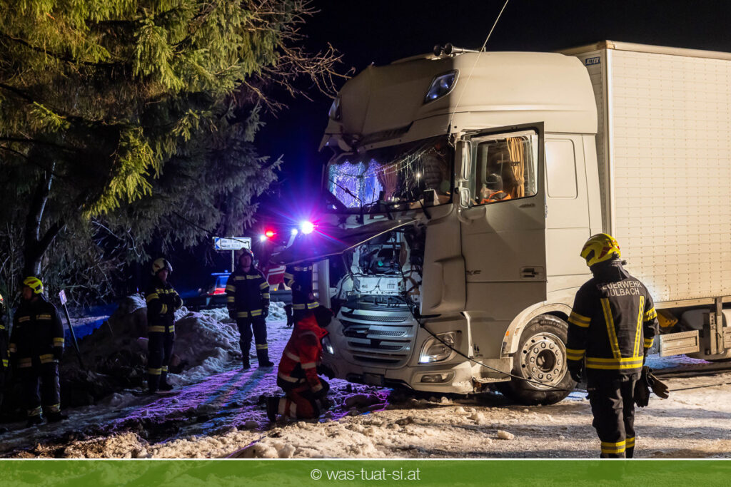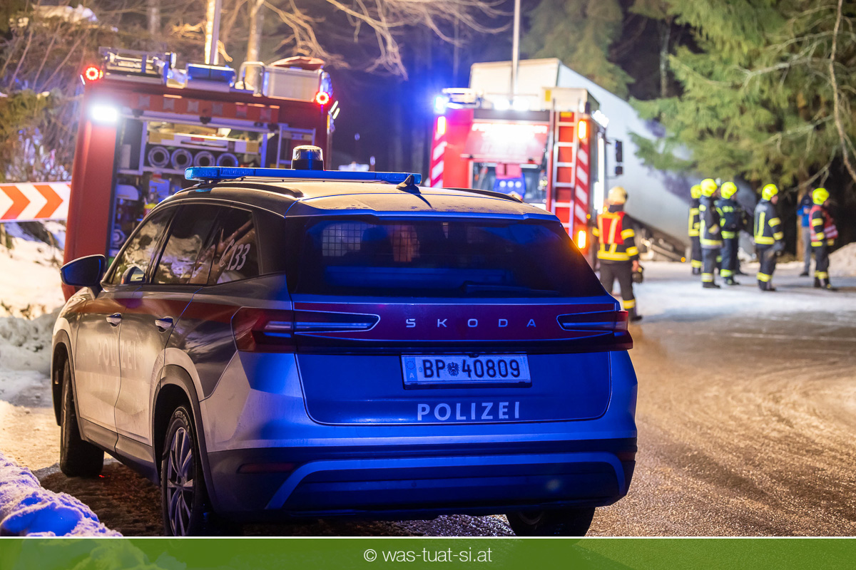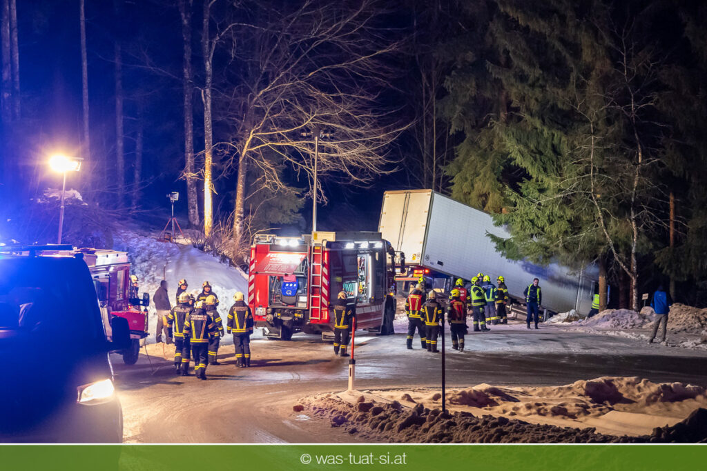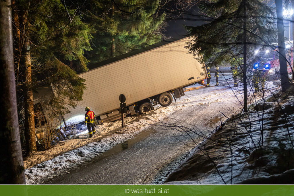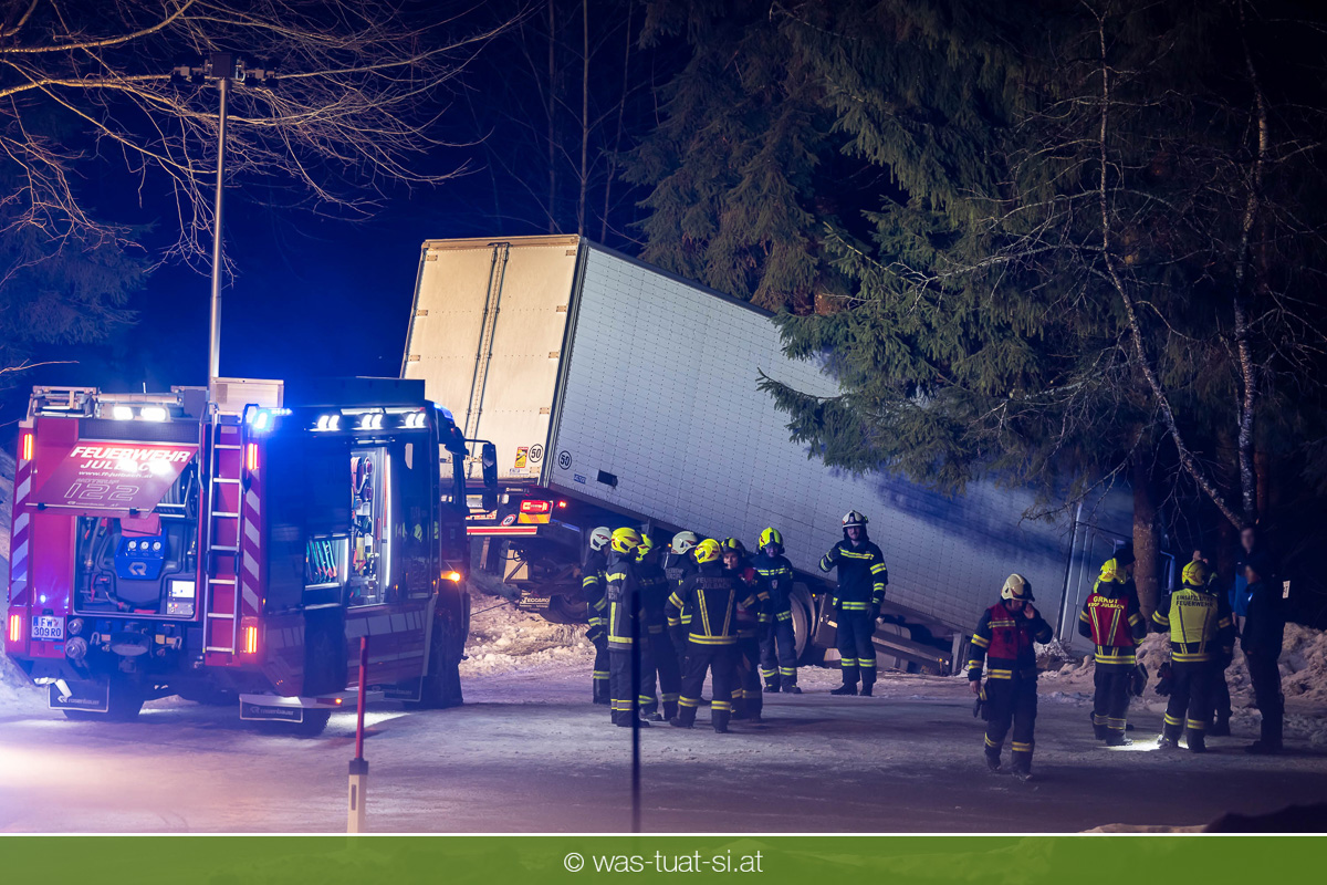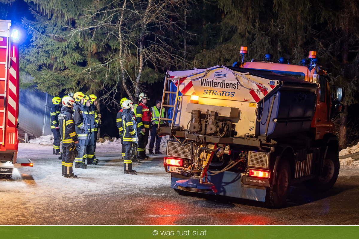 Ein LKW verlor auf der Eisglatter Fahrbahn die Kontrolle und rutschte in den Straßengraben. Die Feuerwehren Hinterschiffl und Julbach wurden umgehend alarmiert und übernahmen gemeinsam die Sicherung der Unfallstelle sowie die Unterstützung bei der aufwendigen Bergung.