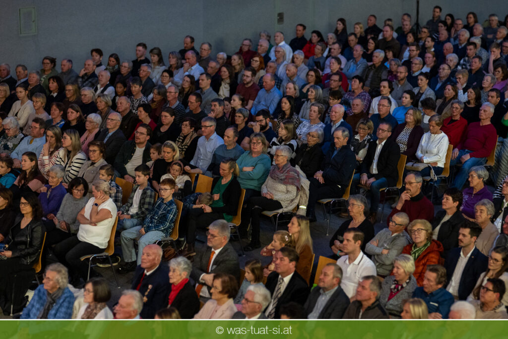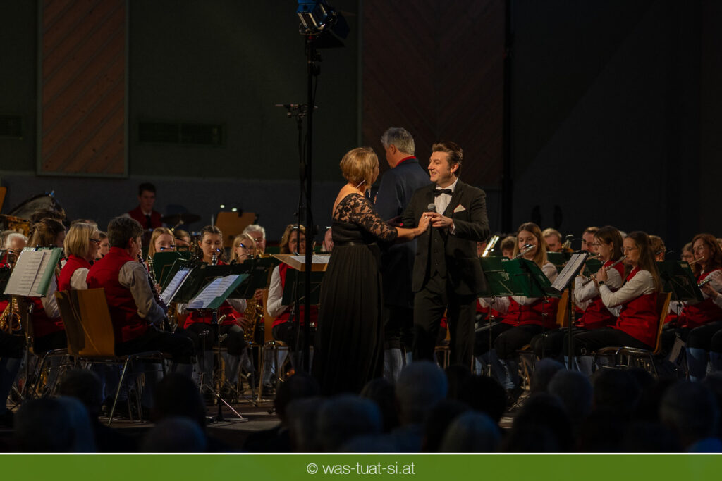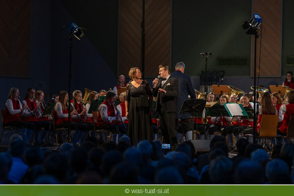 Die beiden Kapellmeister Martin und Christian Dumphart spannten mit ihren 83 Musikern dabei einen abwechlungsreichen musikalischen Spannungsbogen: Bekannte Melodien aus dem Genre der Operette fehlten ebensowenig wie besondere Walzer und Polkas. Speziell im Fokus standen zum Jahresstart aber Schlagermelodien von Peter Alexander und Udo Jürgens: Ehemalige „Gassenhauer“ wie „Hier ist ein Mensch“ oder „Bitte mit Sahne“ nahmen das Publikum auf eine Zeitreise in das goldene Zeitalter des Radios und der Langspielplatten mit. Als „Reiseleiter“ fungierten dabei die beiden Solisten Carina Hohner und Nik Raspotnik, die mit gesanglicher Brillanz, Charme und Esprit zu begeistern vermochten.