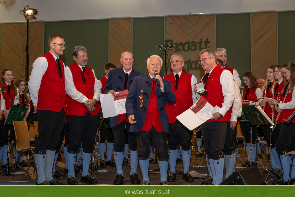 Passend zu den mit „Standing Ovation“ bedachten Schlager-Legenden holten Musikvereinsobmann Wolfgang Hochreiter und Moderatorin Teresa Kaltenberger zwei Leonfeldner Musikerlegenden zu einer besonderen Ehrung auf die Bühne: Ehrenkapellmeister Konsulent Manfred Dumphart und „Vollblutmusiker“ Karl Enzenhofer – er ist inzwischen 90 Jahre alt – wurden für ihre großen Verdienste mit dem Blasmusikverdienstorden in Gold bedacht.
