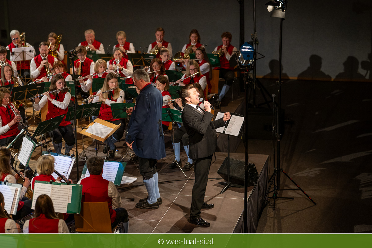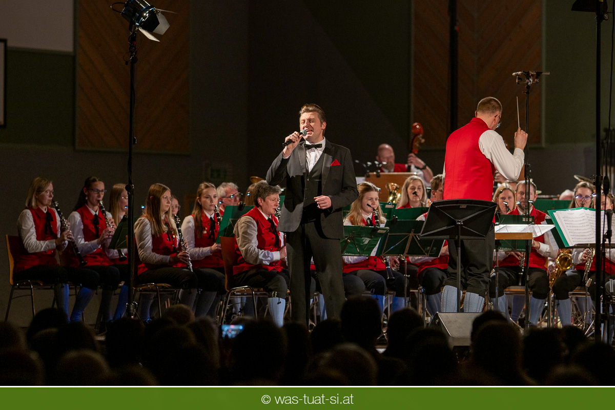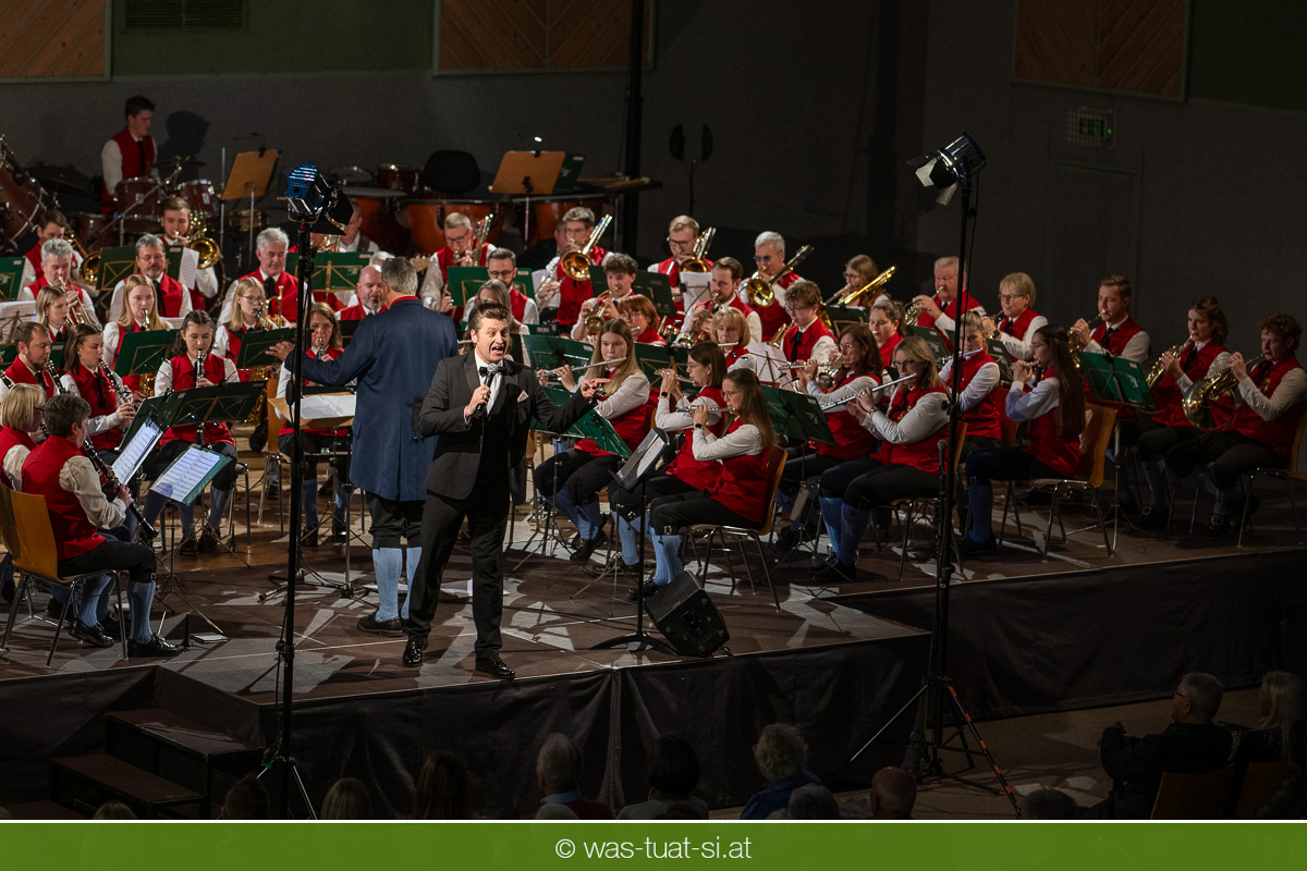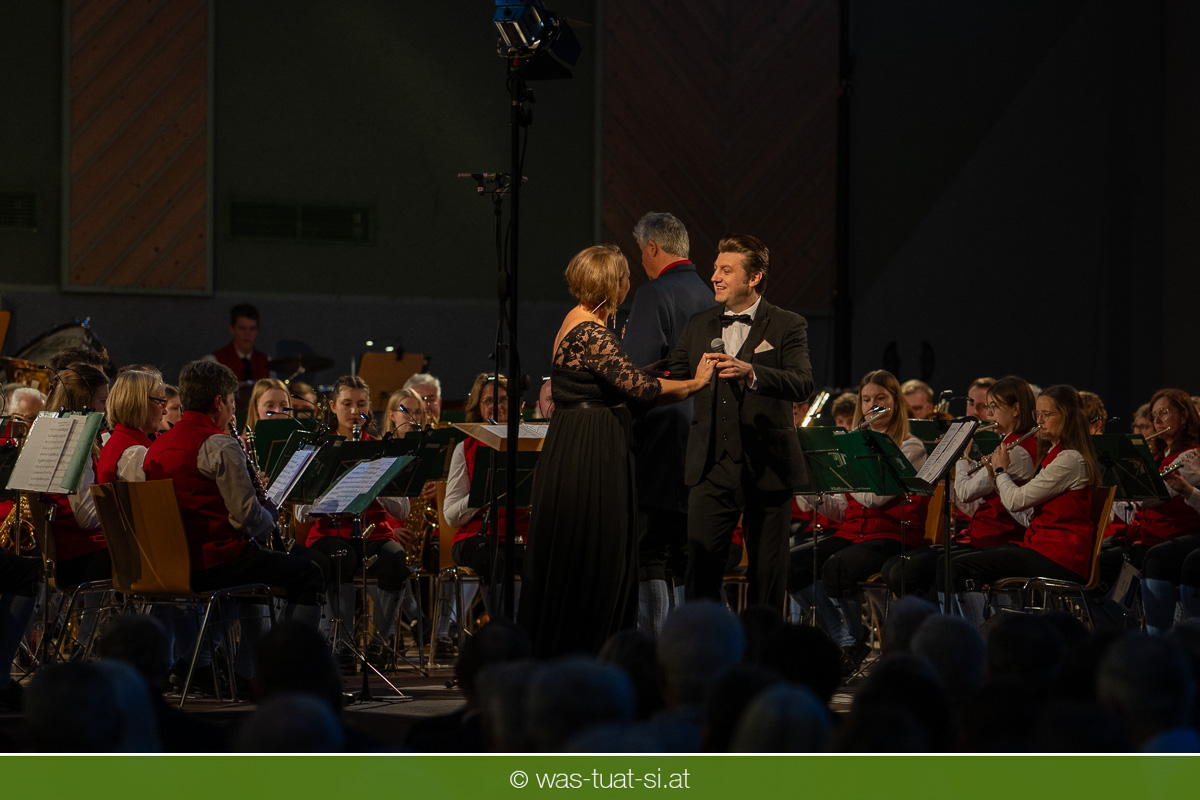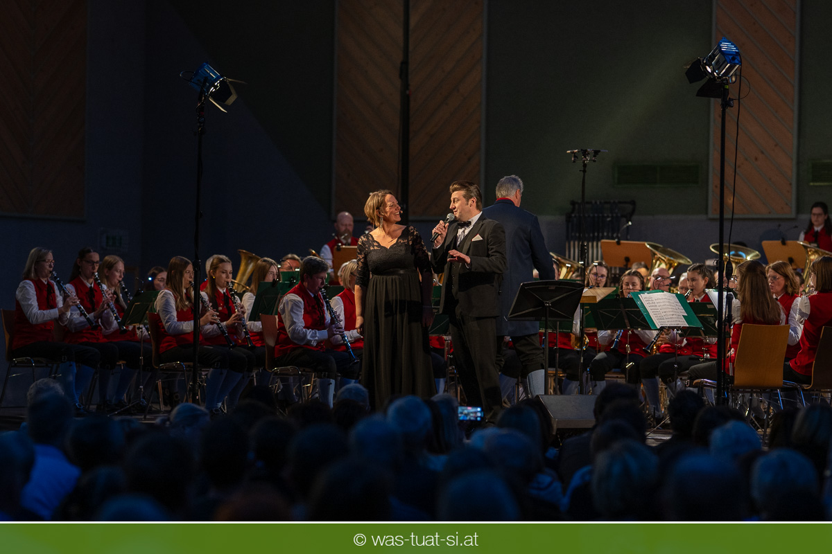 Die beiden Kapellmeister Martin und Christian Dumphart spannten mit ihren 83 Musikern dabei einen abwechlungsreichen musikalischen Spannungsbogen: Bekannte Melodien aus dem Genre der Operette fehlten ebensowenig wie besondere Walzer und Polkas. Speziell im Fokus standen zum Jahresstart aber Schlagermelodien von Peter Alexander und Udo Jürgens: Ehemalige „Gassenhauer“ wie „Hier ist ein Mensch“ oder „Bitte mit Sahne“ nahmen das Publikum auf eine Zeitreise in das goldene Zeitalter des Radios und der Langspielplatten mit. Als „Reiseleiter“ fungierten dabei die beiden Solisten Carina Hohner und Nik Raspotnik, die mit gesanglicher Brillanz, Charme und Esprit zu begeistern vermochten.