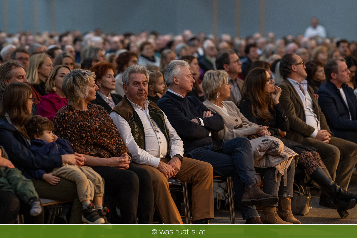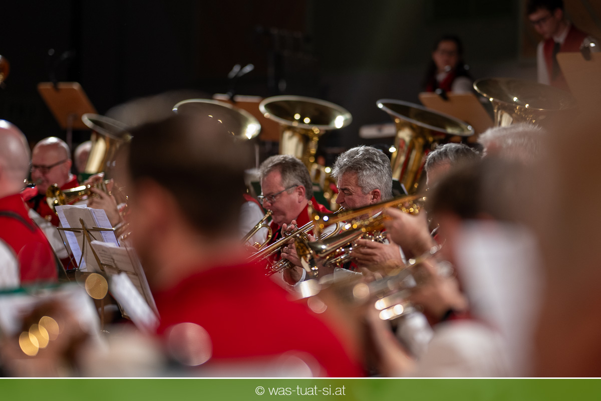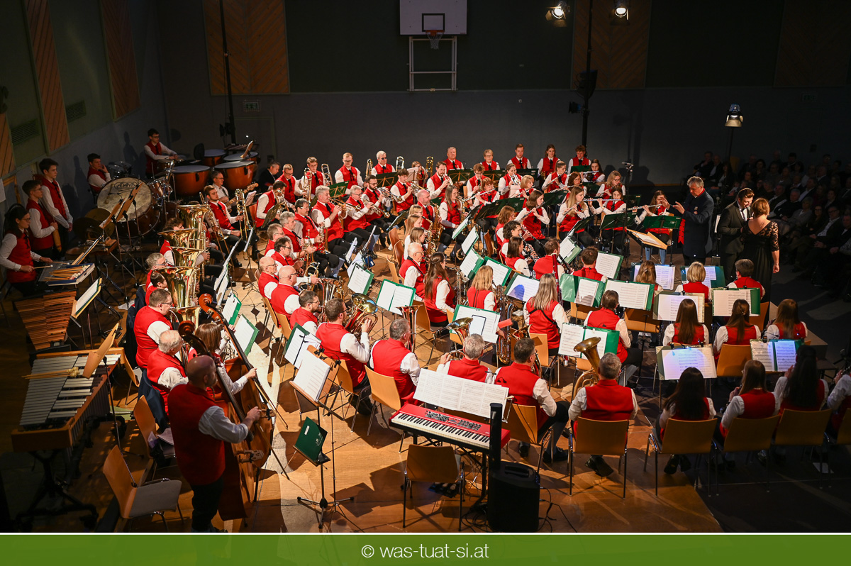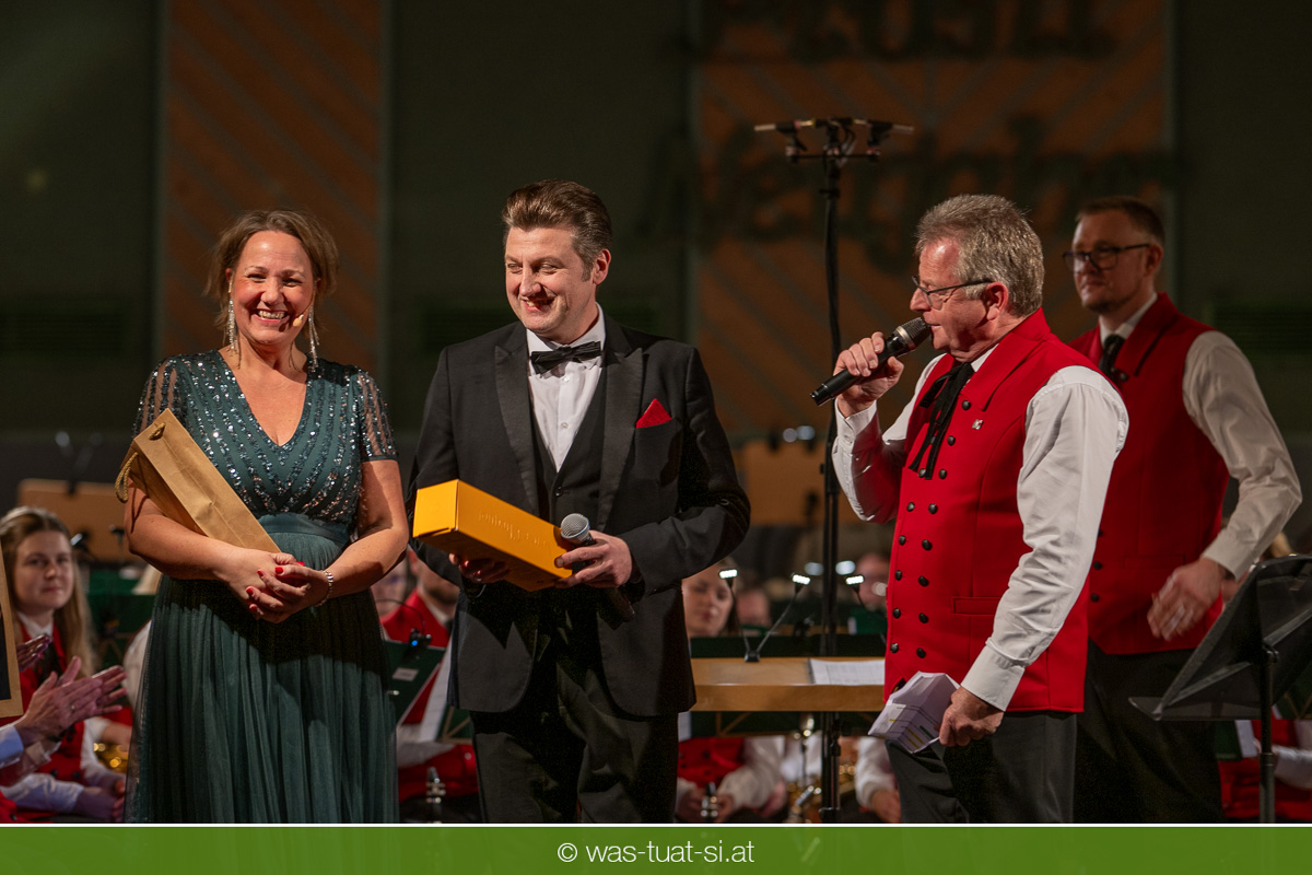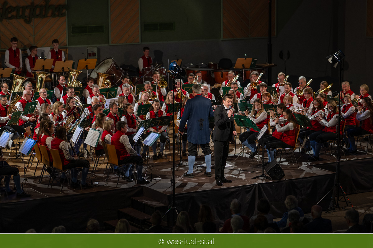 Die beiden Kapellmeister Martin und Christian Dumphart spannten mit ihren 83 Musikern dabei einen abwechlungsreichen musikalischen Spannungsbogen: Bekannte Melodien aus dem Genre der Operette fehlten ebensowenig wie besondere Walzer und Polkas. Speziell im Fokus standen zum Jahresstart aber Schlagermelodien von Peter Alexander und Udo Jürgens: Ehemalige „Gassenhauer“ wie „Hier ist ein Mensch“ oder „Bitte mit Sahne“ nahmen das Publikum auf eine Zeitreise in das goldene Zeitalter des Radios und der Langspielplatten mit. Als „Reiseleiter“ fungierten dabei die beiden Solisten Carina Hohner und Nik Raspotnik, die mit gesanglicher Brillanz, Charme und Esprit zu begeistern vermochten.