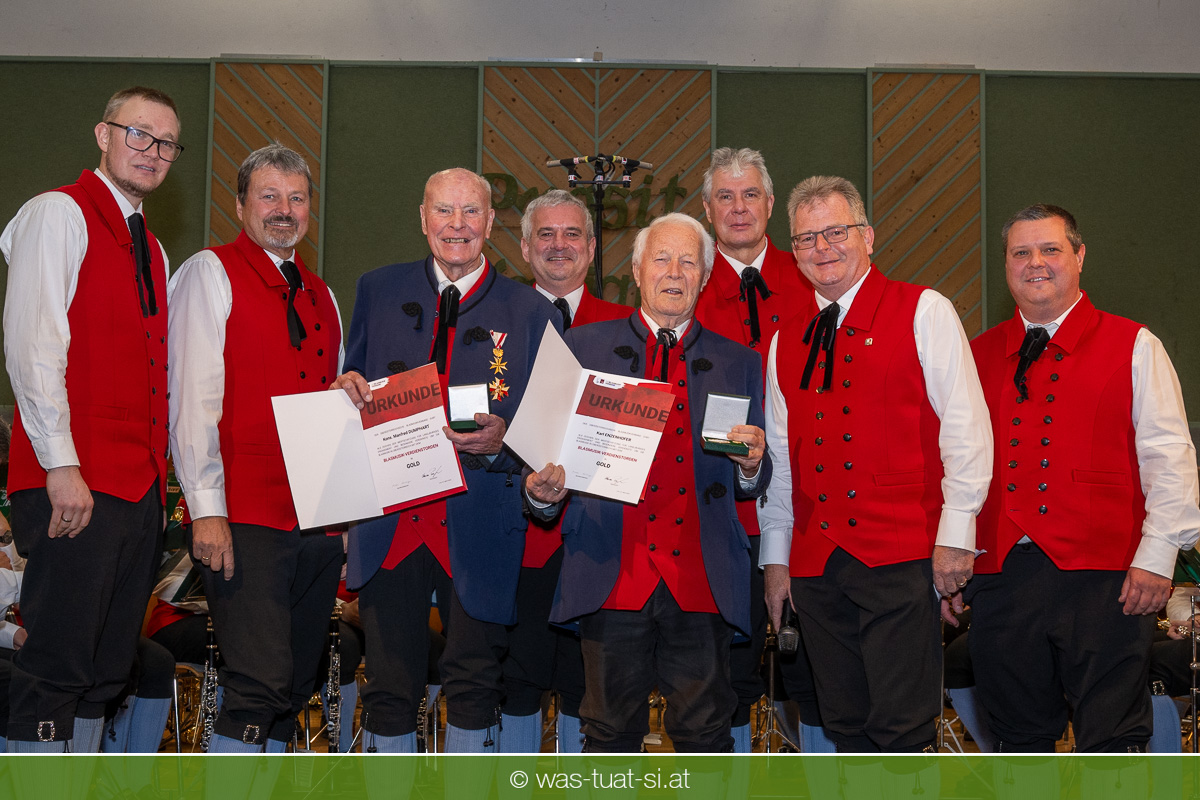 Passend zu den mit „Standing Ovation“ bedachten Schlager-Legenden holten Musikvereinsobmann Wolfgang Hochreiter und Moderatorin Teresa Kaltenberger zwei Leonfeldner Musikerlegenden zu einer besonderen Ehrung auf die Bühne: Ehrenkapellmeister Konsulent Manfred Dumphart und „Vollblutmusiker“ Karl Enzenhofer – er ist inzwischen 90 Jahre alt – wurden für ihre großen Verdienste mit dem Blasmusikverdienstorden in Gold bedacht.