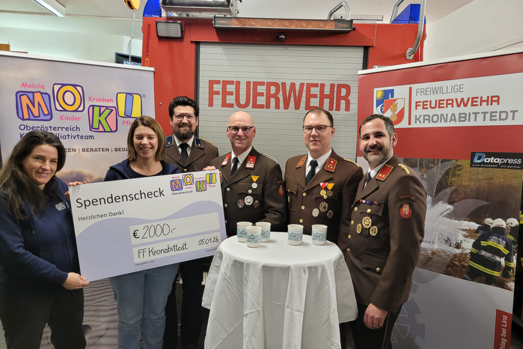 Der zweite Adventssonntag steht bei der FF Kronabittedt alljährlich im Zeichen der Nächstenliebe: Der Gewinn und die Spenden des von der Retro-Gruppe der Feuerwehr organisierten Punschstandes wird für soziale Zwecke verwendet. So konnte eine Spende in der Höhe von € 2.000,00 an MOKI OÖ (Mobile Kinderkrankenpflege) übergeben werden. MOKI Oberösterreich ist eine Non-Profit Organisation und Anbieter von mobiler Hauskrankenpflege für Kinder und Jugendliche in Oberösterreich. Diese hat es sich zur Mission gemacht, Kinder dort zu pflegen, wo sie sich geborgen fühlen. Josef Madlmeir, Gruppenkdt. Retro-Gruppe: „Wir freuen uns, mit dem jährlichen Punschstand Freude zu teilen und Unterstützung zu ermöglichen.“ Diese Aktion zeigt eindrucksvoll, wie Gemeinschaftssinn und Engagement soziale Unterstützung bringen. Herzlichen Dank für Ihren Besuch des erwähnten Punschstandes im Feuerwehrhaus Kronabittedt.