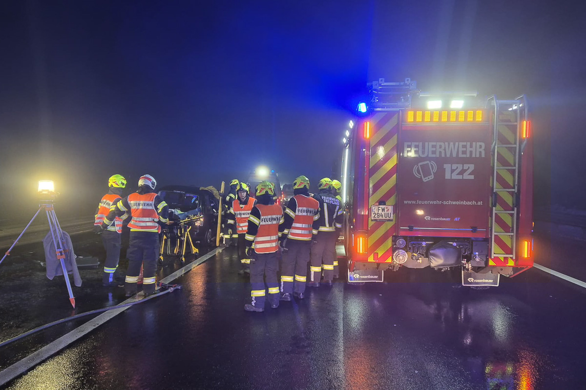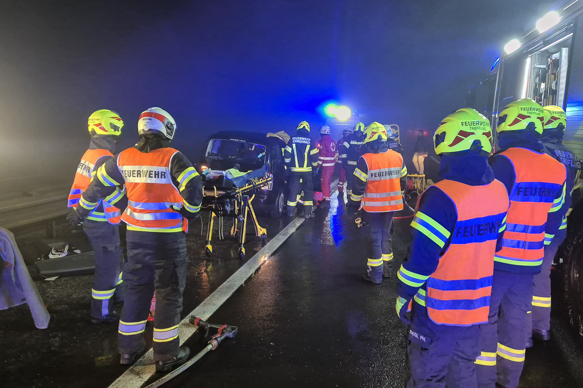 Im dichten Nebel kam es zu einem Auffahrunfall. Der Lenker des vorausfahrenden Fahrzeugs war eingeklemmt und wurde gemeinsam mit der FF Treffling mittels schwerem hydraulischem Rettungsgerät über eine große Seitenöffnung aus dem Fahrzeug gerettet und anschließend dem Roten Kreuz zur weiteren Versorgung übergeben. Danach wurde die Unfallstelle geräumt.