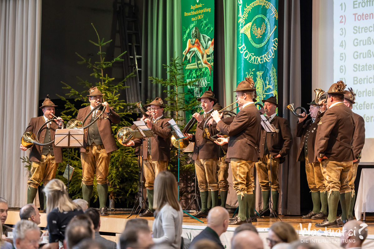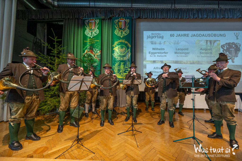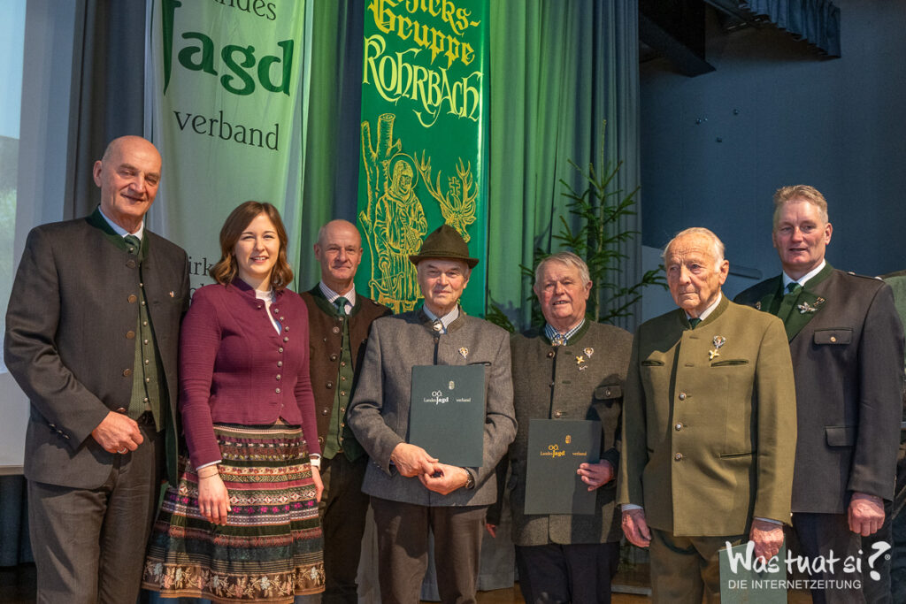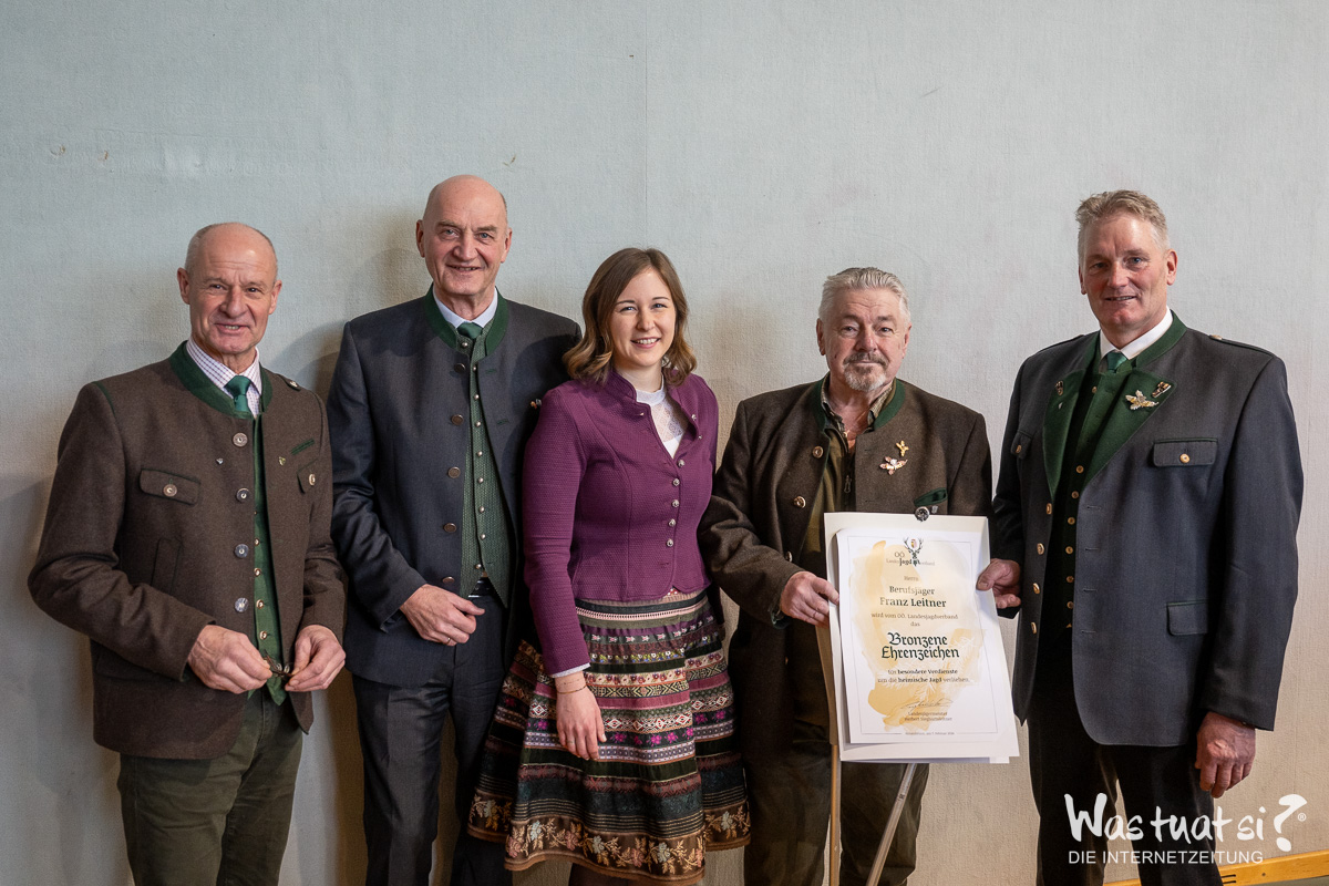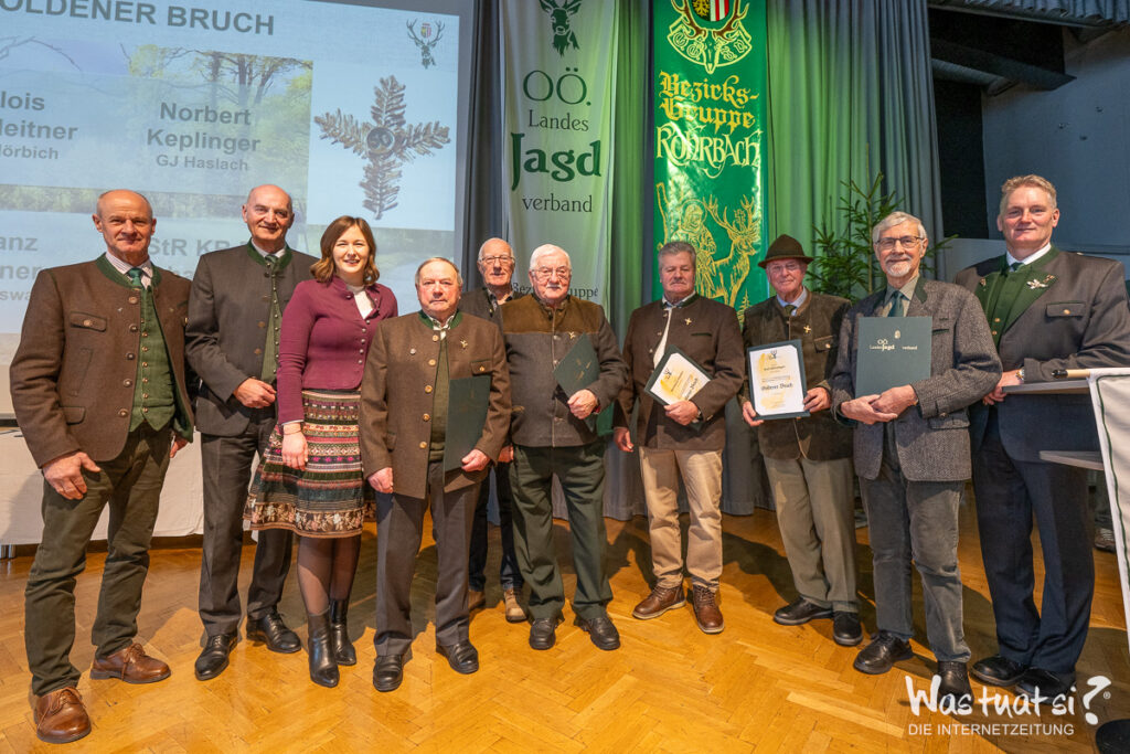 Mit einer ganz besonderen Auszeichnung wurde Berufsjäger Franz Leitner geehrt, dem bronzenen Ehrenzeichen des OÖ Landesjagdverbandes für seine langjährigen Verdienste in der heimischen Jagd. 6 Goldene Brüche für 50 Jahre aktive Jagdausübung und 5 für 60 Jahre konnten heuer vergeben werden. Die Rebhuhnnadel für vorbildliche Lebensraumgestaltung wurde an Mag. Christian Deschka verliehen. Raubwildnadel an Franz Lepschy und Christian Rammerstorfer. Viele Ehrungen gab es auch für die aktiven Jagdhornbläser der 3 Gruppen. Die JHBG Ulrichsberg feierte ihr 35 jähriges Bestandsjubiläum.