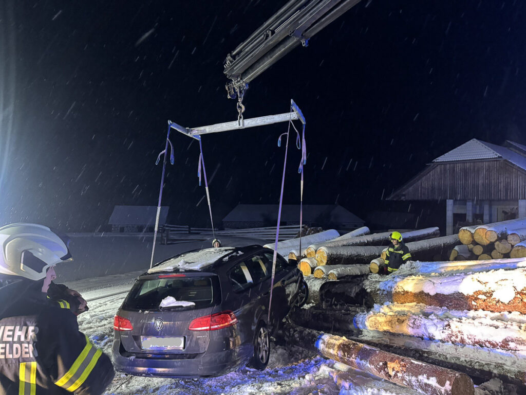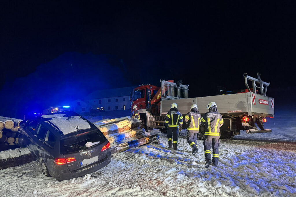 Die Freiwillige Feuerwehr Vorderweißenbach wurde gegen 18:30 Uhr zu einer PKW-Bergung alarmiert. Ein Fahrzeug war aufgrund der glatten Fahrbahn von der Straße abgekommen und in einen neben der Fahrbahn gelagerten Holzstapel geprallt.
