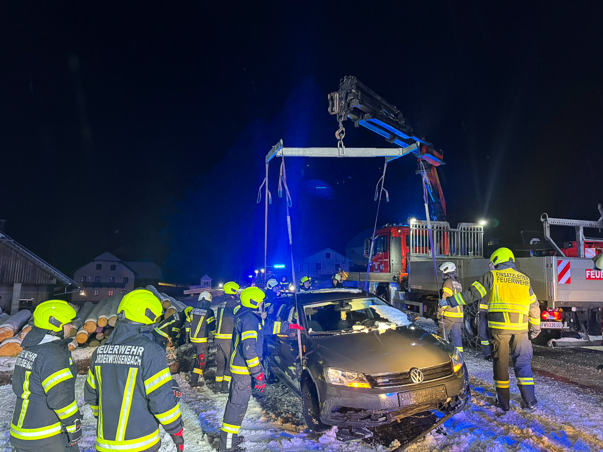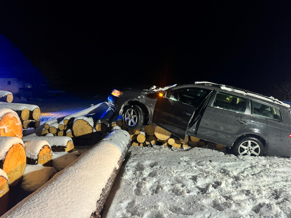 Die Freiwillige Feuerwehr Vorderweißenbach wurde gegen 18:30 Uhr zu einer PKW-Bergung alarmiert. Ein Fahrzeug war aufgrund der glatten Fahrbahn von der Straße abgekommen und in einen neben der Fahrbahn gelagerten Holzstapel geprallt.