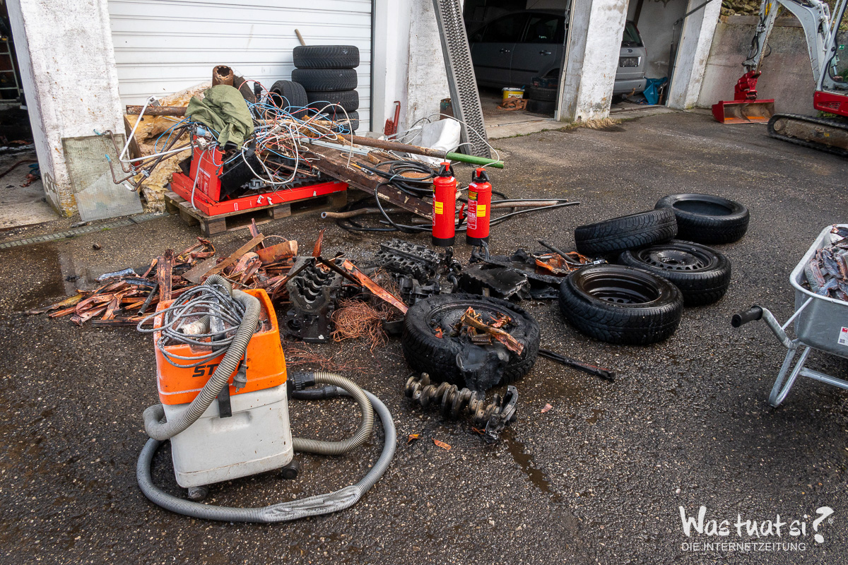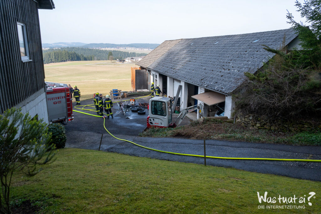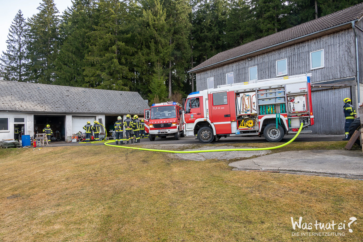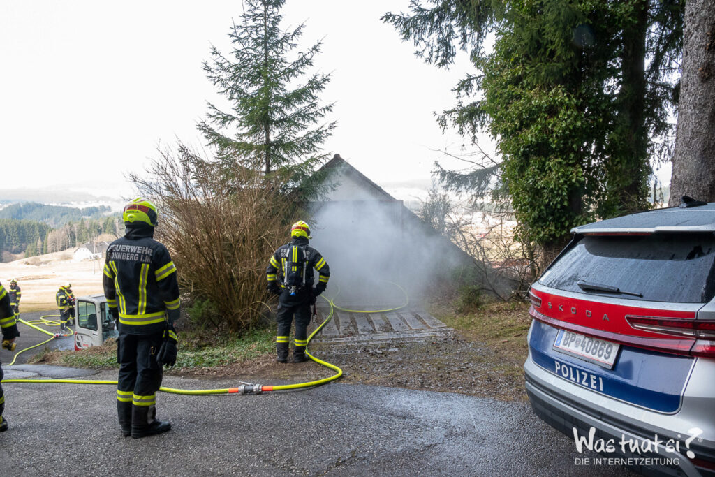 Aus bislang ungeklärter Ursache brach während Arbeiten in einer Garage ein Brand aus. Dabei begannen Autoreifen bereits zu schmelzen, was zu einer starken Rauchentwicklung führte.