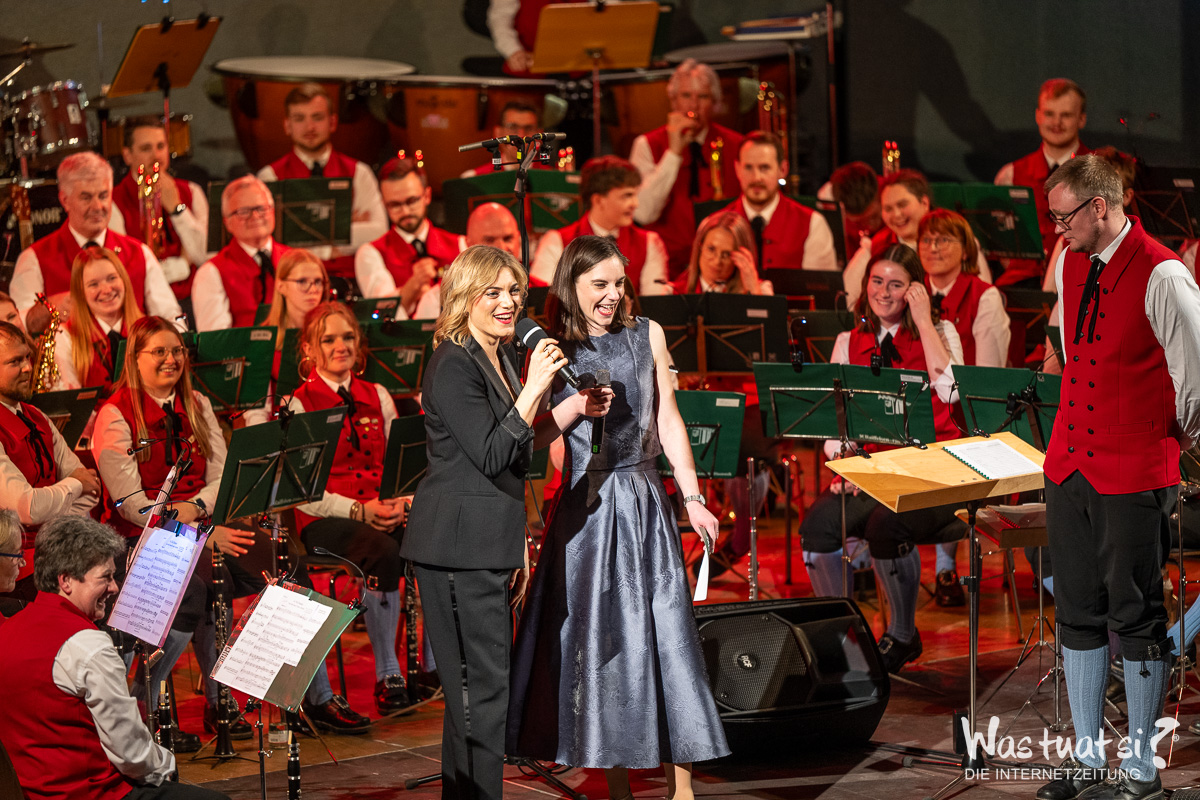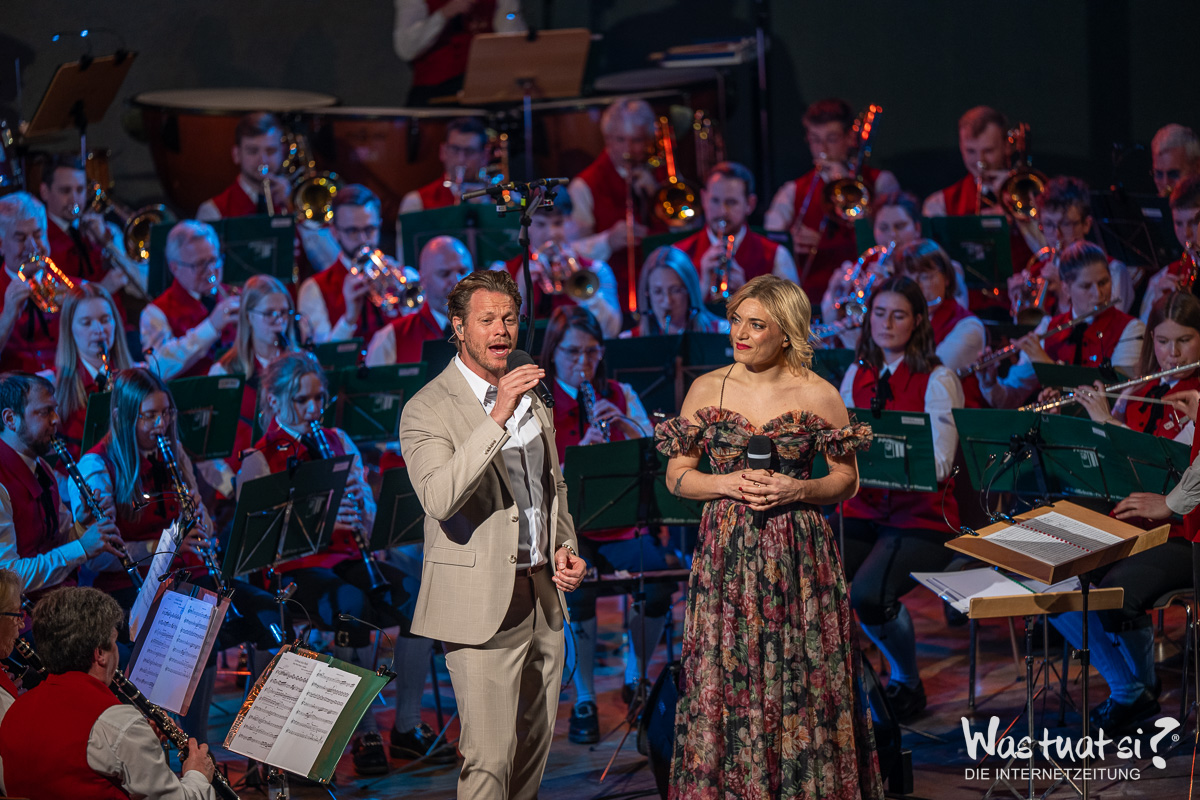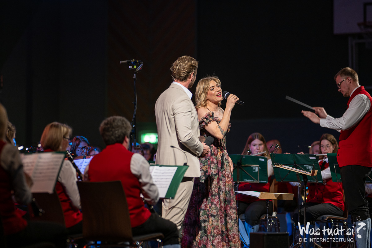 Die beiden Topstars – Valentini war für die kurzfristig erkrankte Daniela Dett eingesprungen – nahmen das Publikum zu einer Reise in die Welt zahlreicher Musicalklassiker mit: Bekannte Melodien aus dem „Tanz der Vampire“, „My Fair Lady“ und „Chicago“ fehlten in dem anspruchsvollen Programm ebenso wenig wie ein ganzer Block aus dem Welthit „Elisabeth“. Die beiden Solisten überzeugten mit Stimme und durch ihre Bühnenpräsenz – und zeigten sich ihrerseits von der Begleitung durch die Leonfeldner Musiker begeistert: Die von Martin und Christian Dumphart geleitete Trachtenmusikkapelle stellte dabei nicht nur ihr herausragendes musikalisches Niveau unter Beweis, sondern verschaffte den beiden Musicalstars auch ein besonderes Debüt: Für beide war es trotz ihrer internationalen Karrieren das erste Mal, dass sie mit einem fast 90 Aktive umfassenden Blasorchester auf der Bühne standen.