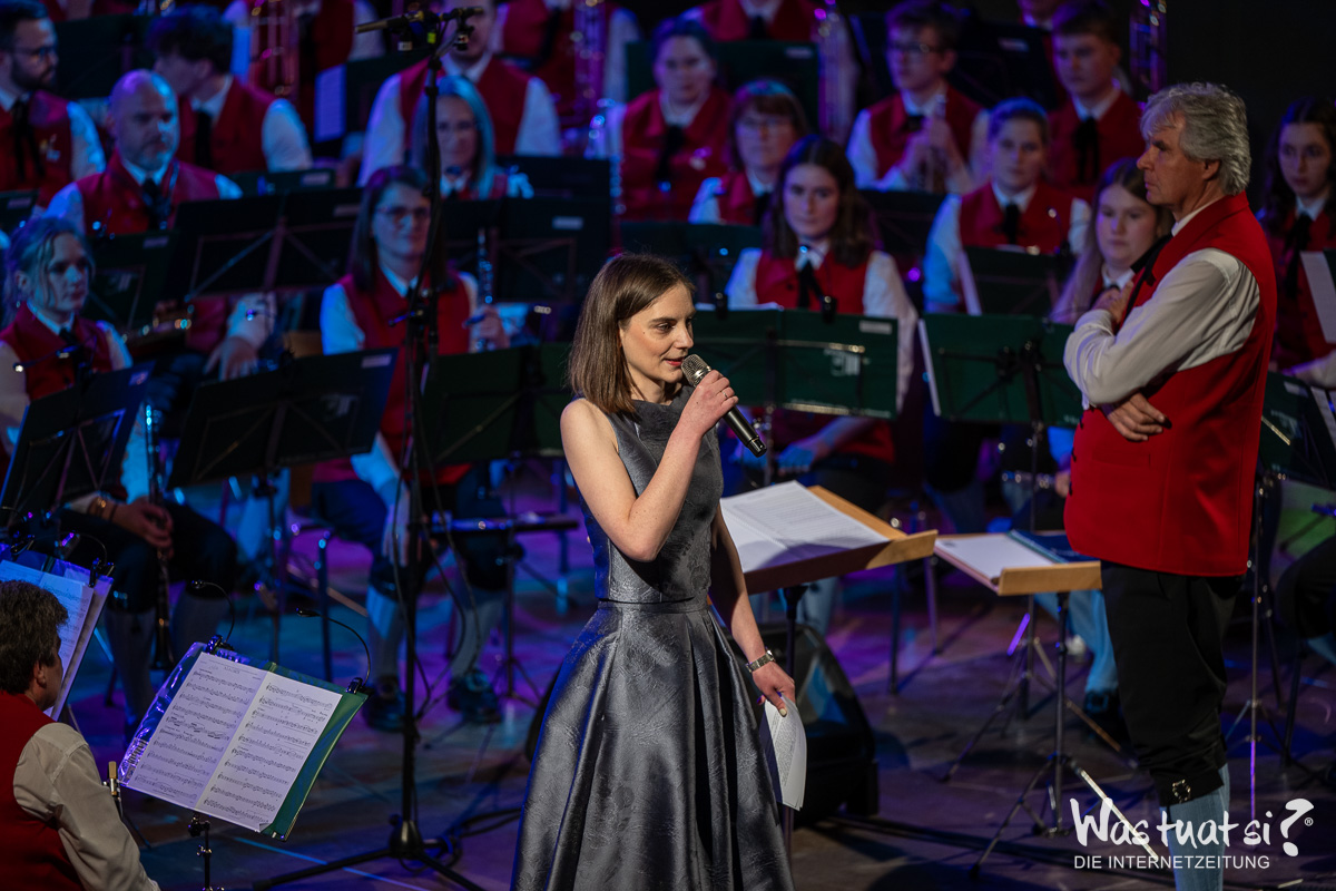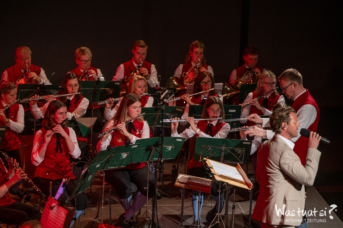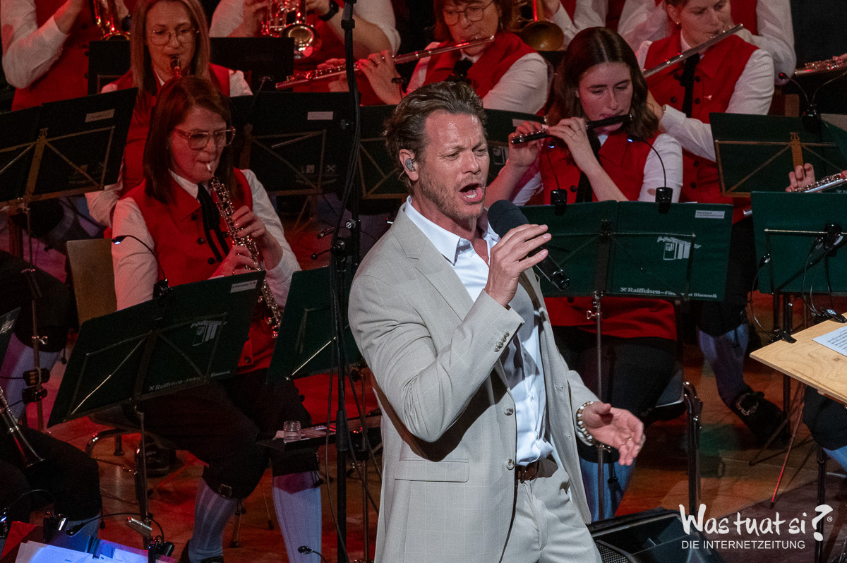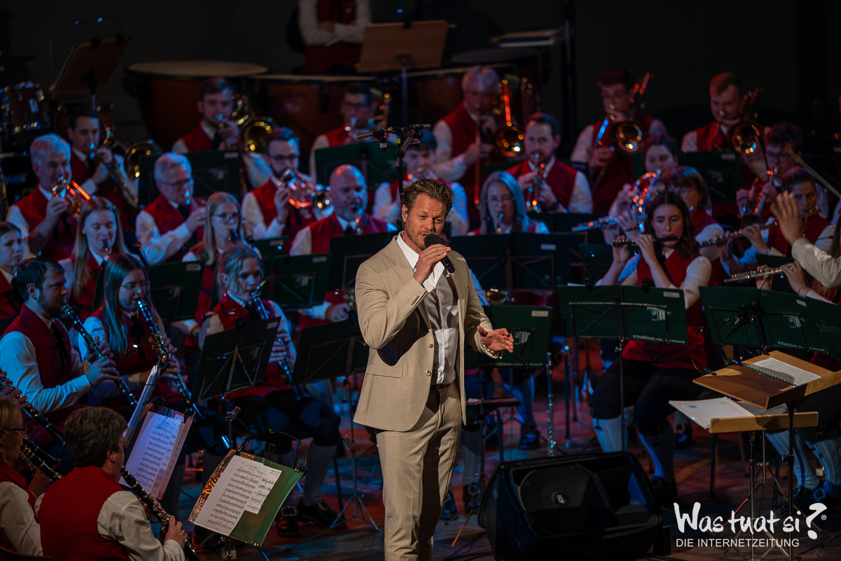 Die beiden Topstars – Valentini war für die kurzfristig erkrankte Daniela Dett eingesprungen – nahmen das Publikum zu einer Reise in die Welt zahlreicher Musicalklassiker mit: Bekannte Melodien aus dem „Tanz der Vampire“, „My Fair Lady“ und „Chicago“ fehlten in dem anspruchsvollen Programm ebenso wenig wie ein ganzer Block aus dem Welthit „Elisabeth“. Die beiden Solisten überzeugten mit Stimme und durch ihre Bühnenpräsenz – und zeigten sich ihrerseits von der Begleitung durch die Leonfeldner Musiker begeistert: Die von Martin und Christian Dumphart geleitete Trachtenmusikkapelle stellte dabei nicht nur ihr herausragendes musikalisches Niveau unter Beweis, sondern verschaffte den beiden Musicalstars auch ein besonderes Debüt: Für beide war es trotz ihrer internationalen Karrieren das erste Mal, dass sie mit einem fast 90 Aktive umfassenden Blasorchester auf der Bühne standen.