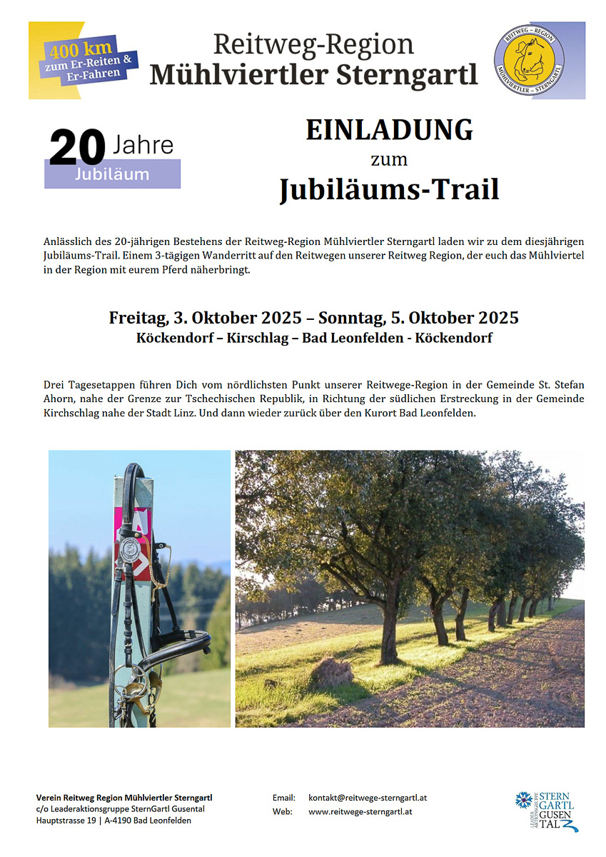 Anlässlich des 20-jährigen Bestehens der Reitweg-Region Mühlviertler Sterngartl laden wir zu dem diesjährigen Jubiläums-Trail. Einem 3-tägigen Wanderritt auf den Reitwegen unserer Reitweg Region, der euch das Mühlviertel in der Region mit eurem Pferd näherbringt.