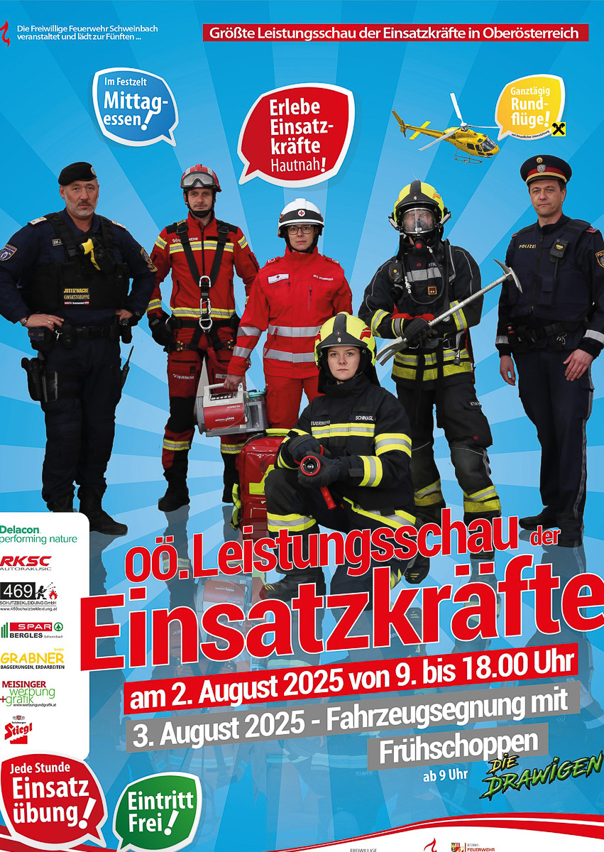 Die Freiwillige Feuerwehr Schweinbach veranstaltet heuer zum fünften Mal die größte OÖ. Leistungsschau der Einsatzkräfte – und heute dürfen wir euch erstmals das offizielle Plakat präsentieren!