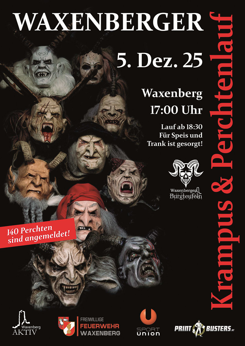 Am 5. Dezember 2025 findet der 3. Krampus- und Perchtenlauf der Waxenberger Burgteufeln statt. 7 Gruppen mit 140 Engel, Hexen, Krampussen und Perchten werden mit ihren furchterregenden Masken und ihrem ohrenbetäubenden Glockenlärm wieder schaurige Stimmung in Waxenberg verbreiten. Um 17:00 Uhr startet die Veranstaltung, um sich mit kalten oder warmen Getränken und Bratwürstel auf den Lauf einzustimmen, der um 18:30 Uhr startet.