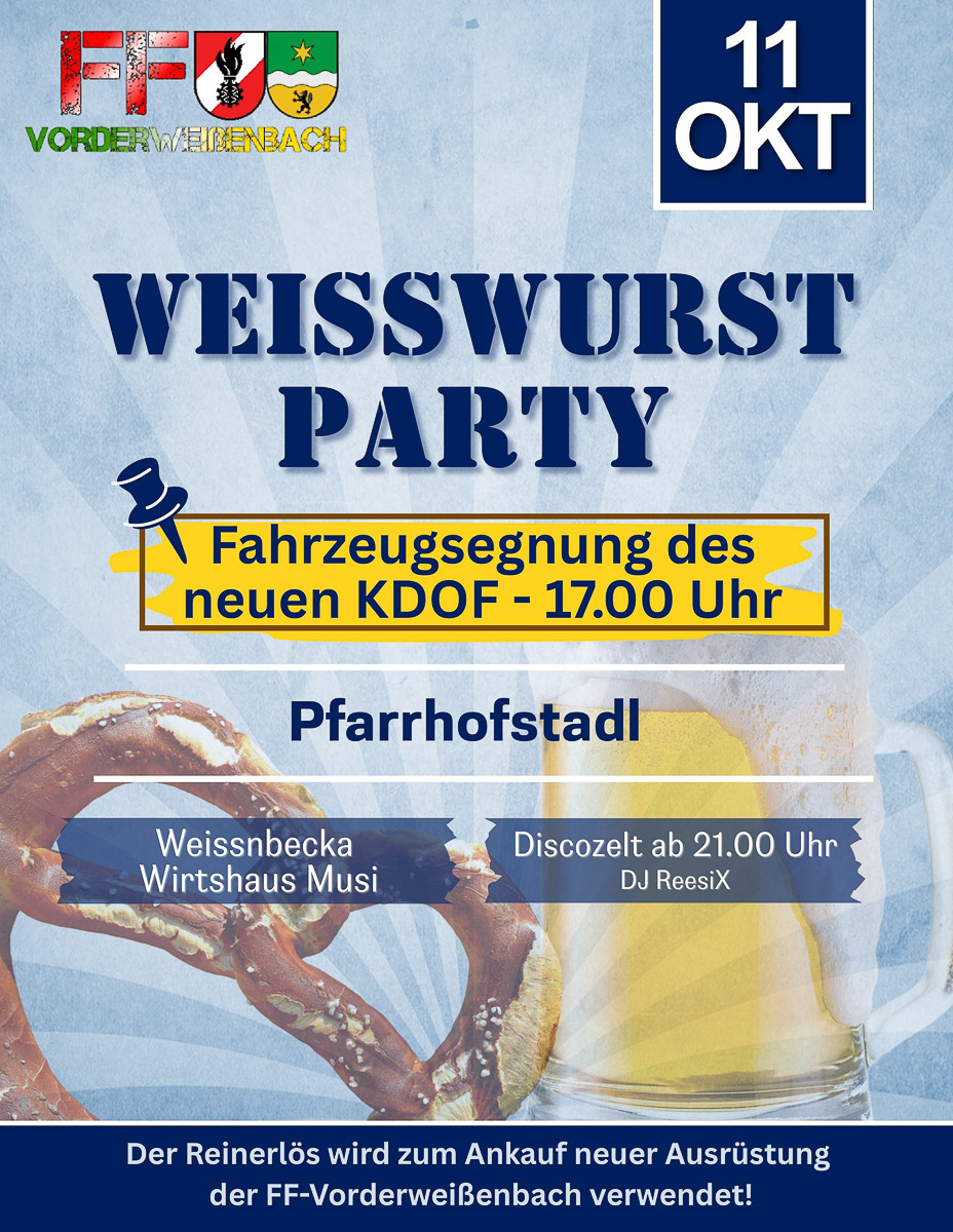 Am 11. Oktober ist es wieder soweit, die FF Vorderweißenbach veranstaltet erneut die Weißwurstparty im Pfarrhofstadl von Vorderweißenbach